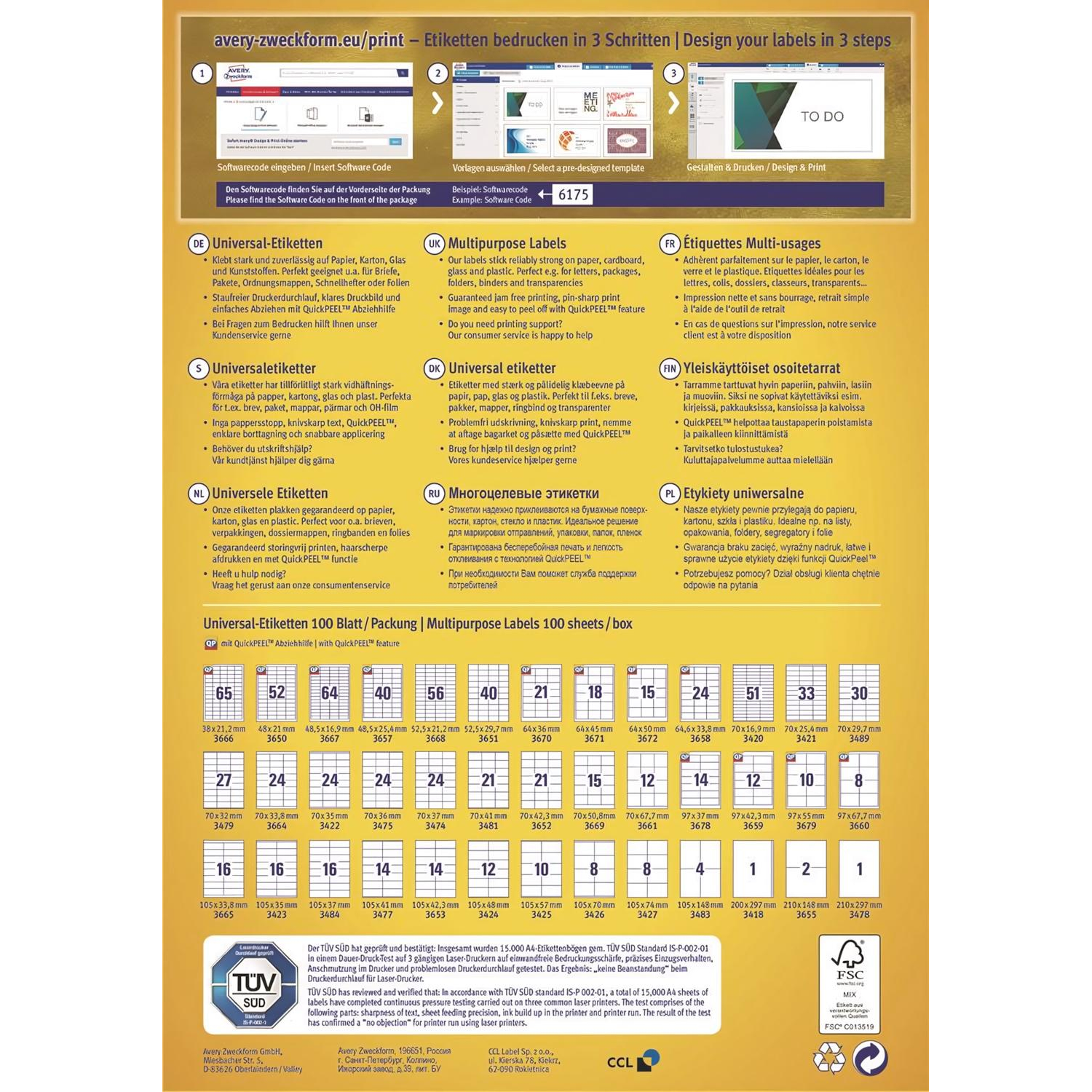 • Гарантированная печать без застревания на лазерных, струйных принтерах и копирах. • Немецкая сертификация TÜV SÜD (Объединение Технического надзора). • Абсолютно точная подача листов в принтер благодаря технологии ultragrip на обратной стороне листа • Экстра четкий отпечаток текста и изображения без размытия на любом принтере • Улучшенный клей: крепкое и надежное приклеивание к бумаге, картону, стеклу, пластику. • Фирменное, свободно распространяемое, программное обеспечение и шаблоны для создания и печати самоклеющейся бумаги на принтере