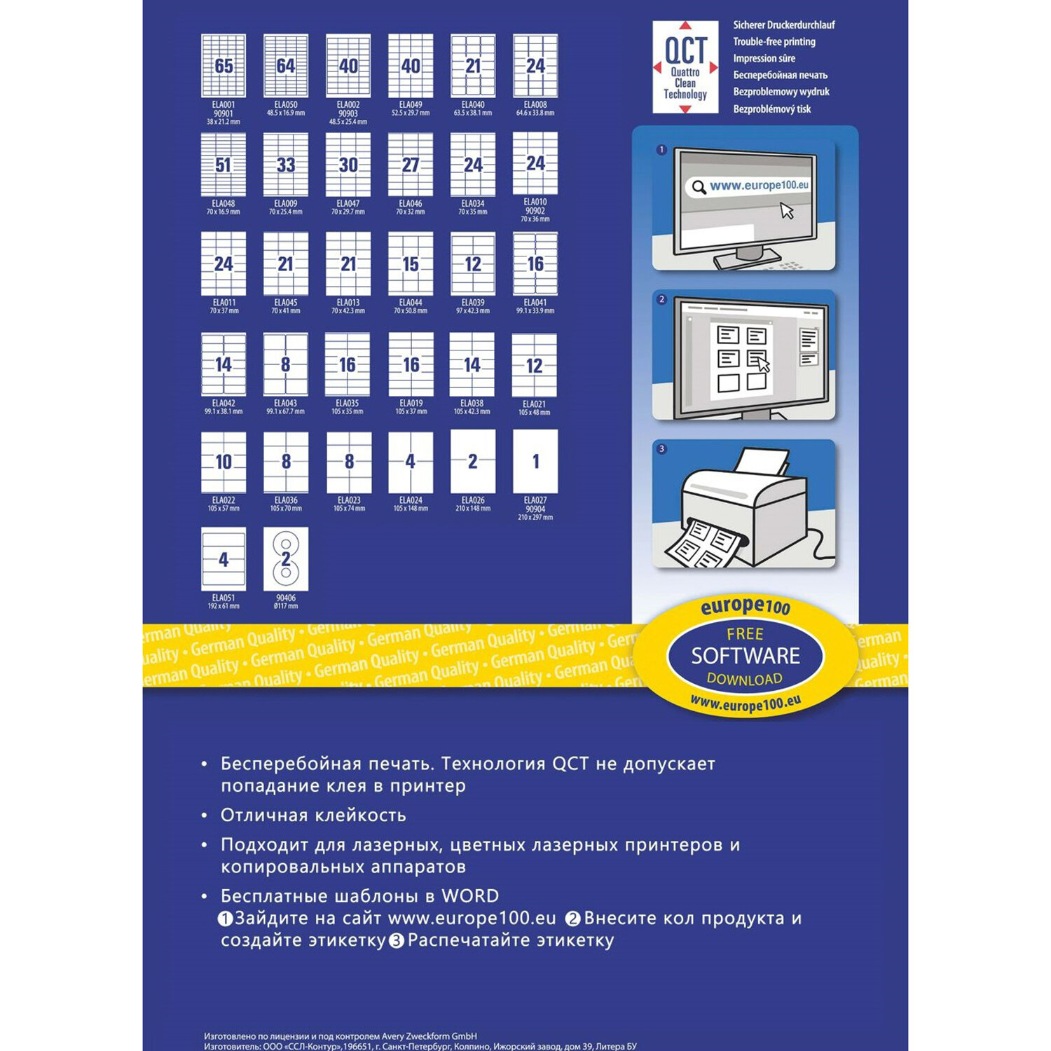 Самоклеящиеся матовые этикетки ТМ Europe 100 производства Avery Zweckform имеют размер 21×29,7 см (формат А4), изготовлены из бумаги белого цвета. Упаковка содержит 100 штук. Диапазон применения широк: от наклеек на конверты до маркировки на производстве. Этикетки оформляются и распечатываются в нужном количестве самостоятельно. Совместимы с лазерными и струйными принтерами и многофункциональными устройствами любой марки. Гарантированное качество печати благодаря новой структуре бумаги и технологии, исключающей загрязнение аппаратуры частицами клея. Возможность переклеивания отсутствует.
