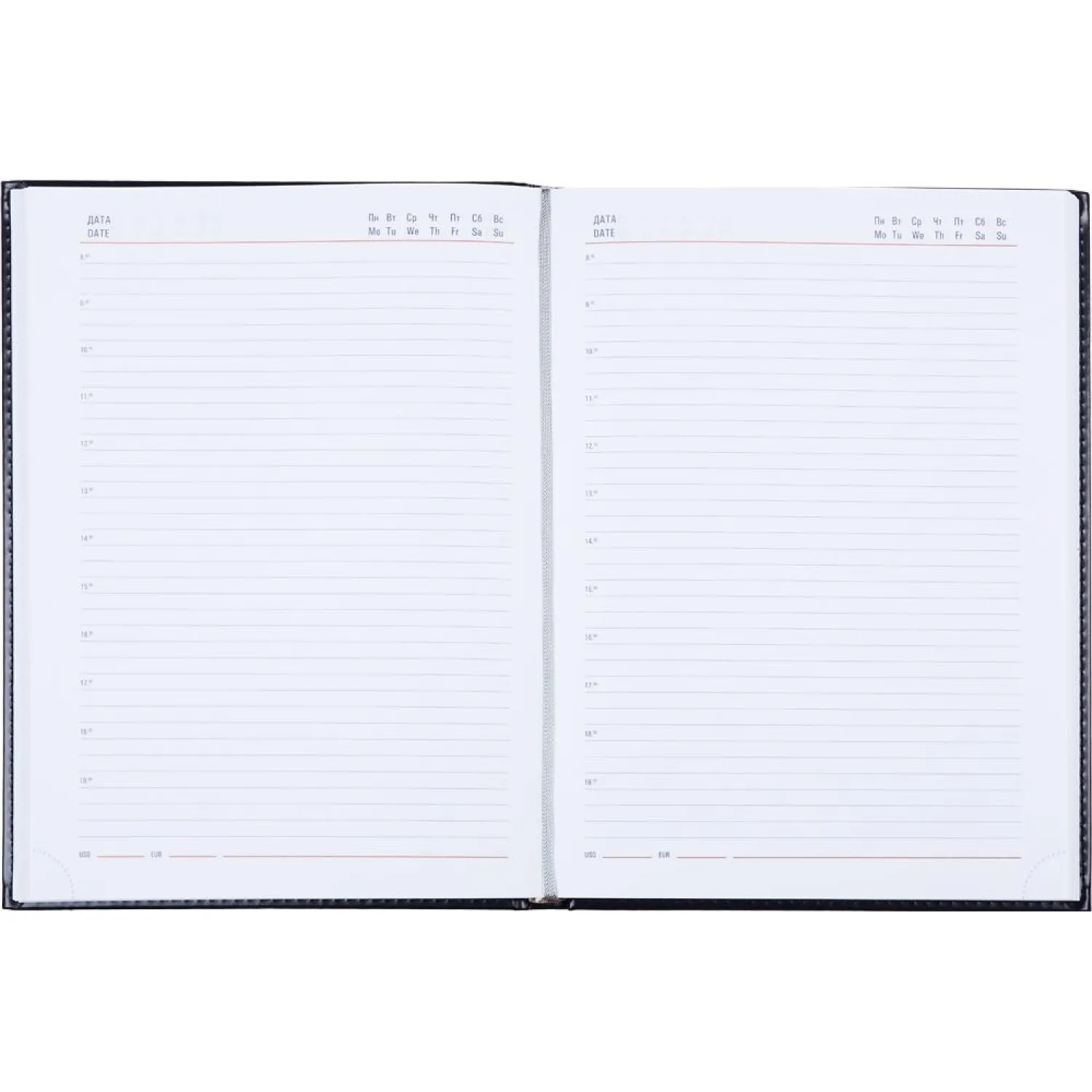 Внутренний блок состоит из 176 листов белой офсетной бумаги плотностью 90 г/кв.м. Листы с линейкой напечатаны в одну краску. Ежедневник оснащён перфорацией уголков и удобной закладкой-ляссе.