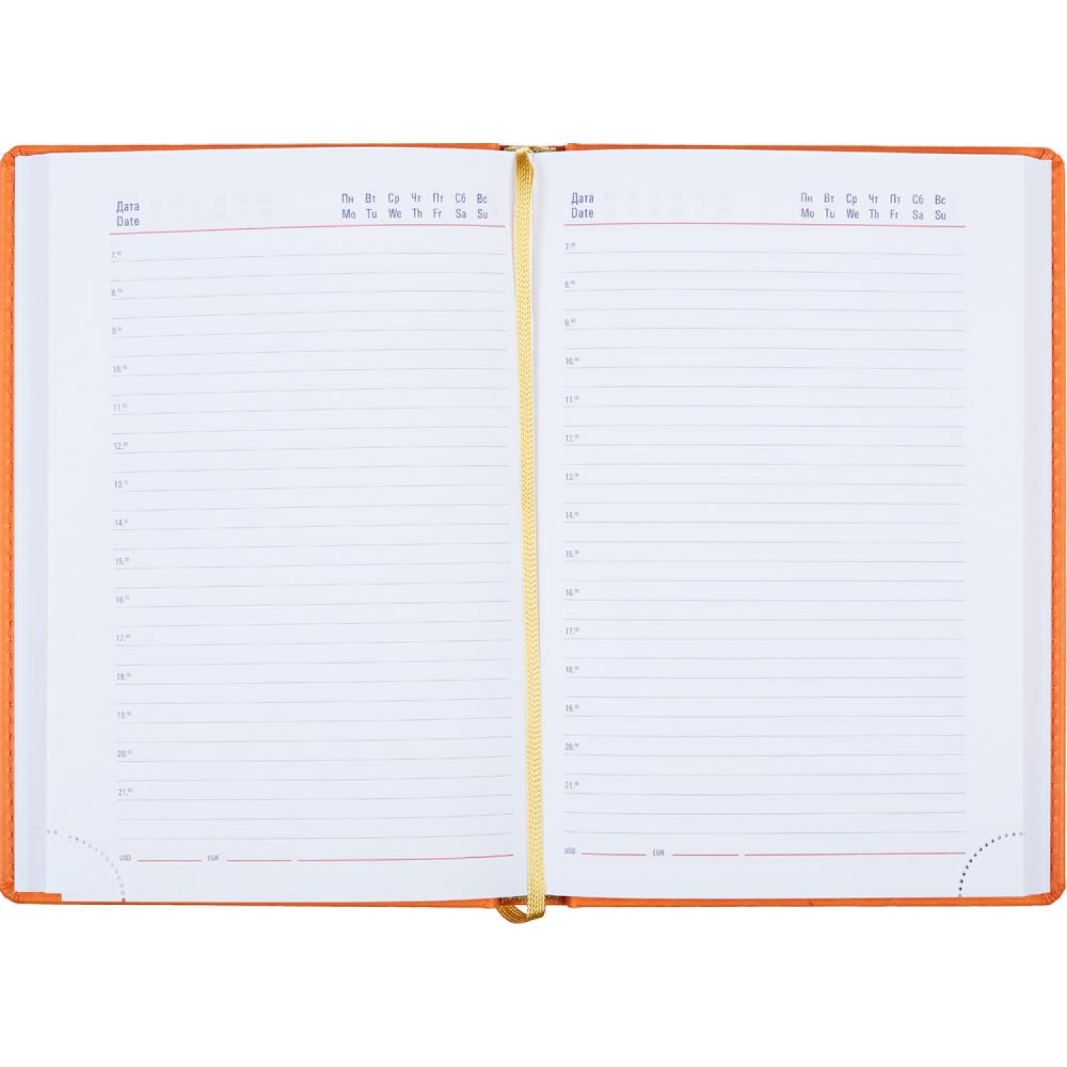 Ежедневник размером 143×210 мм выполнен в традиционном стиле с твёрдой однотонной оранжевой обложкой из искусственной кожи высокого качества. По периметру обложки проходит прострочка, придающая изделию аккуратный и завершённый вид. Обложка допускает нанесение логотипа любым способом тиснения — блинт или фольга.