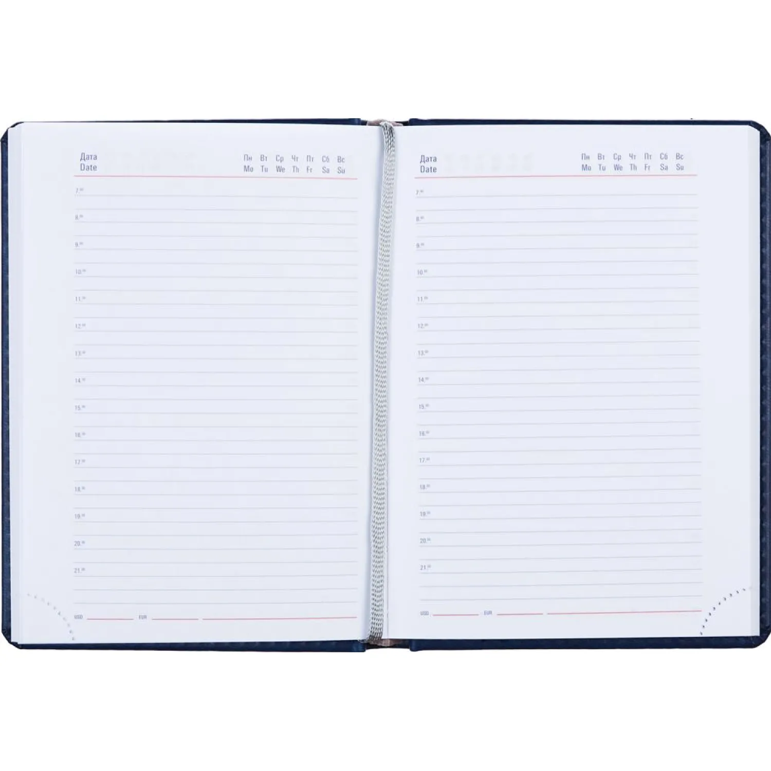 Внутренний блок состоит из 176 листов (352 страниц) белой офсетной бумаги плотностью 90 г/кв.м. Бумага плотная, приятна на ощупь и удобна в работе. Листы с линейкой напечатаны в одну краску. Ежедневник оснащён перфорацией уголков и закладкой-ляссе. На каждую страницу приходится один день недели.