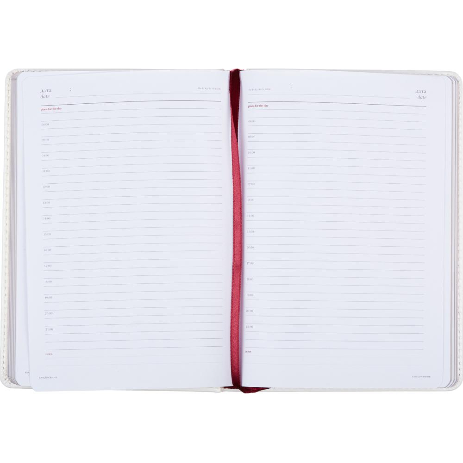 Внутренний блок состоит из 136 листов (272 страницы) белой офсетной бумаги плотностью 90 г/кв.м. и размером 140×200 мм. Срез блокнота имеет позолоту. Печать блока выполнена в два цвета, а страницы имеют линейку для удобства записи. Ляссе бордового цвета позволяет легко найти нужную страницу.
