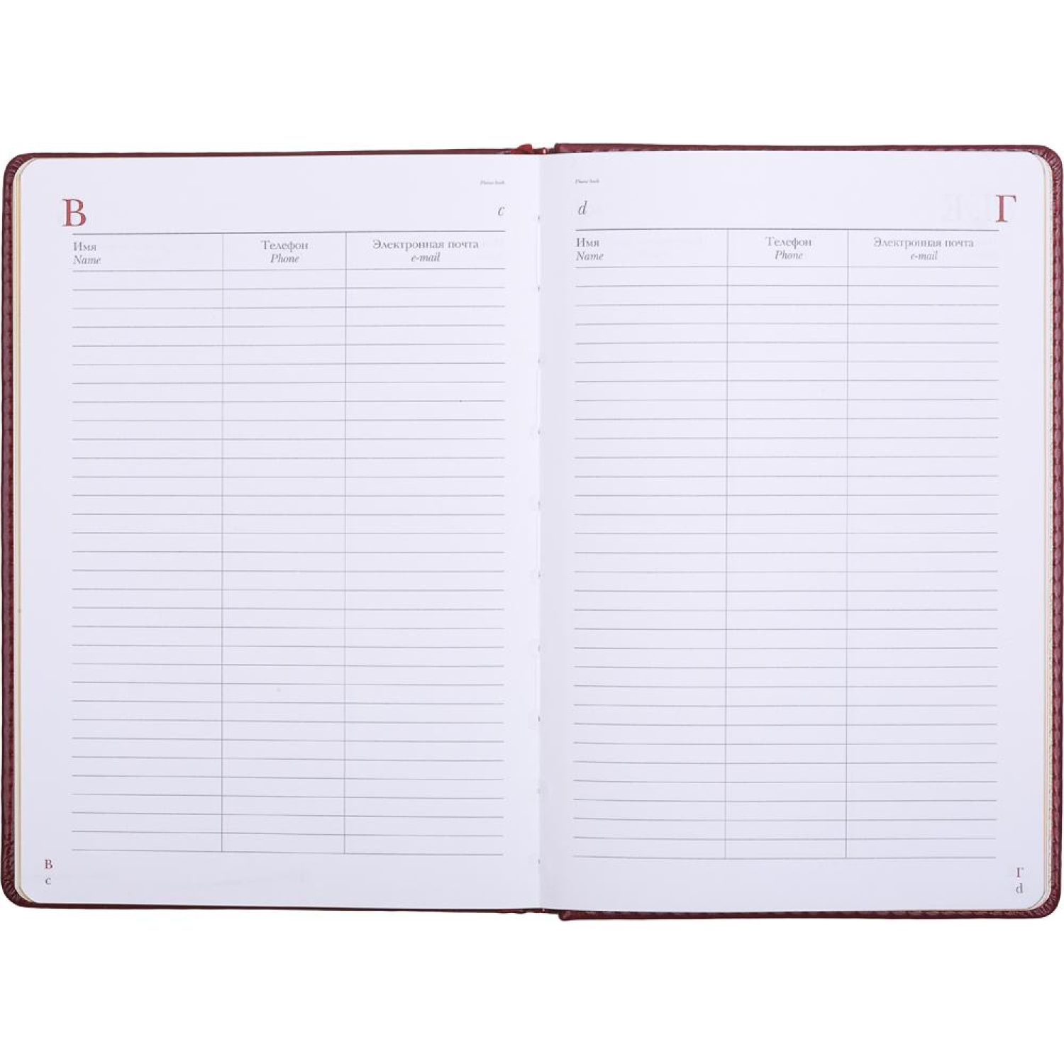 Внутренний блок содержит 136 листов (272 страницы) белой офсетной бумаги плотностью 90 г/кв.м. и размером 140×200 мм. Срез блокнота имеет позолоту, что добавляет дополнительную эстетическую ценность. Печать блока выполнена в два цвета, а страницы имеют линейку. Ляссе бордового цвета помогает легко находить нужные страницы.