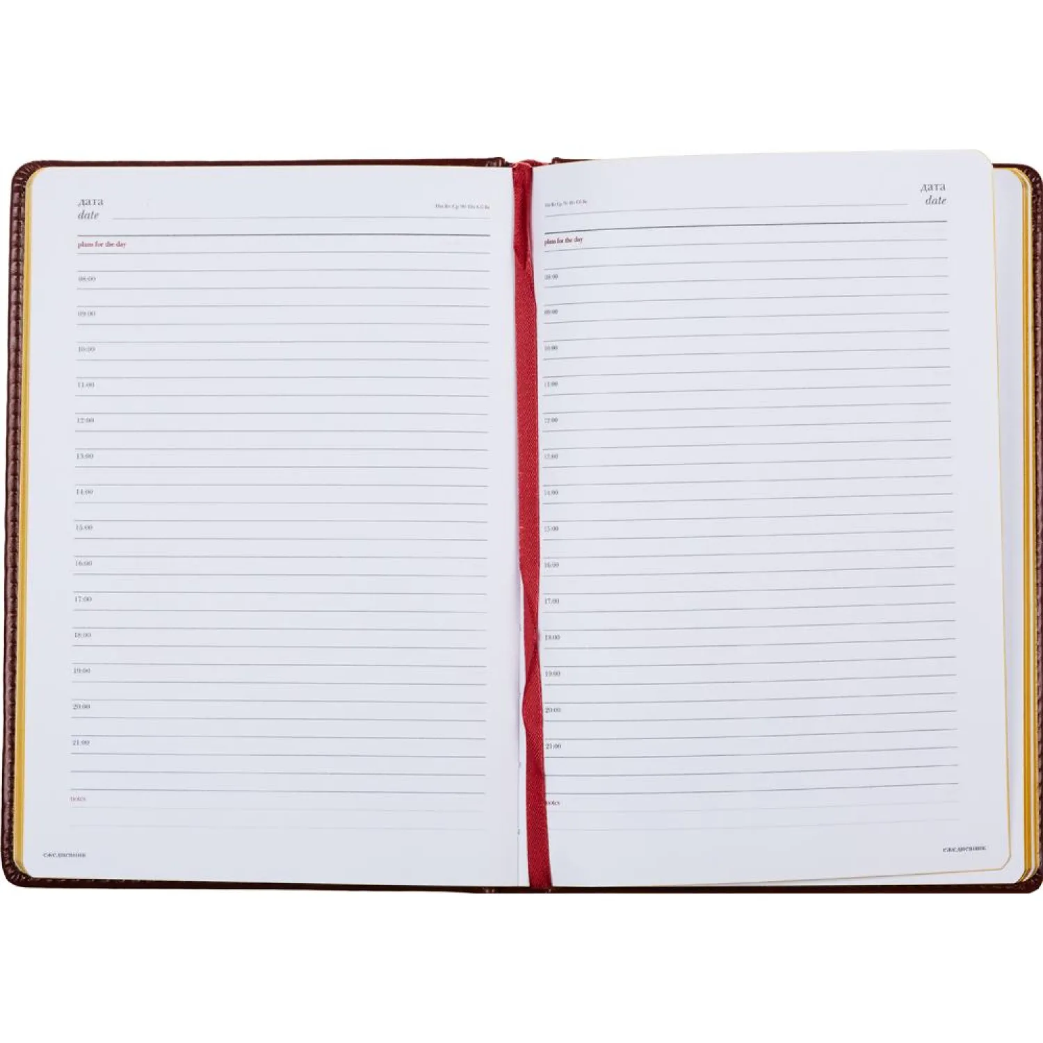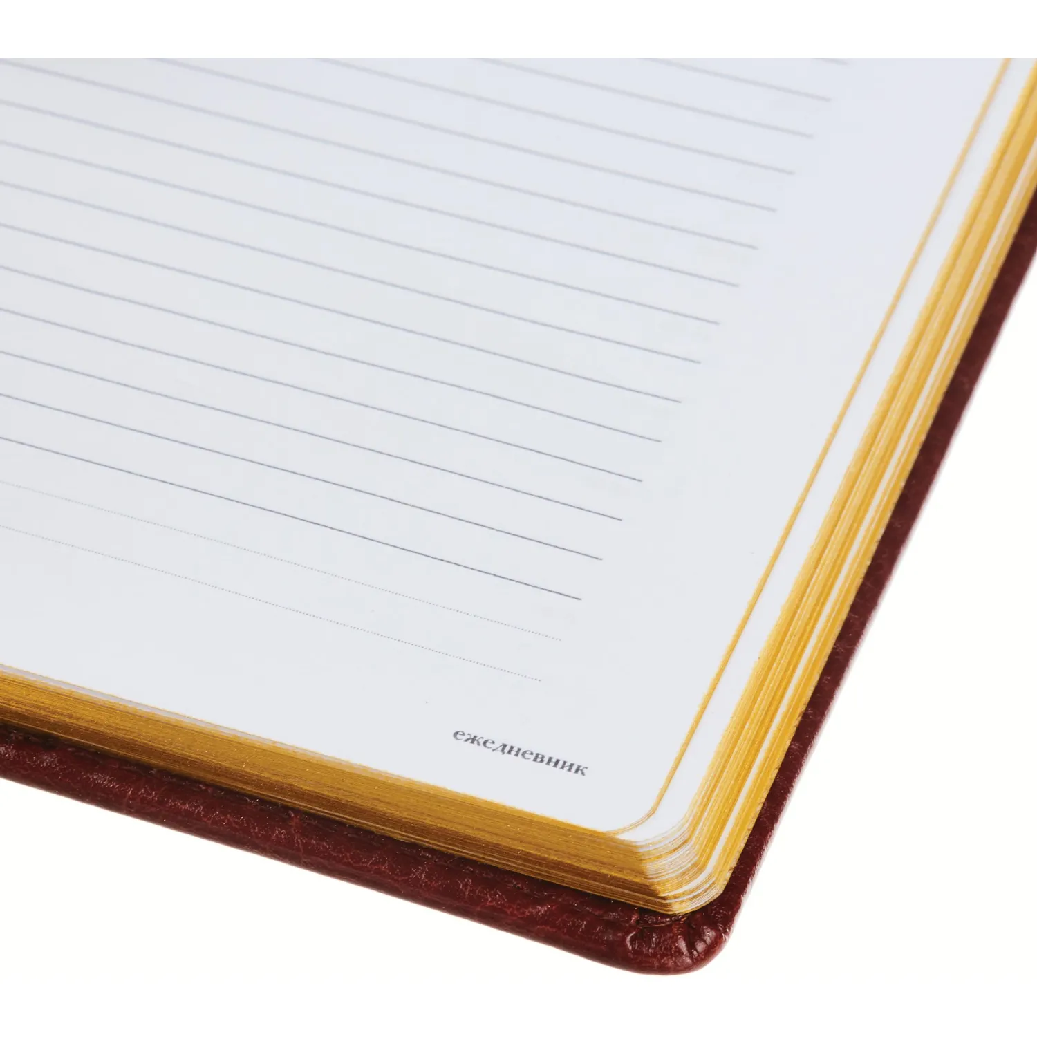 Внутренний блок состоит из 136 листов белой офсетной бумаги плотностью 90 г/кв.м., с золотистым обрезом и ляссе бордового цвета. Листы разлинованы в линейку. Печать блока выполнена в два цвета. Формат А5 (145×205 мм) и вертикальная ориентация предоставляют удобство при использовании.