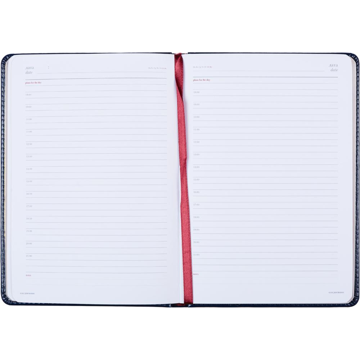Внутренний блок состоит из 136 листов белой офсетной бумаги плотностью 90 г/кв.м. Листы разлинованы в линейку. Ежедневник дополнен золотистым обрезом и бордовым ляссе, что придаёт изделию дополнительный шарм. Размер блокнота — A5 (145×205 мм), он имеет удобную вертикальную ориентацию и скруглённые углы. Печать блока выполнена в два цвета, что придаёт дополнительную эстетику.