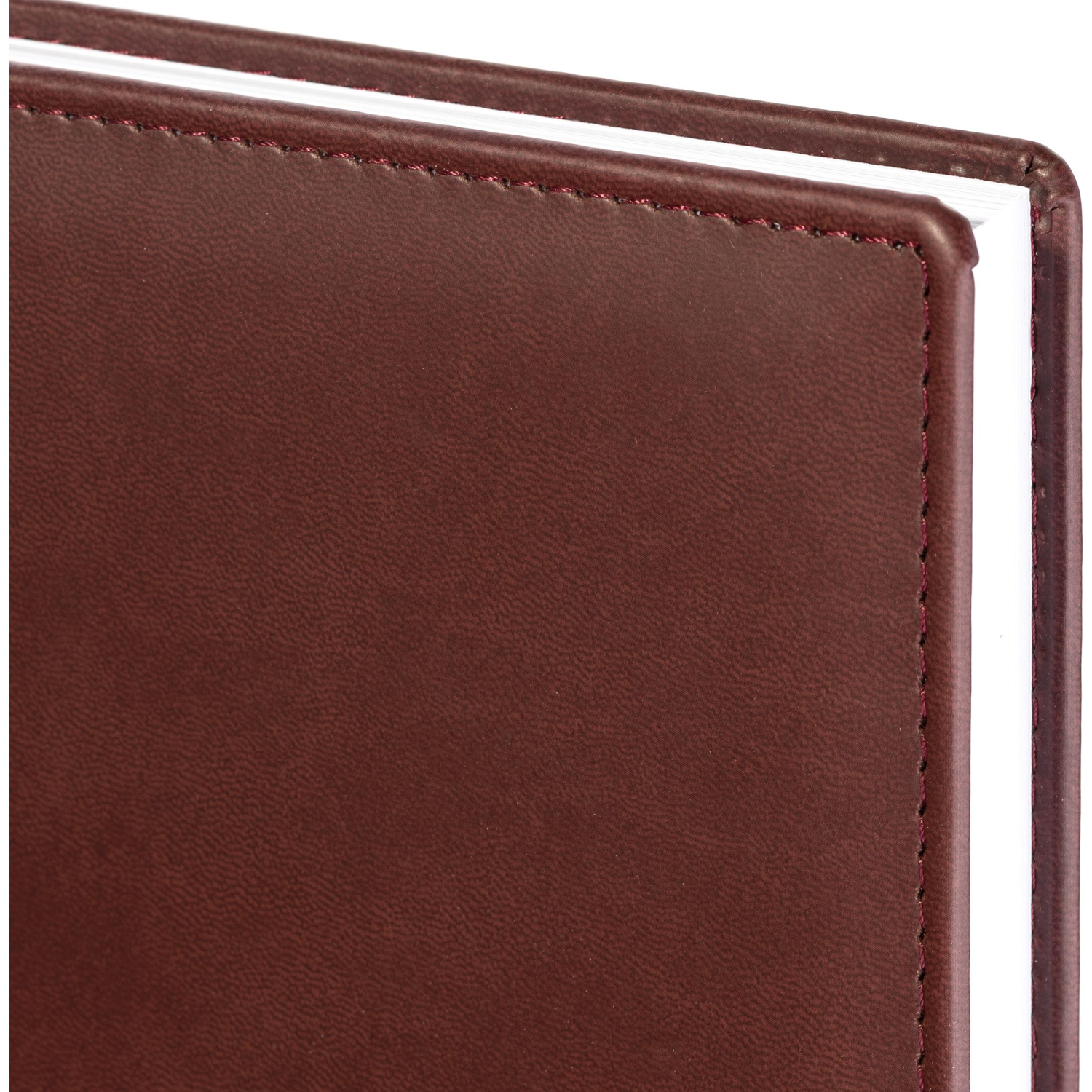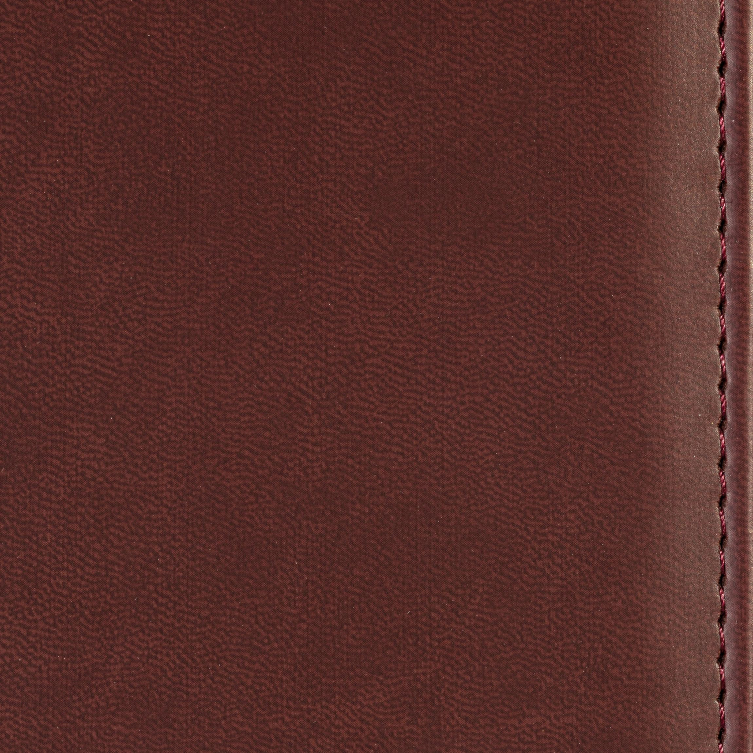 Ежедневник размером 148×218 мм выполнен с твёрдой однотонной бордовой обложкой из искусственной кожи с мягкой поролоновой вставкой. По периметру обложки проходит отделочная строчка в цвет материала, подчёркивающая аккуратность изделия. Материал обложки подходит для тиснения блинтом или фольгой.