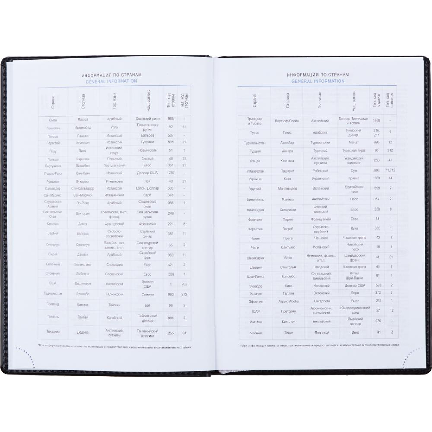 В изделии есть справочный информационный блок, который включает личные данные, государственные праздники, междугородные телефонные коды России, Москвы, Санкт-Петербурга и Екатеринбурга, знаки зодиака, штриховой код, сведения о странах, цифровые годы ГИБДД, форматы бумаги, данные о температуре и планы на год.