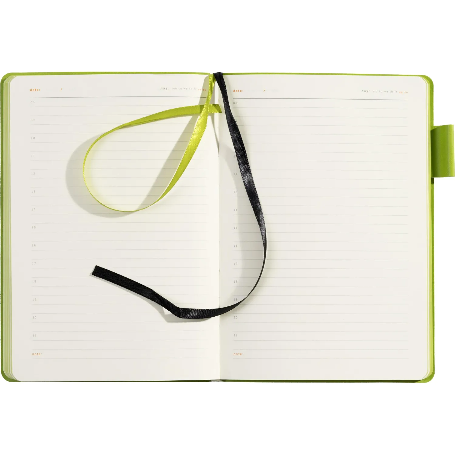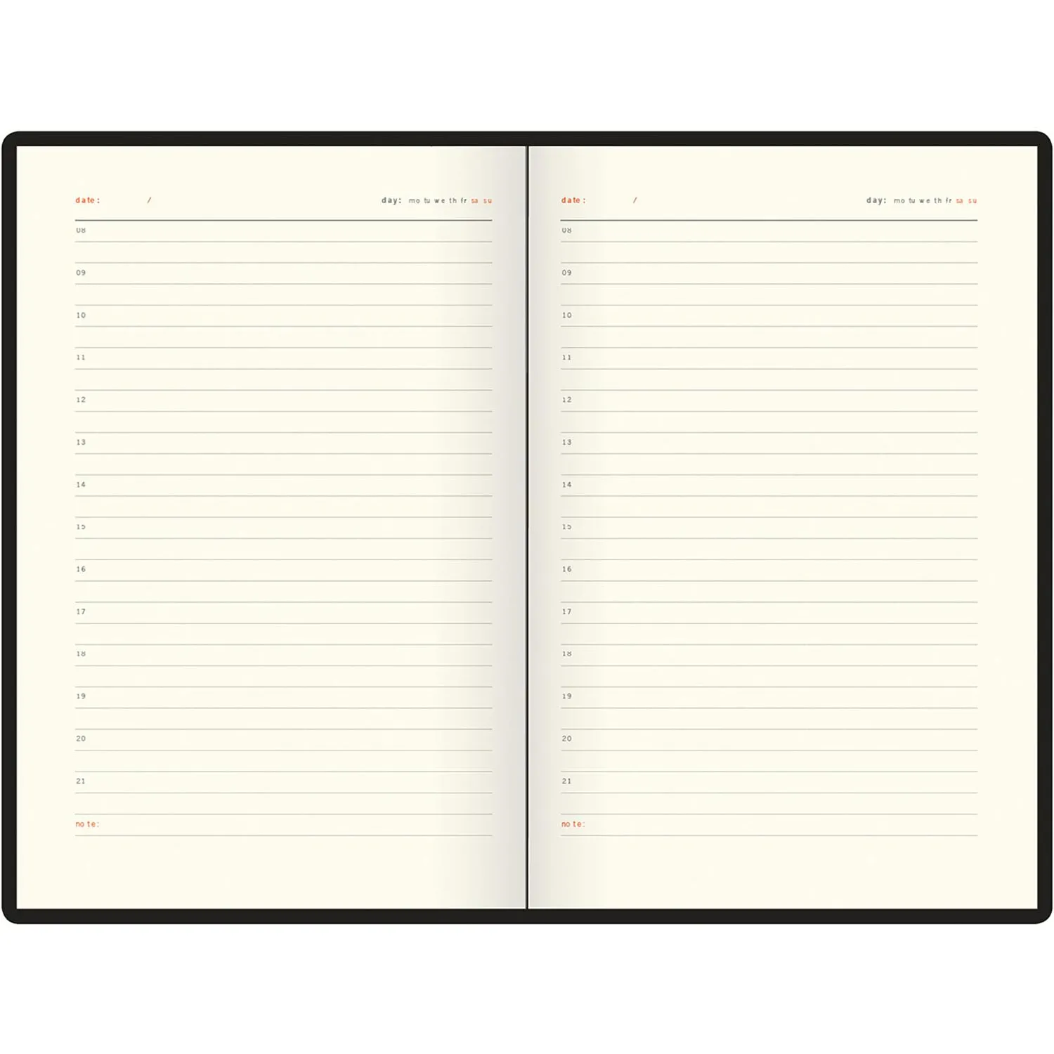 Внутренний блок выполнен на офсетной бумаге с линейкой, а печать в два цвета добавляет изысканности. Ежедневник имеет 136 страниц, удобен для записи благодаря своему формату A5 (14,5×20,7 см) и вертикальной ориентации. Дополнительные особенности включают петлю под ручку, а также цветной обрез и ляссе, которые выделяют его среди других моделей. Внешний вид дополнен скруглёнными углами и отсутствием лишних декоративных элементов. Упакован в картонный полукороб и термоплёнку.
