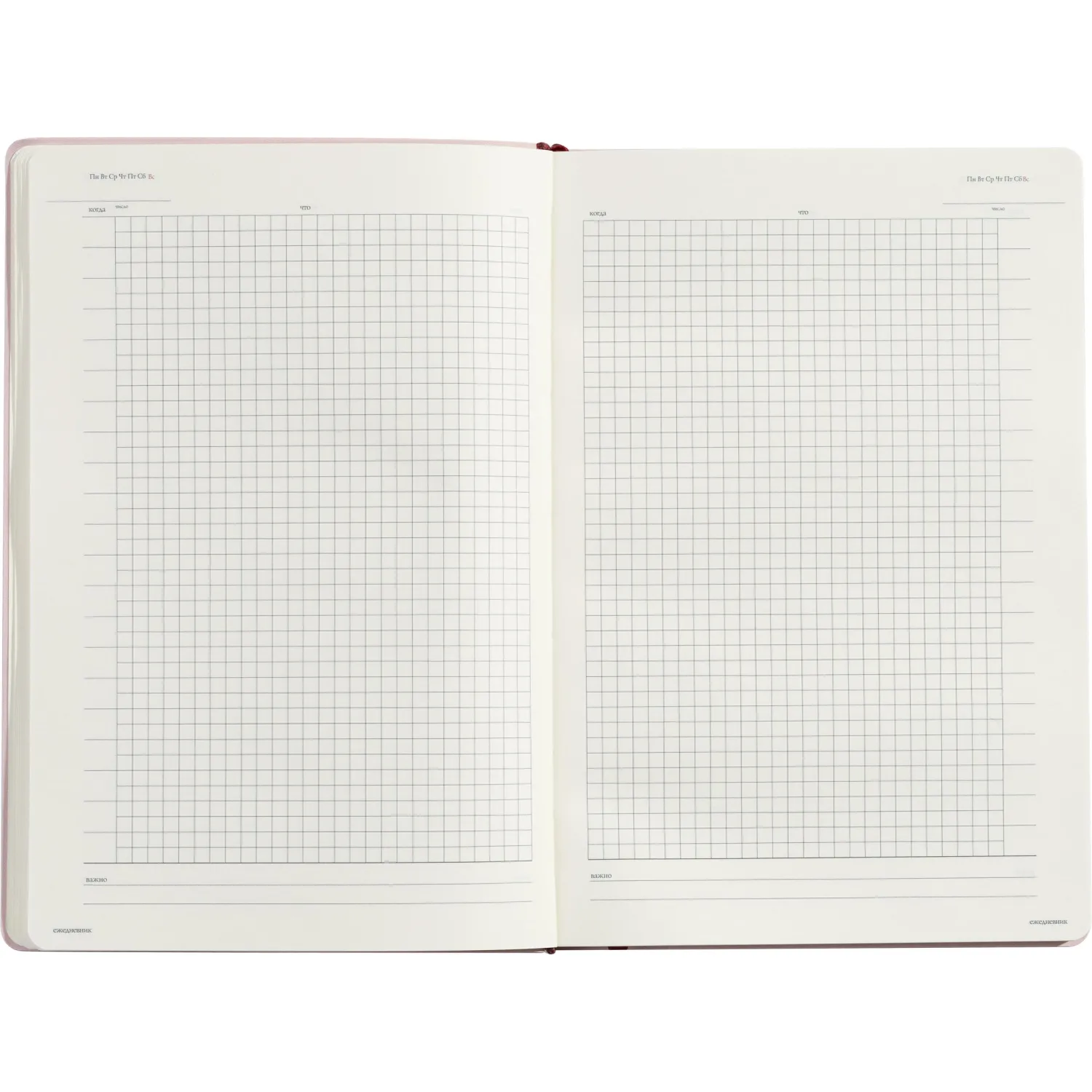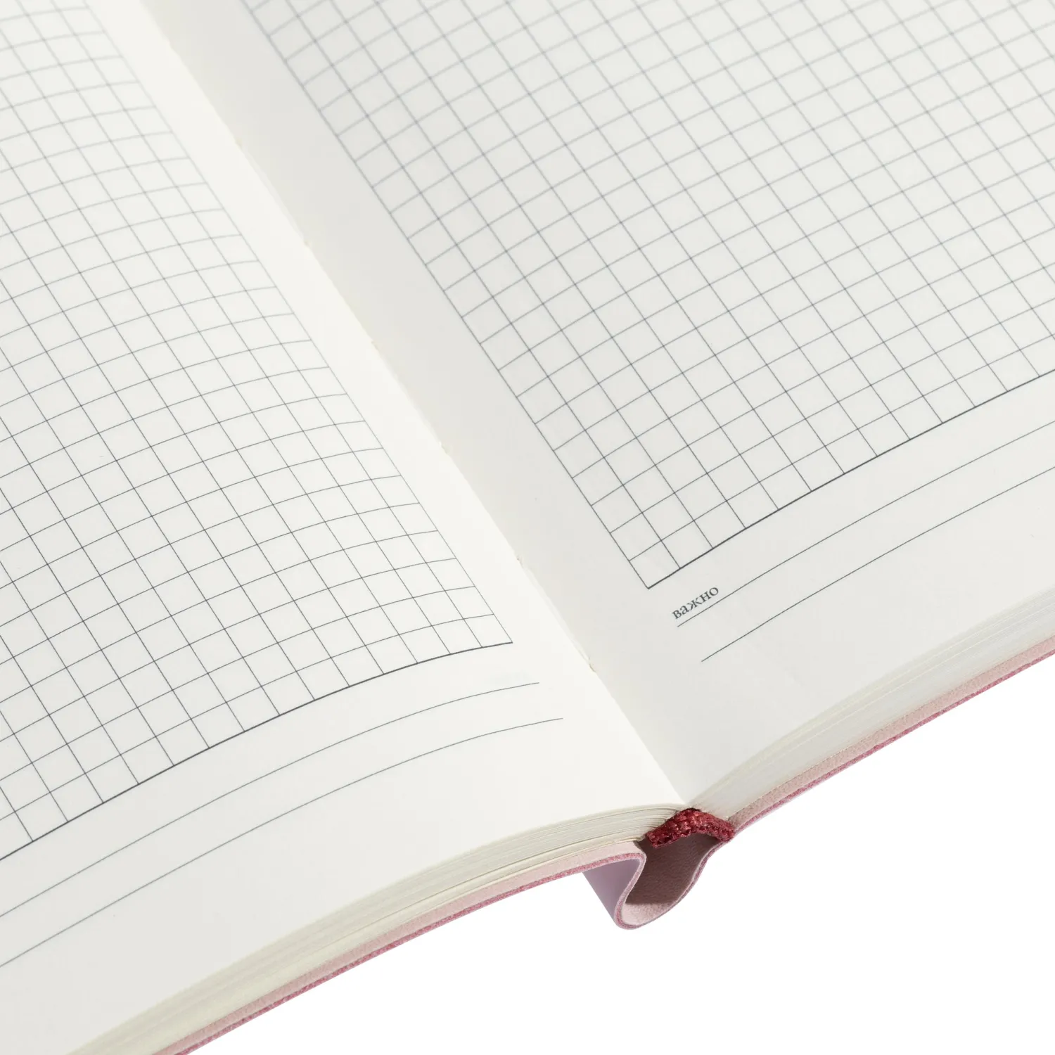 Ежедневник формата A5 (14,5×21,2 см) содержит 136 страниц тонированной офсетной бумаги плотностью 90 г/кв.м. Линовка клетка способствует удобному использованию для записи заметок и планирования. Внутренний блок включает справочную информацию на 17 страницах, что делает ежедневник ещё более практичным для повседневного использования. Простой и стильный, он не имеет кармана, календаря или фиксирующей резинки.