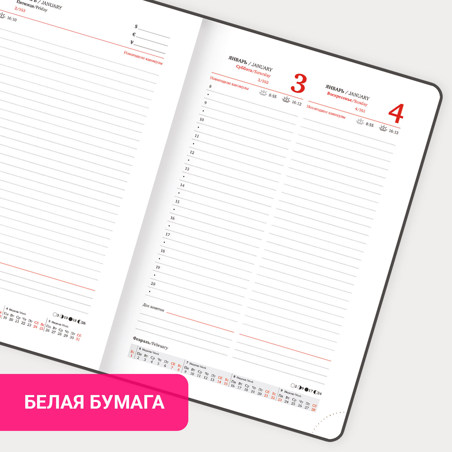 Внутренний блок включает 168 листов белой бумаги плотностью 70 г/м2. Каждая страничка имеет перфорированный угол. Благодаря стандартному формату А5 (138х213 мм) ежедневник удобно использовать как в офисе, так и на выездных деловых встречах.