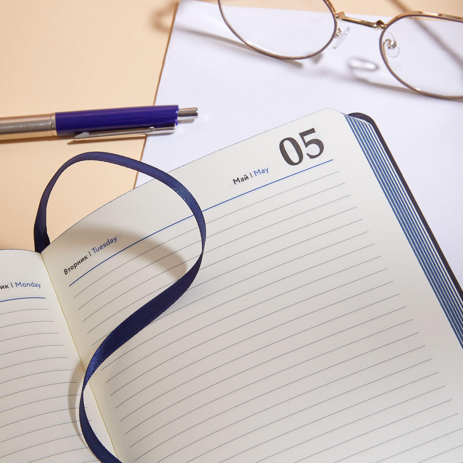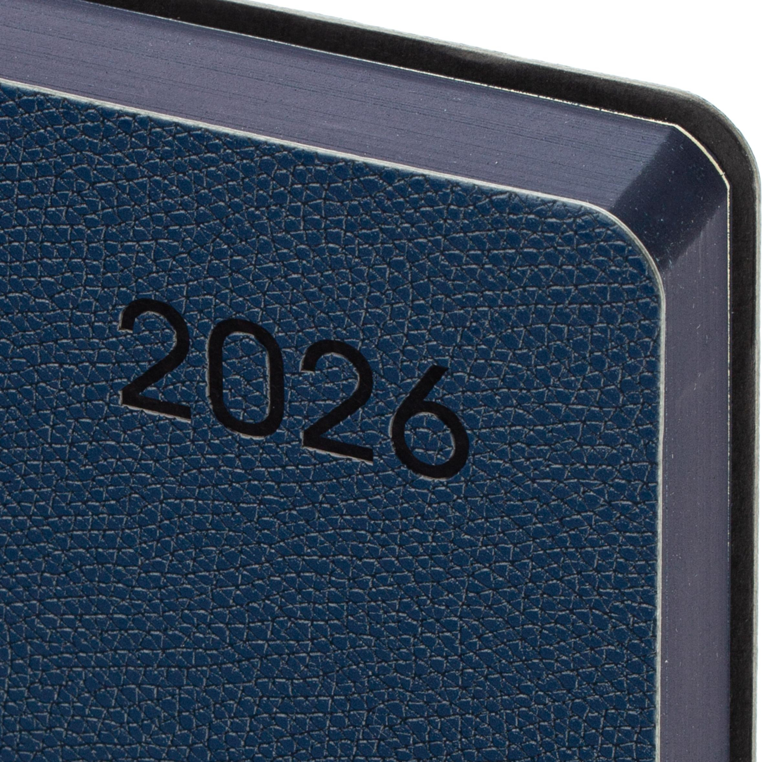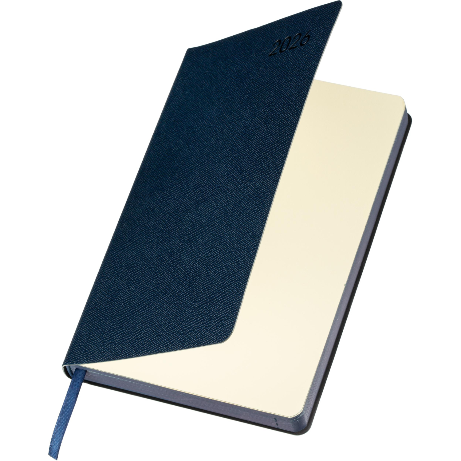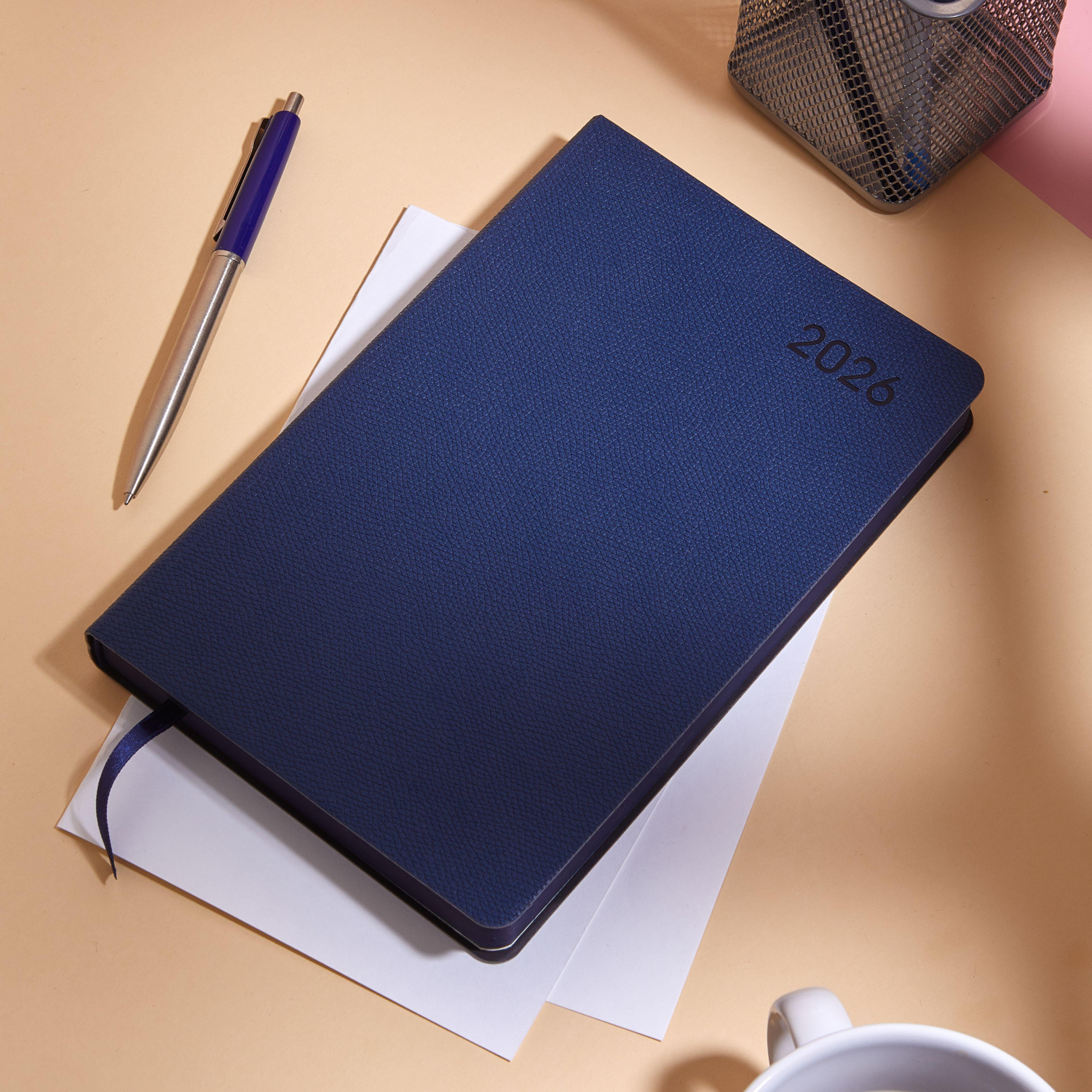 Ежедневник формата A5 предназначен для планирования задач и ведения записей в течение 2026 года. Обложка выполнена из искусственной кожи тёмно-синего цвета с тиснением и лаконичным однотонным оформлением. Мягкий переплёт делает изделие более гибким и лёгким, а сшивка блока гарантирует его надёжность при регулярном использовании.