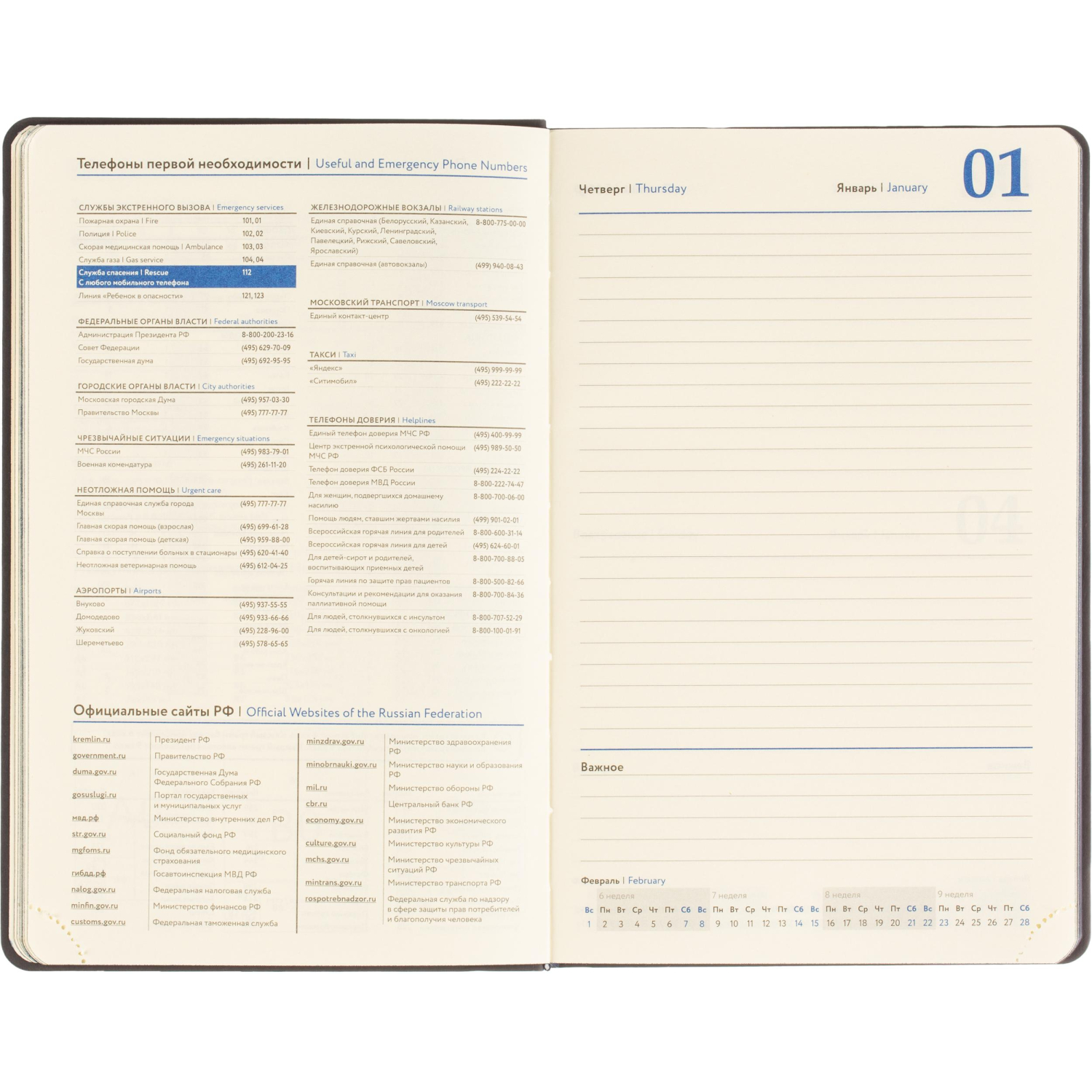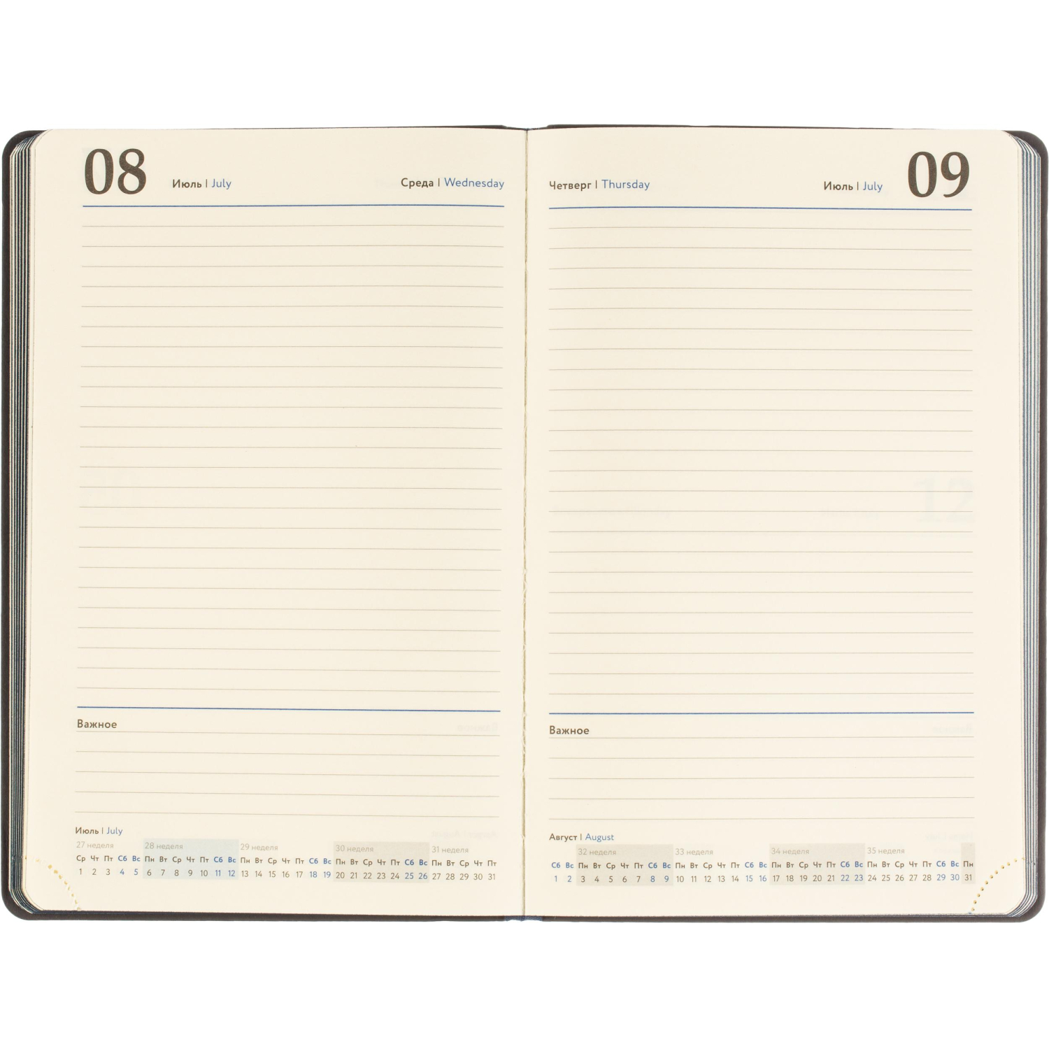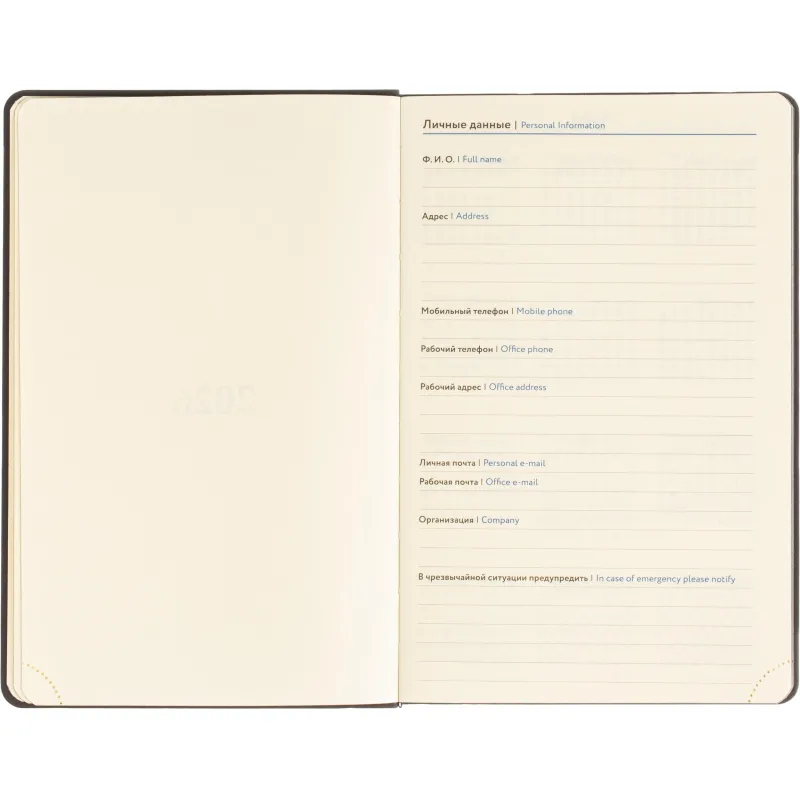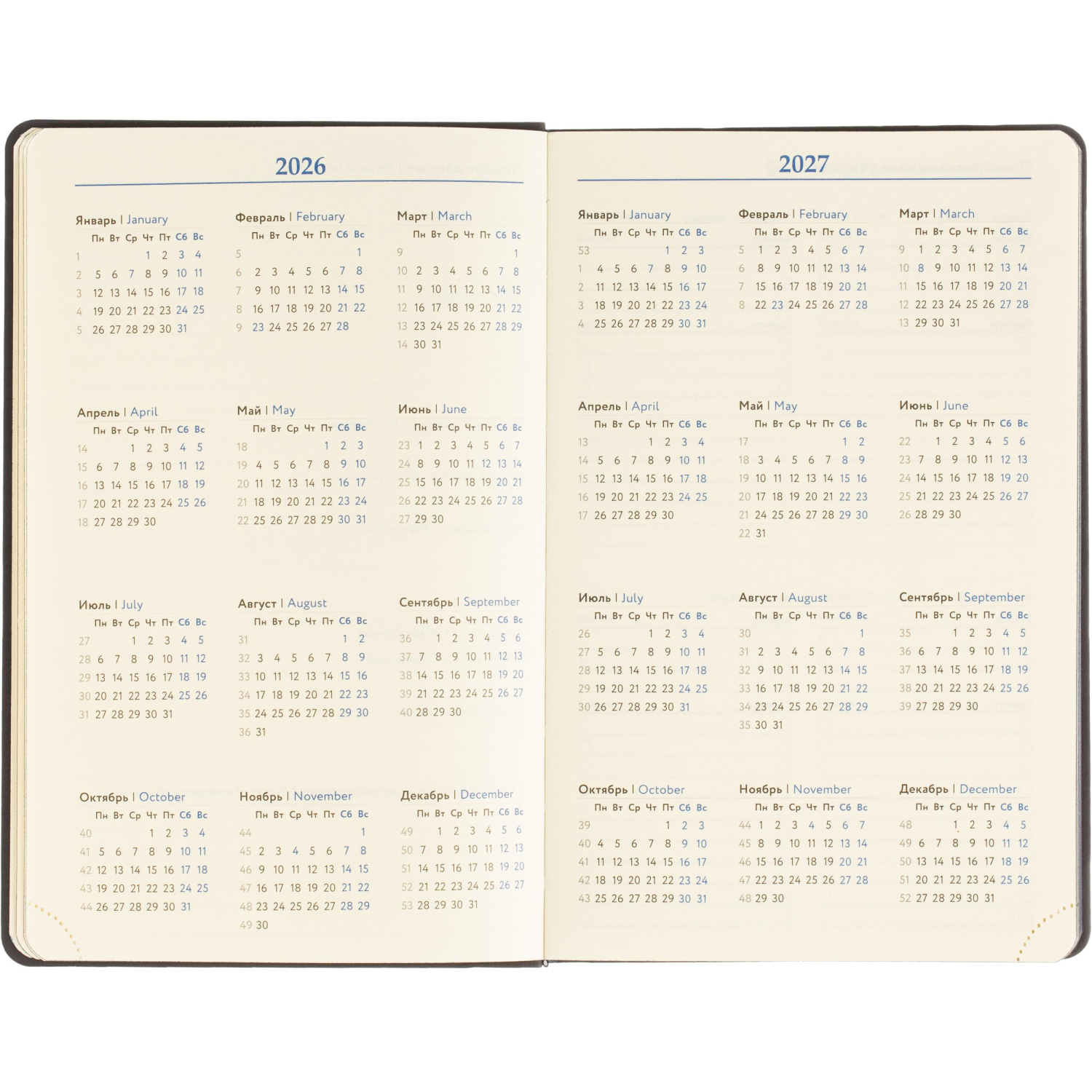 Размер ежедневника составляет 13.8×21.3 см. Внутри предусмотрен календарь на два года. Модель подходит под персонализацию.