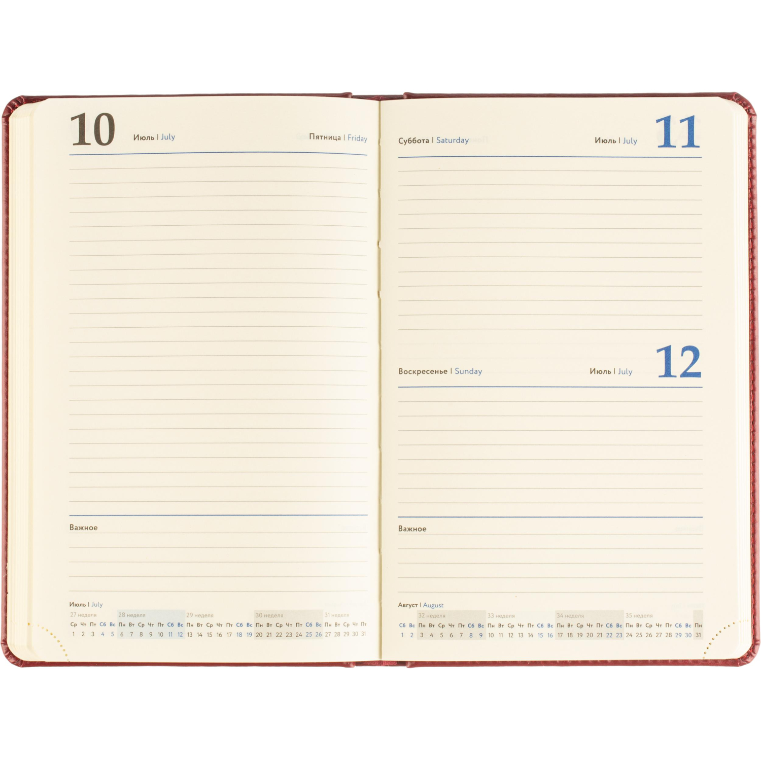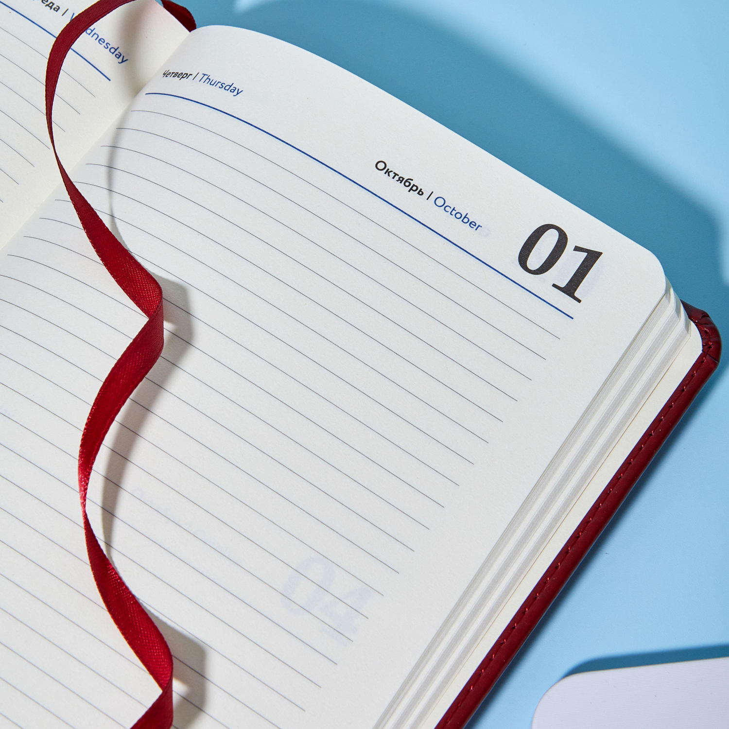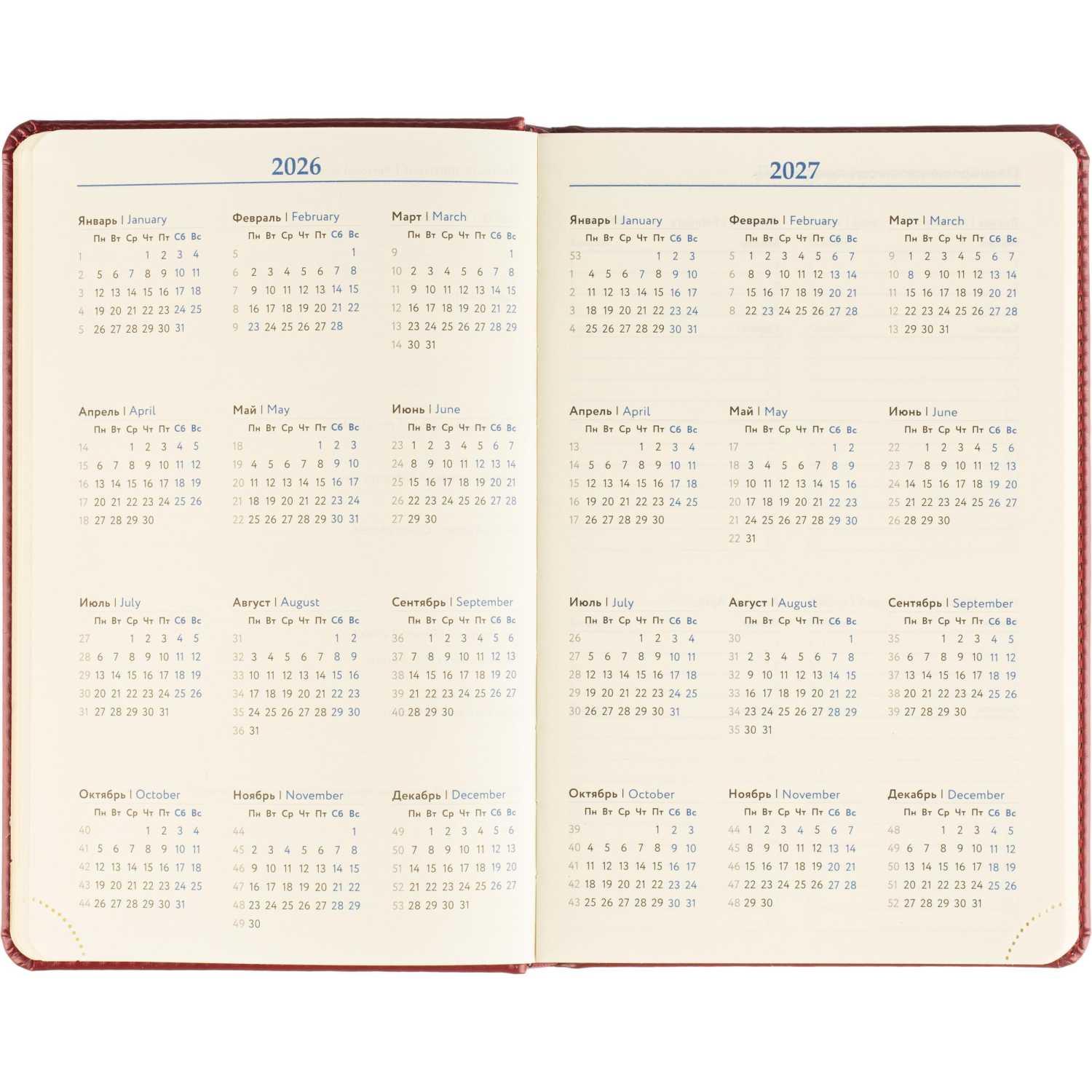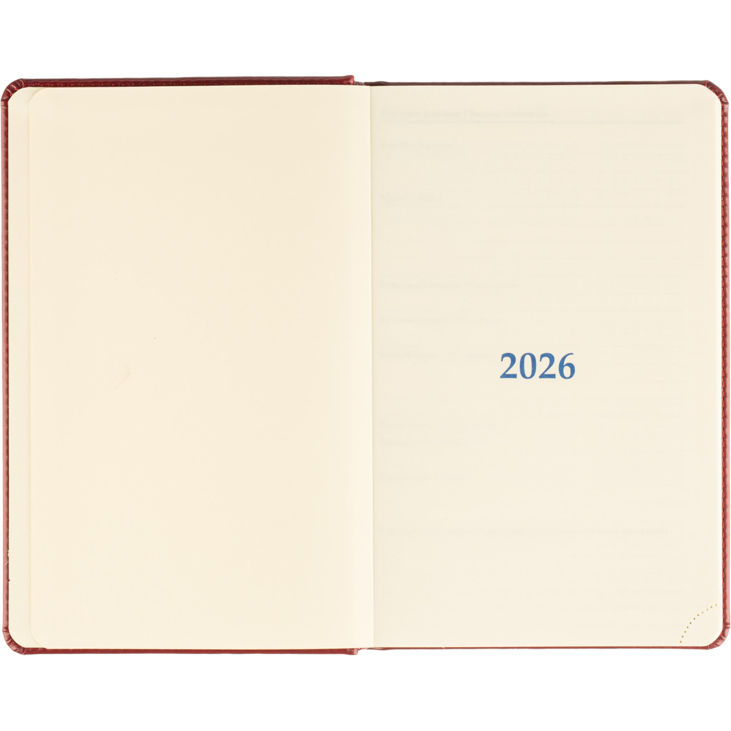 Ежедневник формата A5 предназначен для планирования дел и записи заметок в течение всего 2026 года. Обложка выполнена из искусственной кожи бордового цвета с тиснением и имеет однотонный дизайн. Жёсткий переплёт сохраняет форму изделия, а сшивка блока обеспечивает его надёжность при частом использовании.