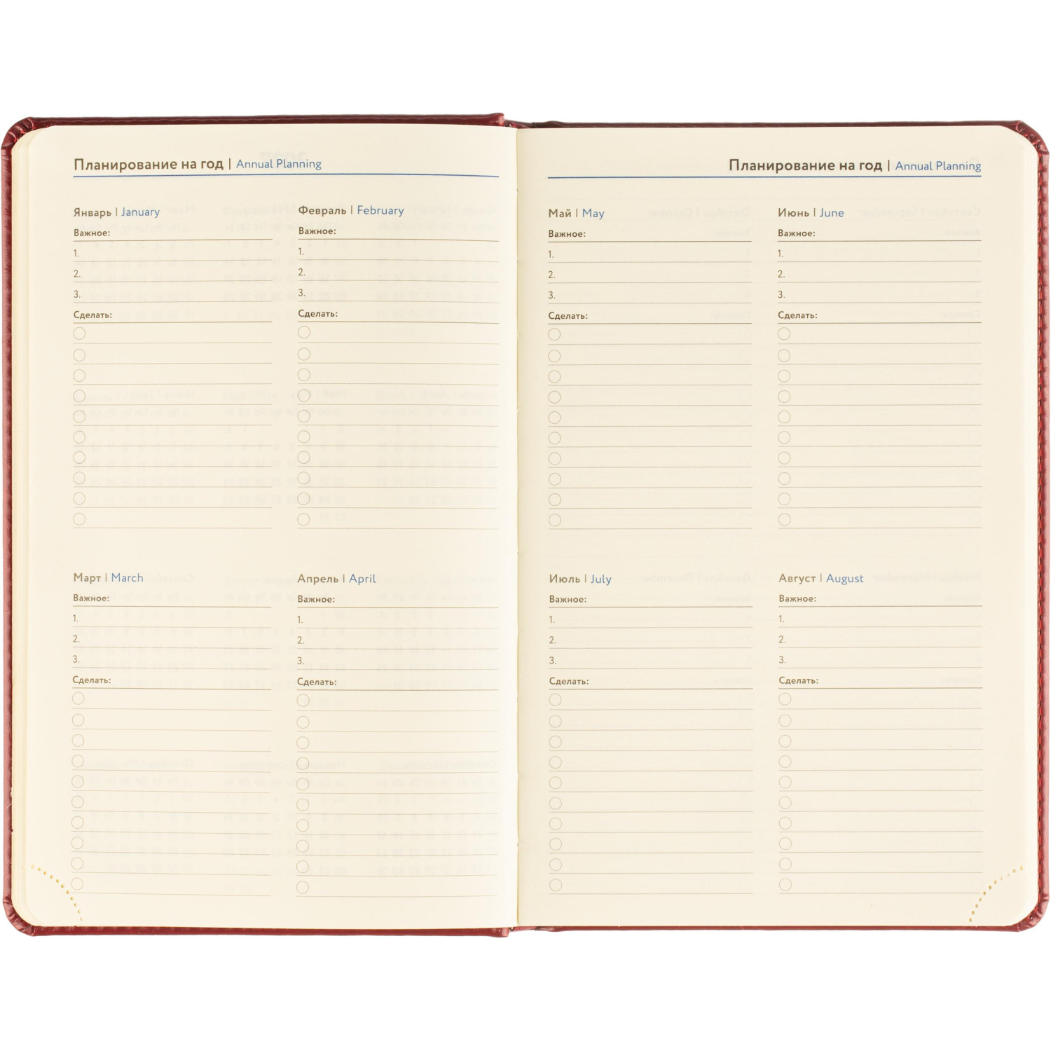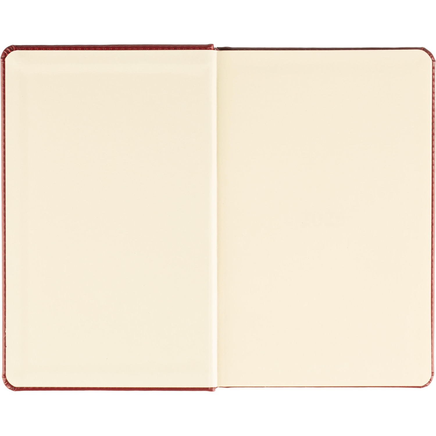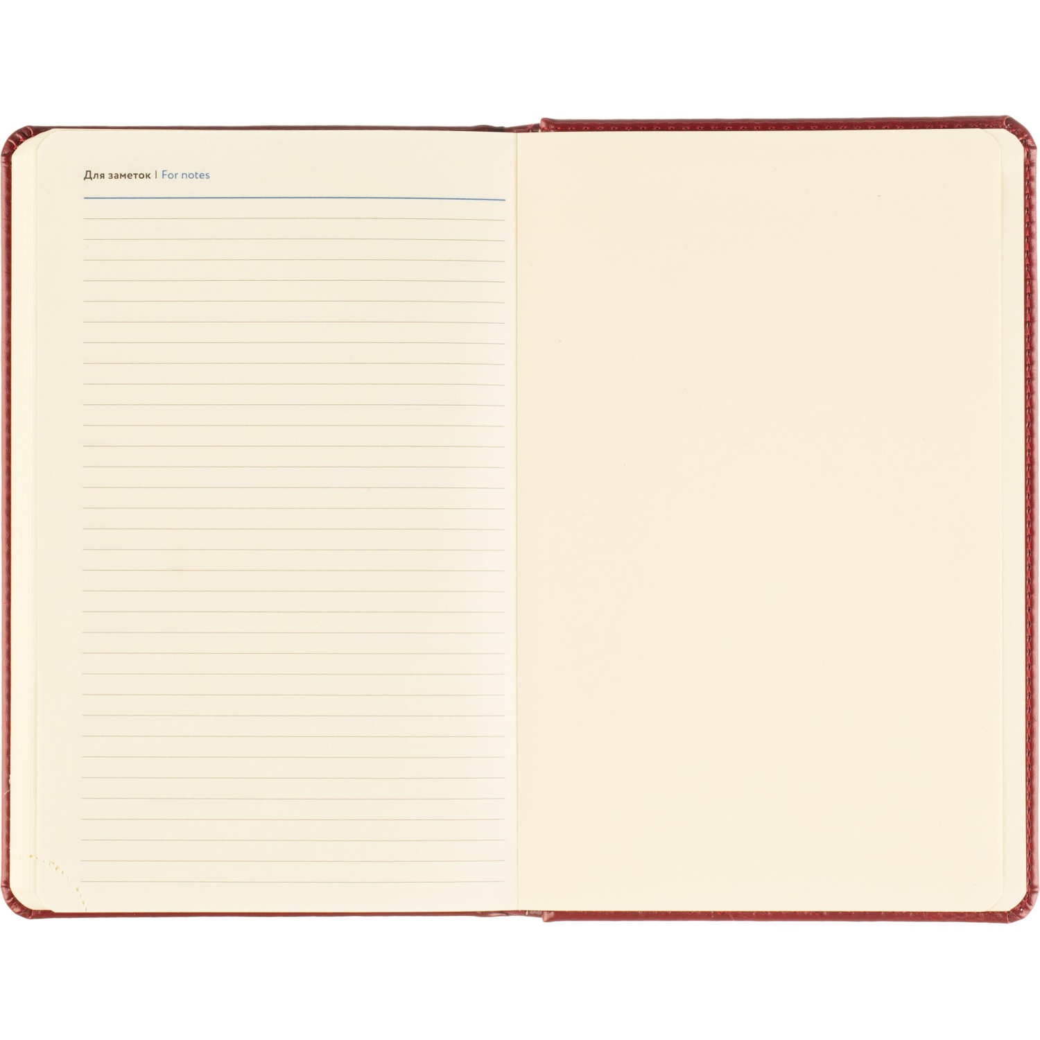 Ежедневник формата A5 предназначен для планирования дел и записи заметок в течение всего 2026 года. Обложка выполнена из искусственной кожи бордового цвета с тиснением и имеет однотонный дизайн. Жёсткий переплёт сохраняет форму изделия, а сшивка блока обеспечивает его надёжность при частом использовании.