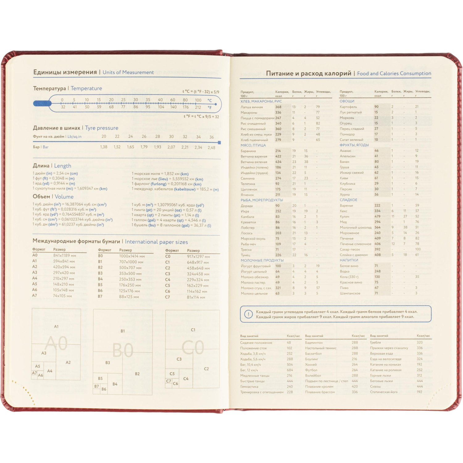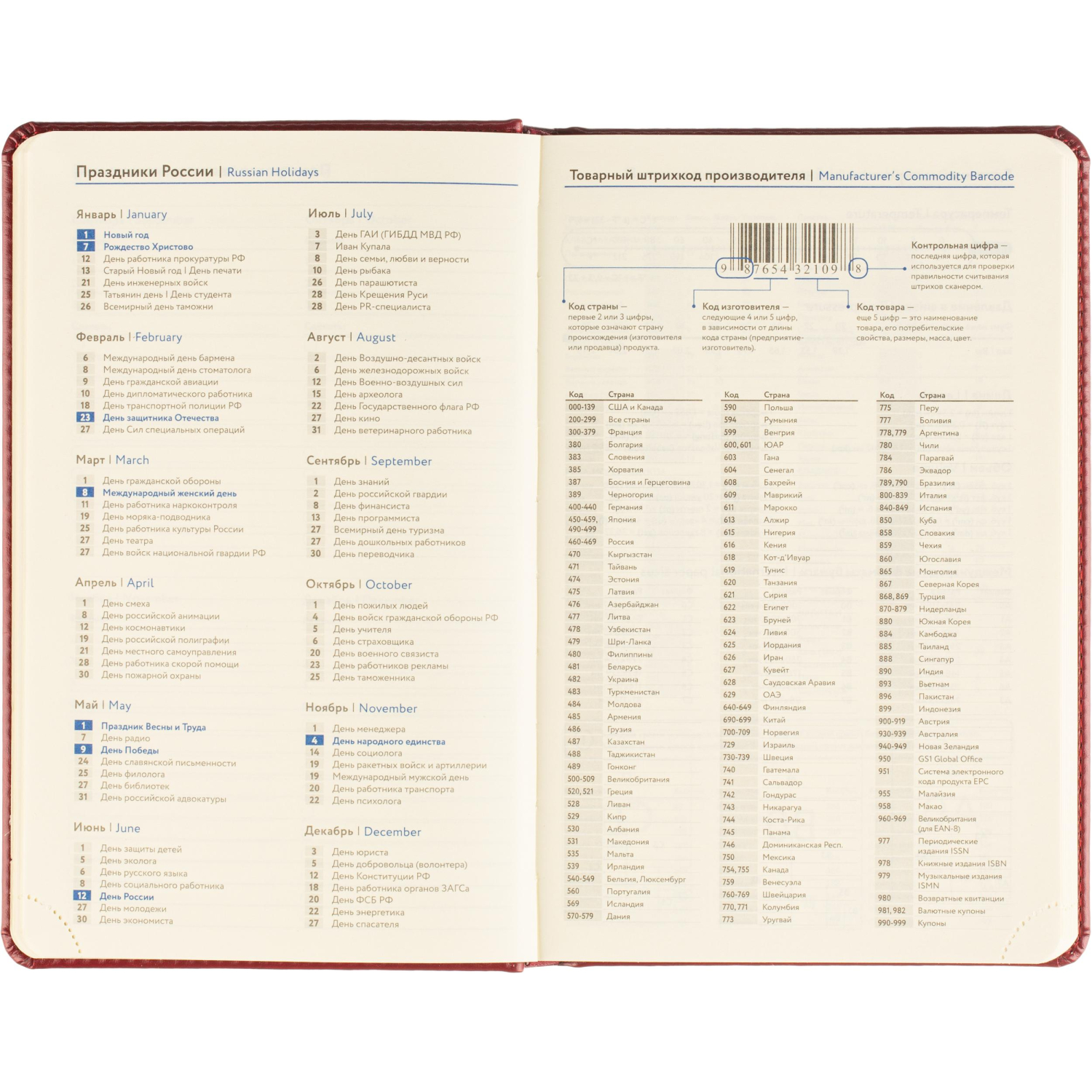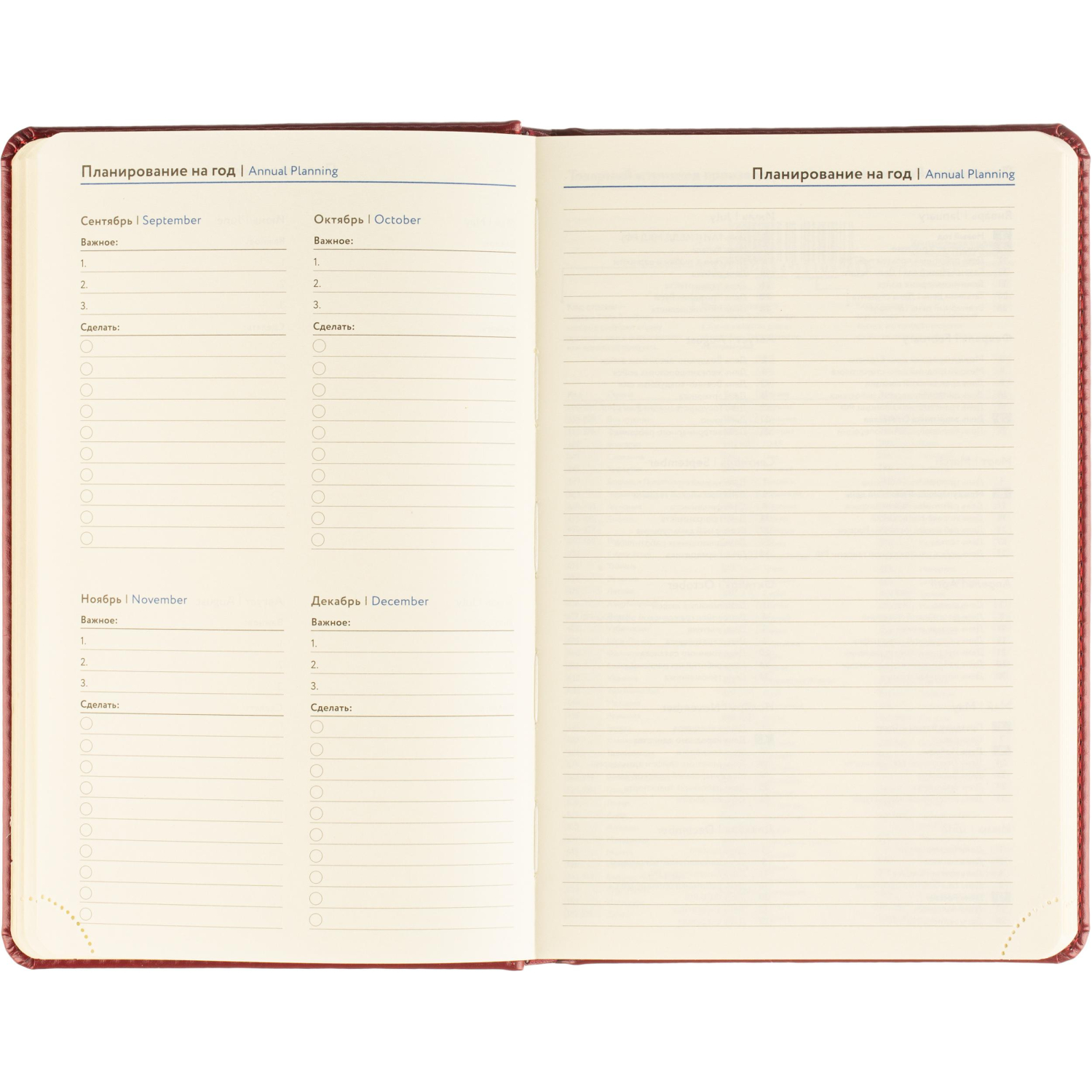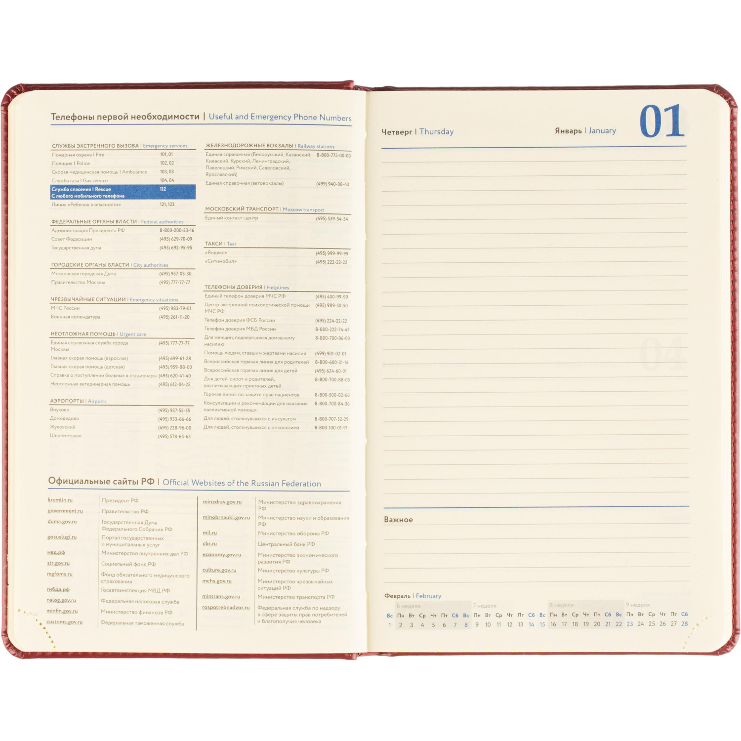 Ежедневник формата A5 предназначен для планирования дел и записи заметок в течение всего 2026 года. Обложка выполнена из искусственной кожи бордового цвета с тиснением и имеет однотонный дизайн. Жёсткий переплёт сохраняет форму изделия, а сшивка блока обеспечивает его надёжность при частом использовании.