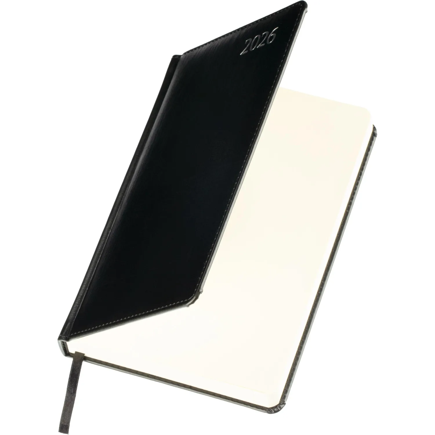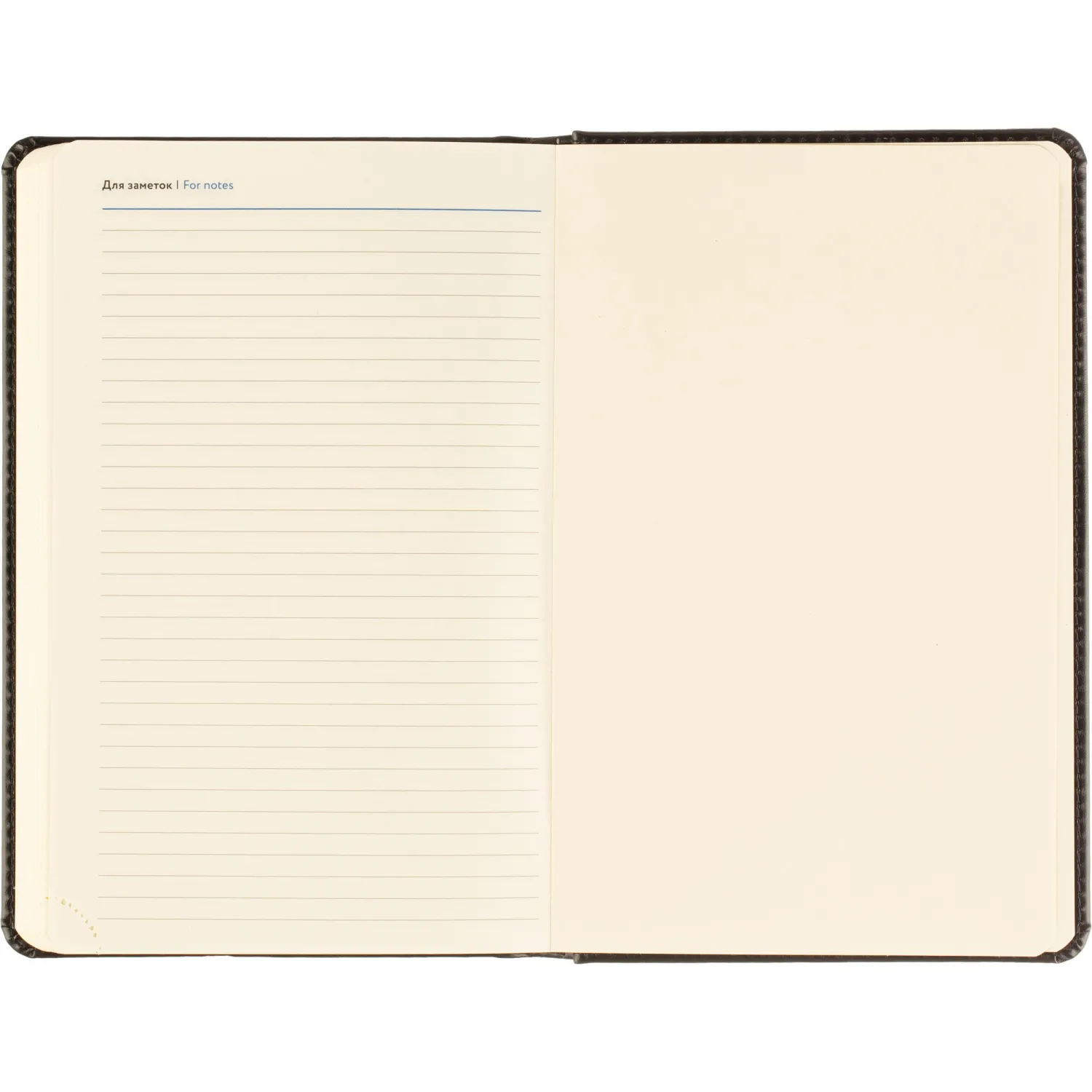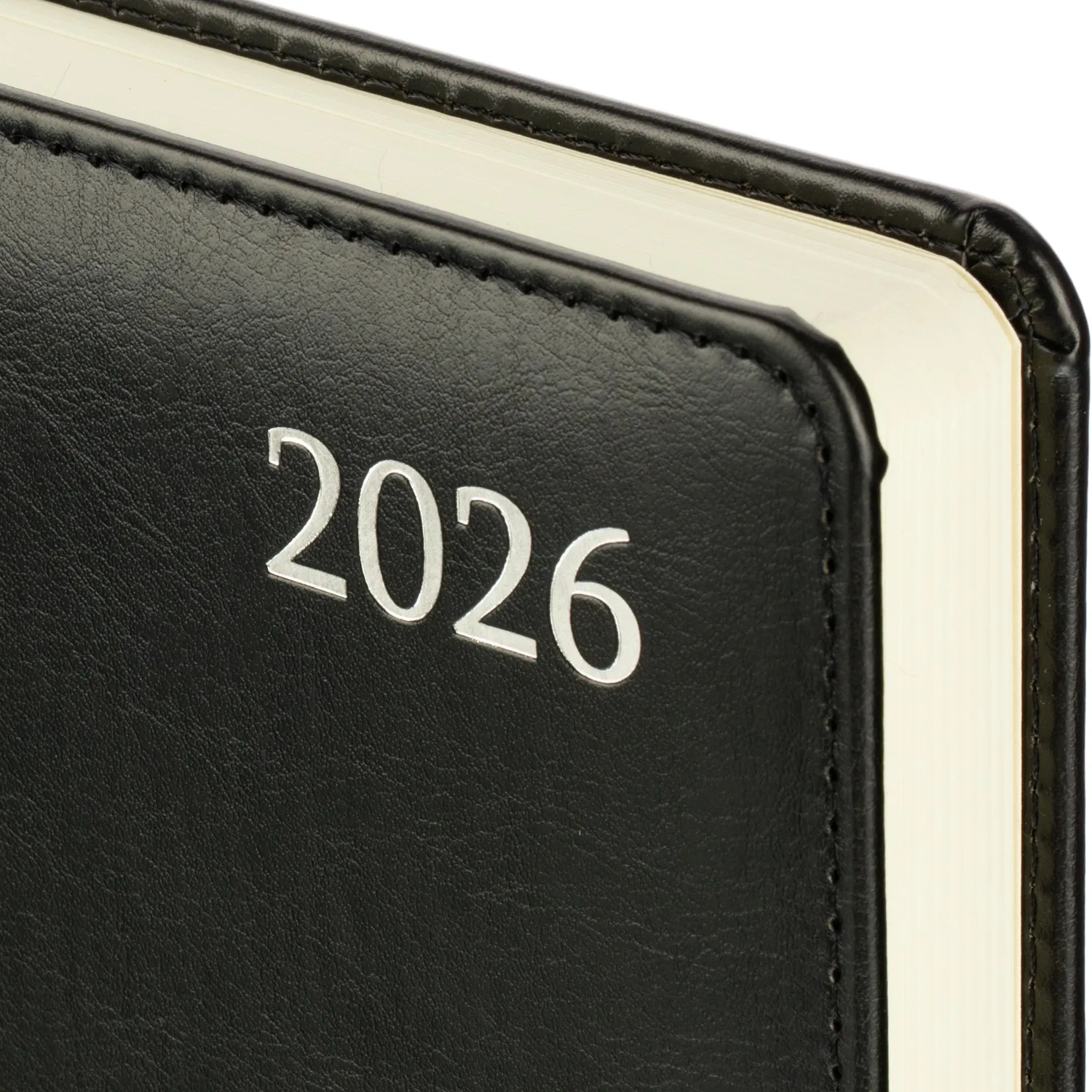 Ежедневник формата A5 подходит для ведения записей и планирования задач на протяжении всего 2026 года. Обложка выполнена из искусственной кожи чёрного цвета с тиснением и оформлена в однотонном стиле. Твёрдый переплёт сохраняет форму изделия, а сшивка блока обеспечивает прочность при ежедневном использовании.