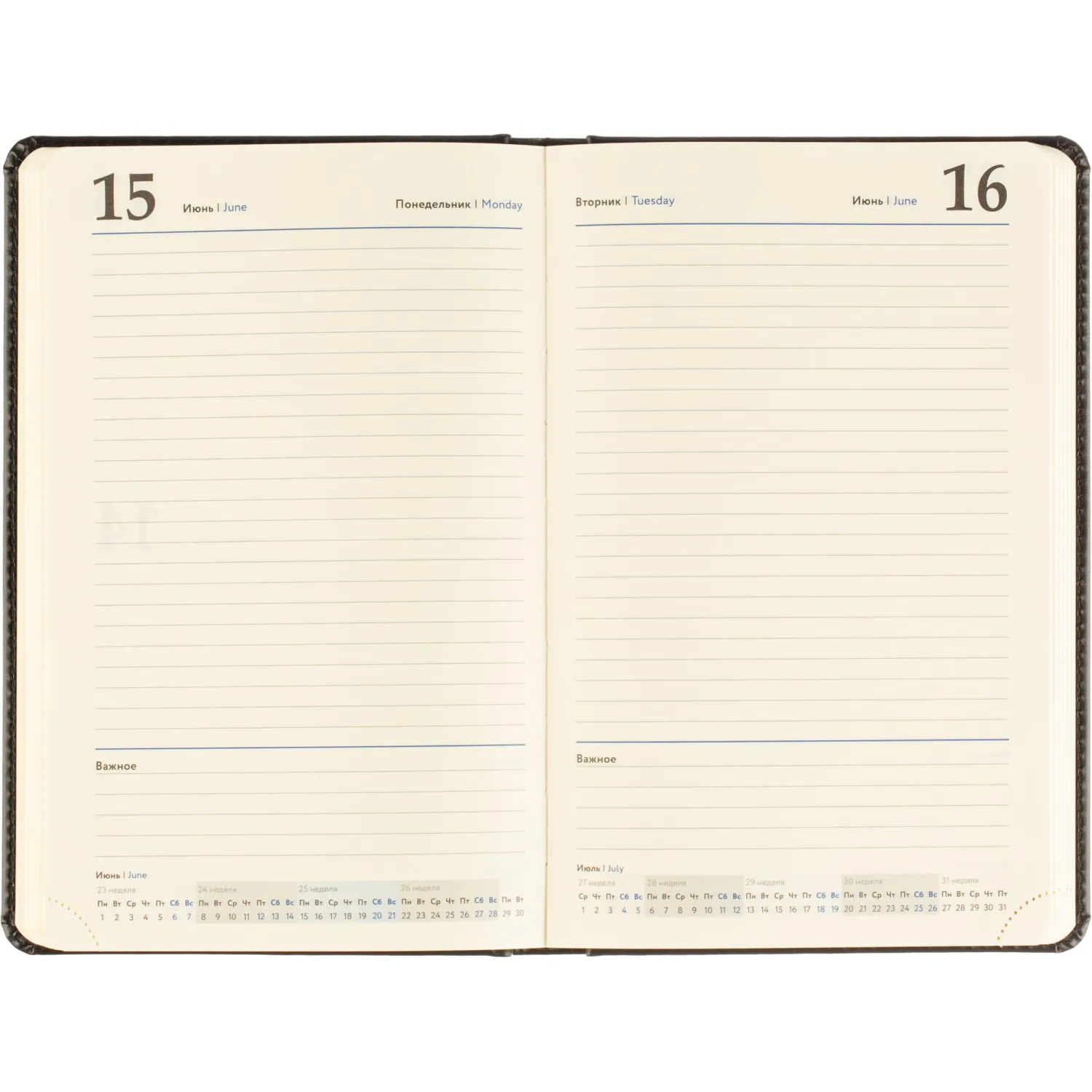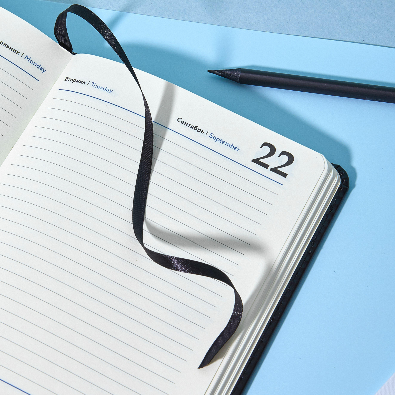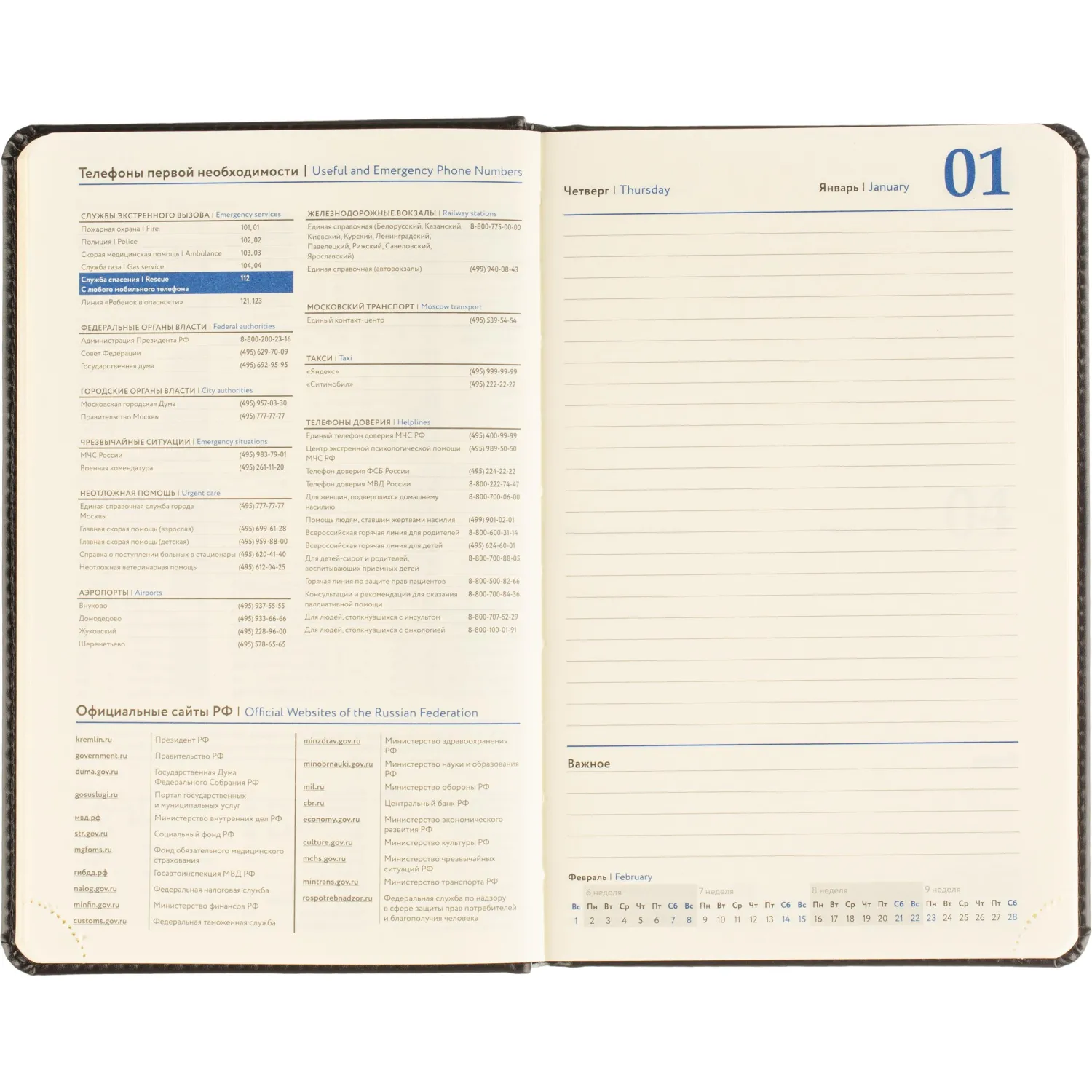 Ежедневник формата A5 подходит для ведения записей и планирования задач на протяжении всего 2026 года. Обложка выполнена из искусственной кожи чёрного цвета с тиснением и оформлена в однотонном стиле. Твёрдый переплёт сохраняет форму изделия, а сшивка блока обеспечивает прочность при ежедневном использовании.