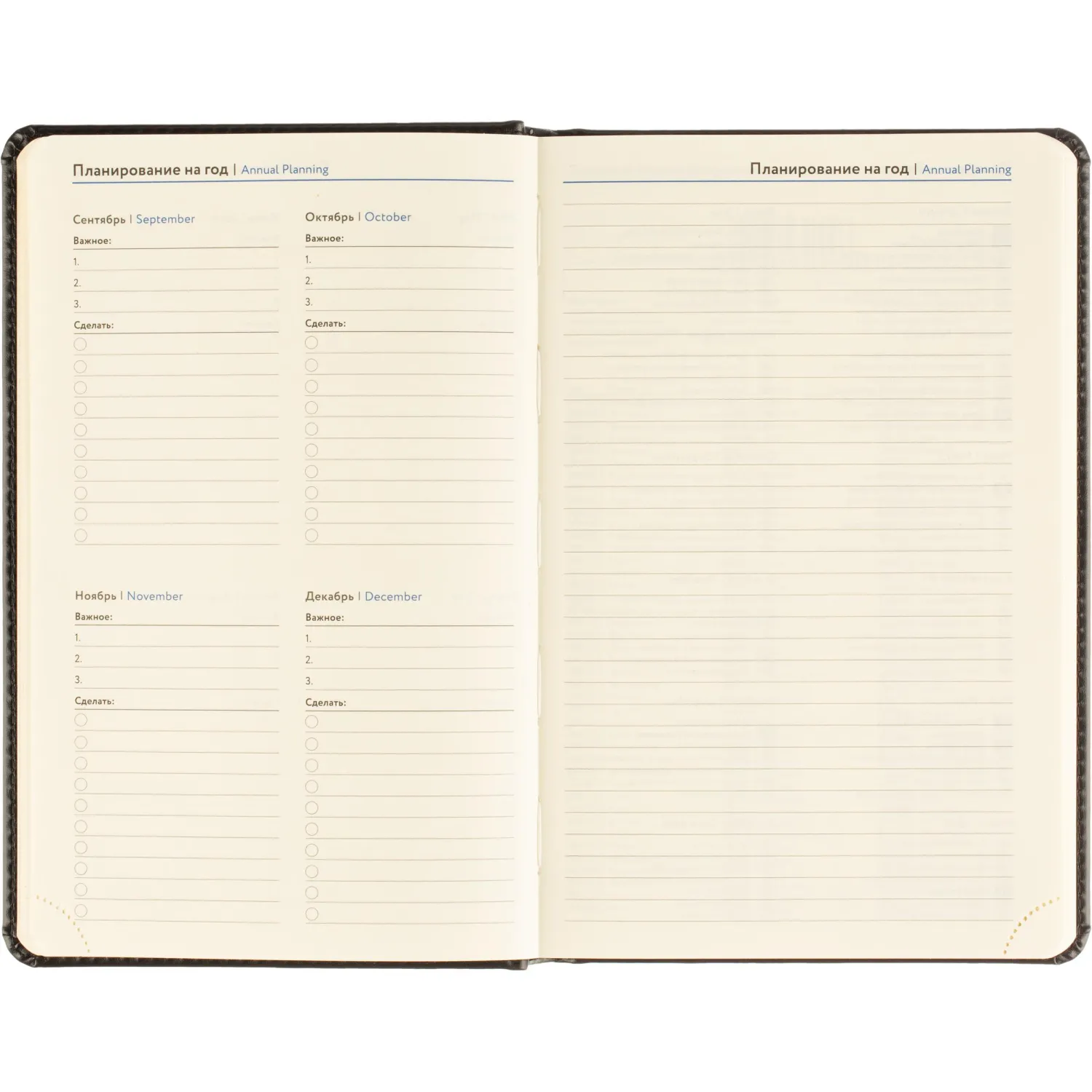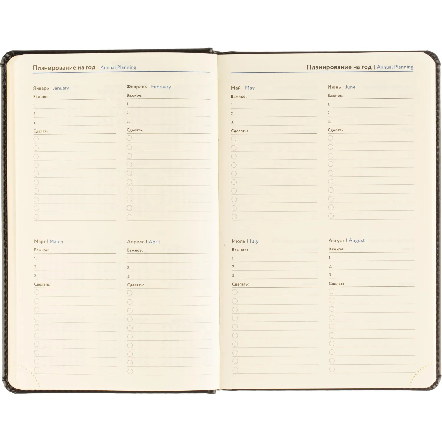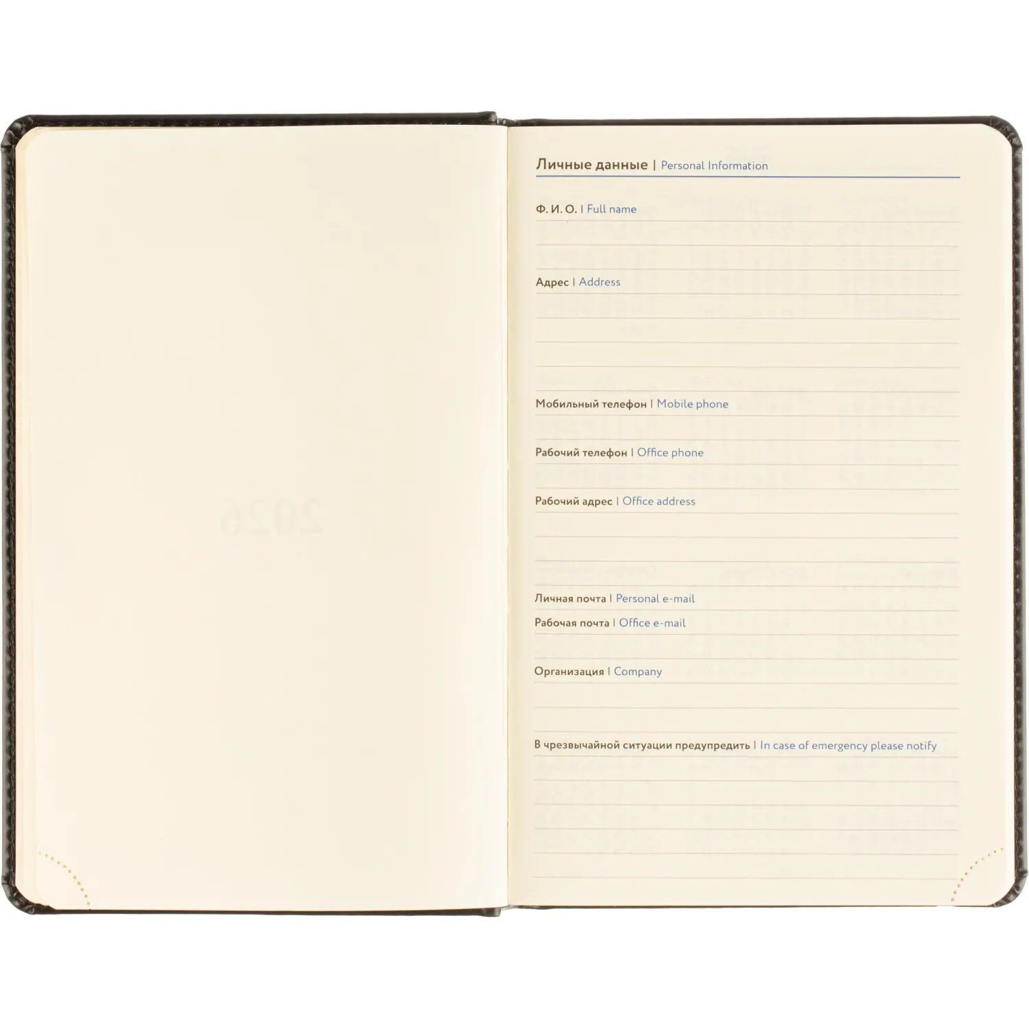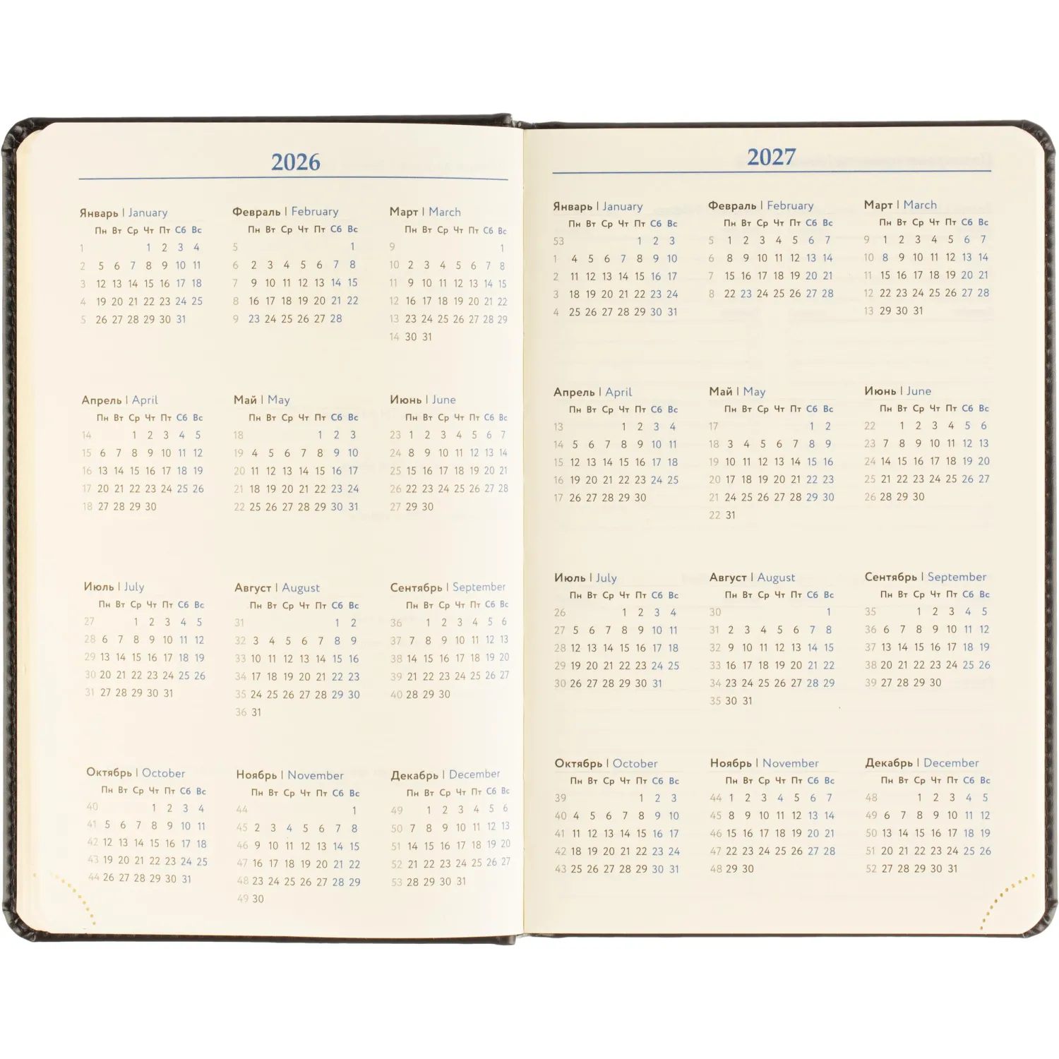 Размер изделия — 13.8×21.3 см. Внутри предусмотрен календарь на два года. Ежедневник подходит под персонализацию.