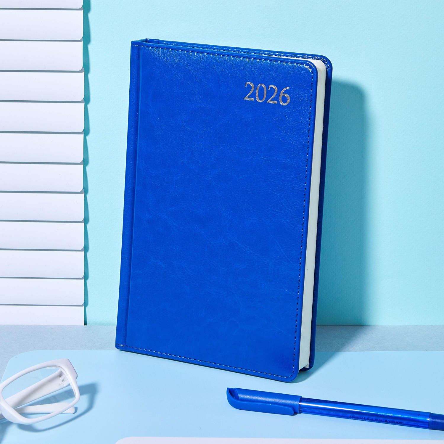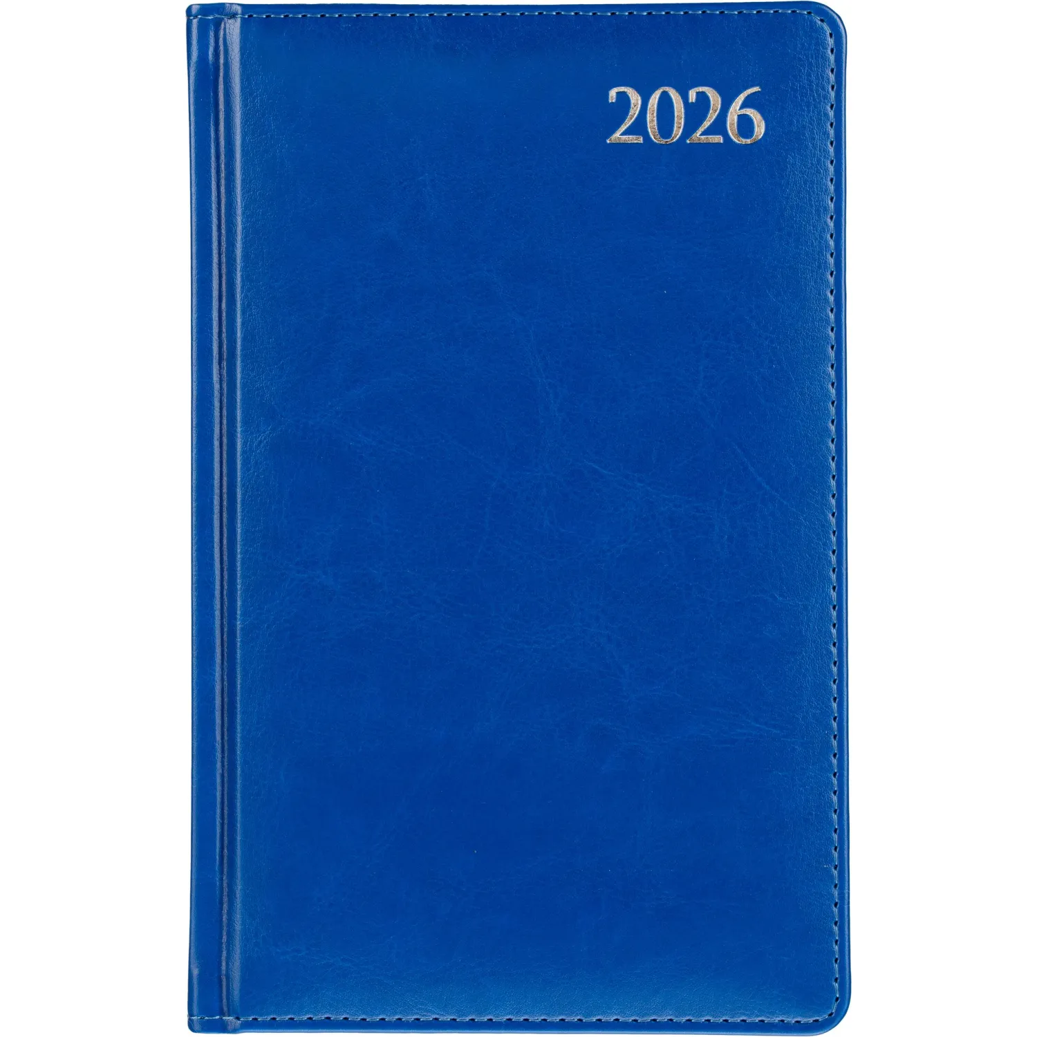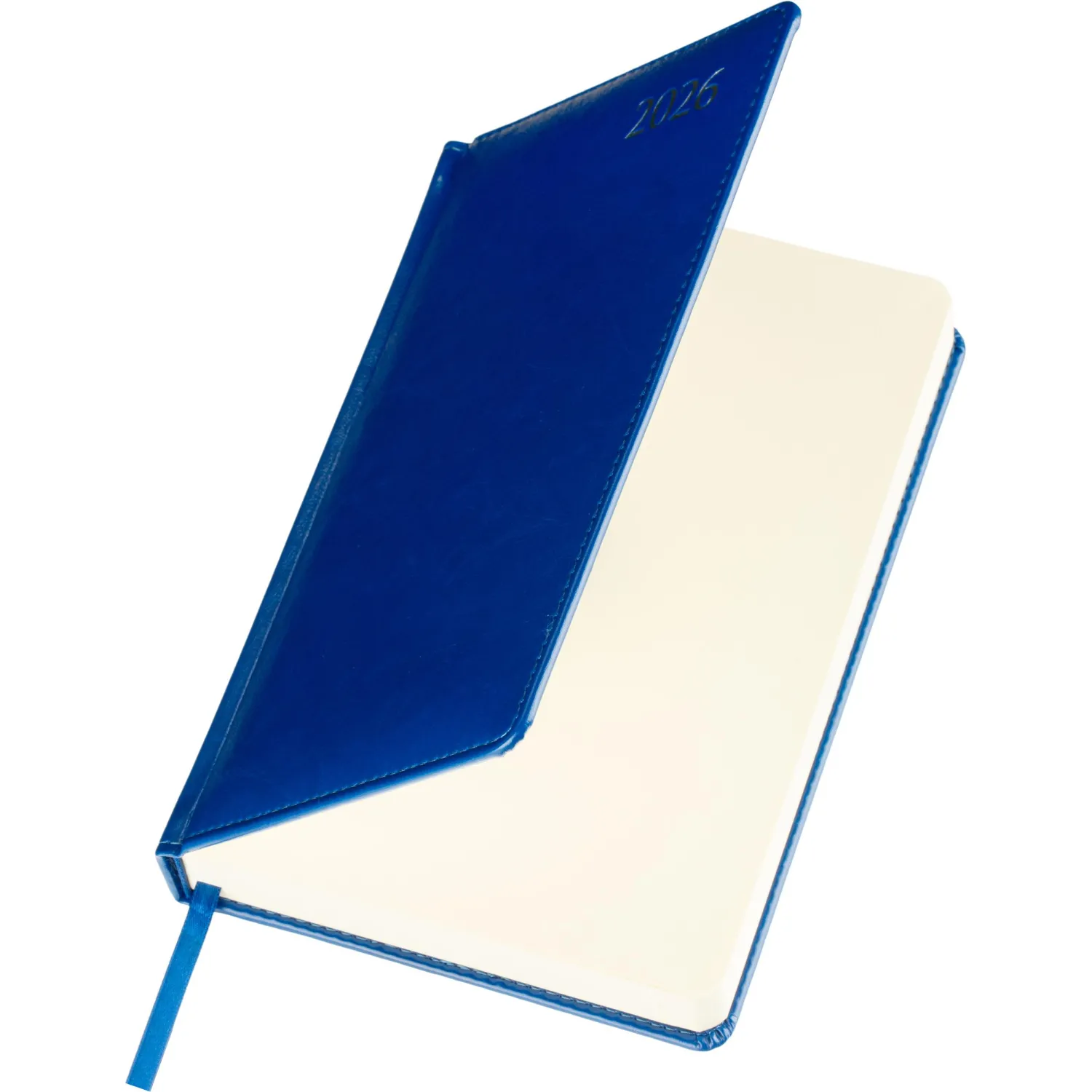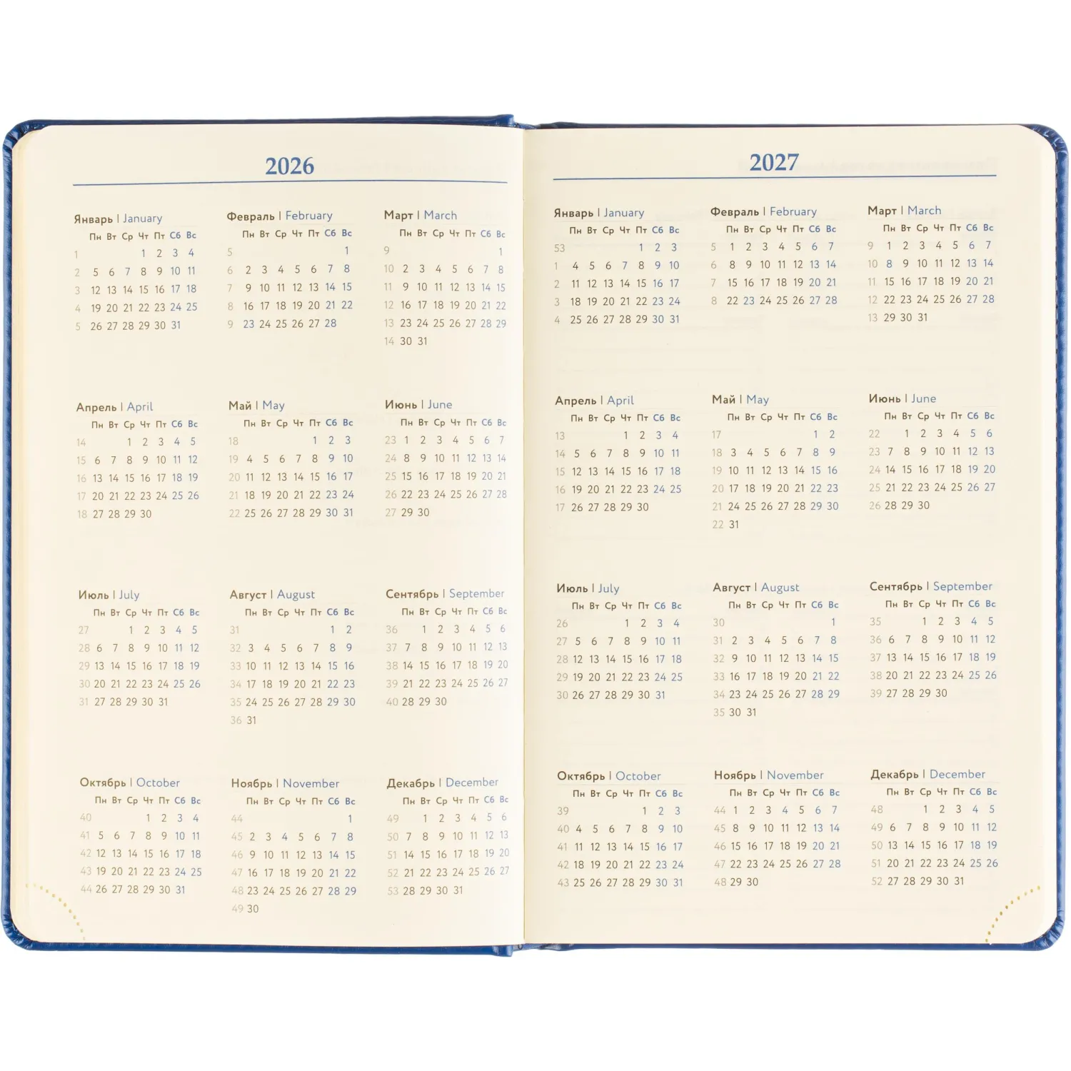 Ежедневник формата A5 предназначен для планирования и организации задач в течение 2026 года. Обложка выполнена из искусственной кожи тёмно-синего цвета с тиснением и однотонным дизайном. Твёрдый переплёт сохраняет форму изделия при повседневном использовании, а сшивка внутреннего блока обеспечивает его надёжность.