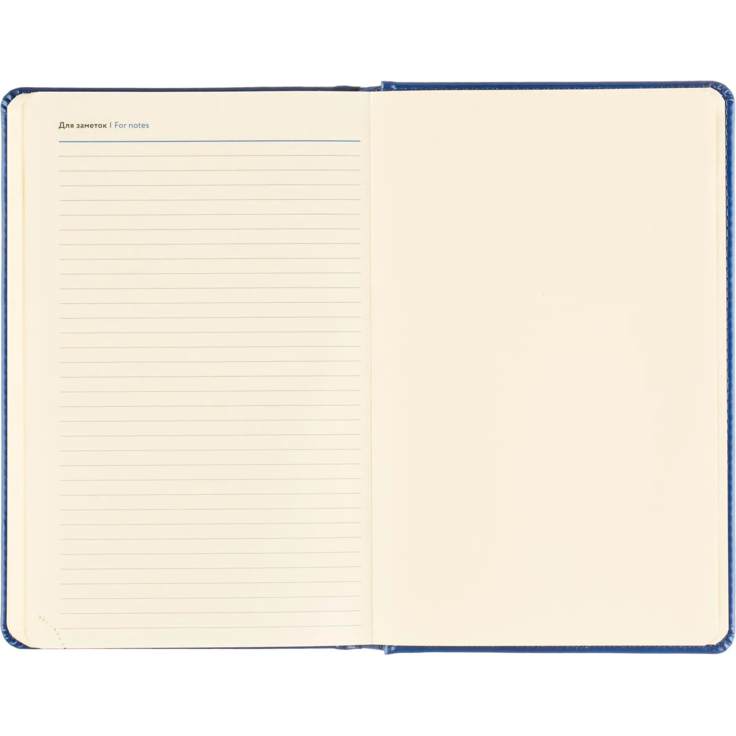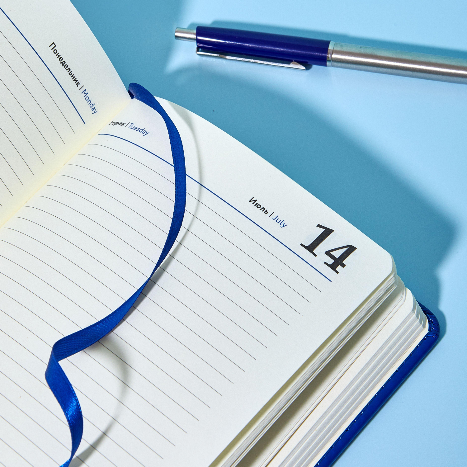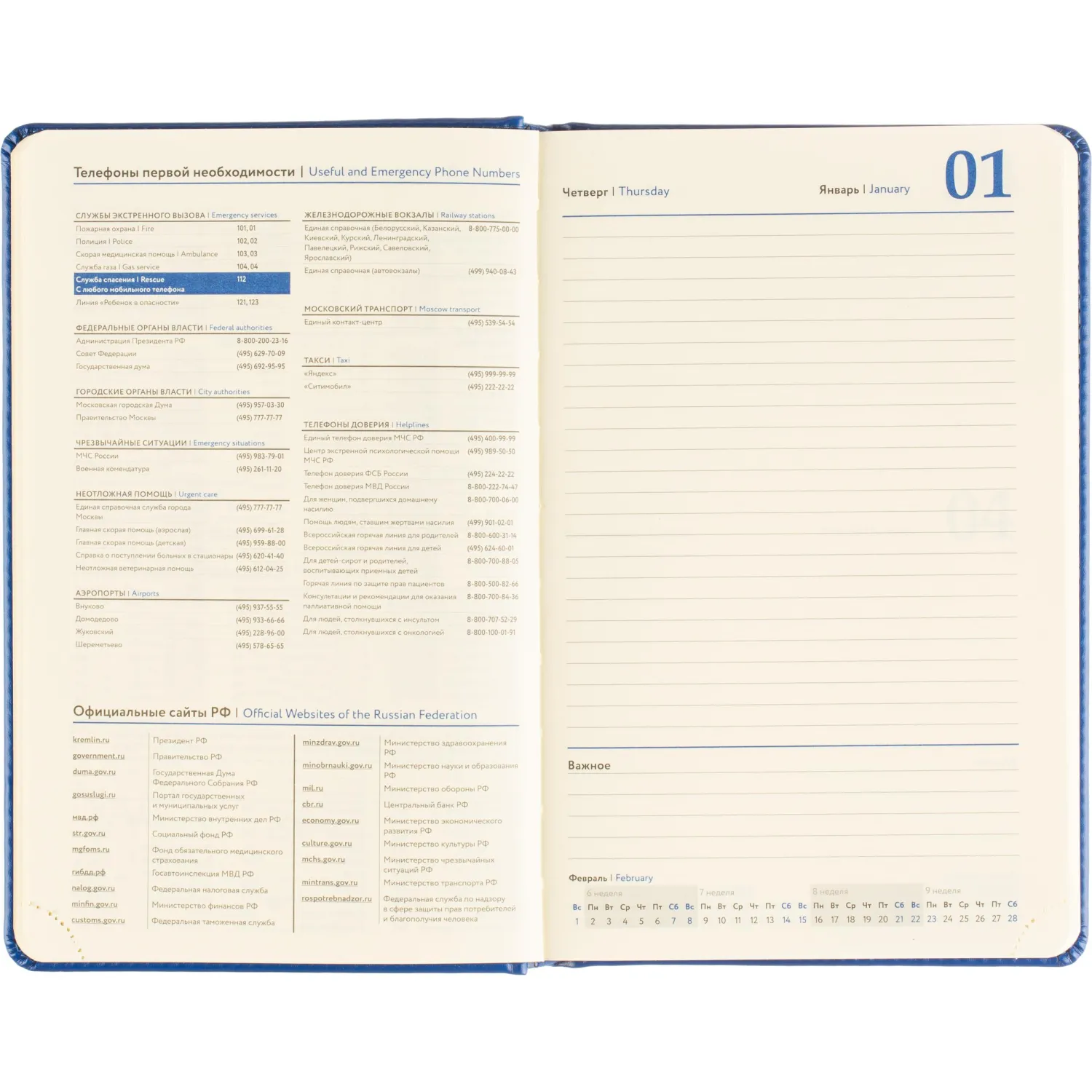 Ежедневник формата A5 предназначен для планирования и организации задач в течение 2026 года. Обложка выполнена из искусственной кожи тёмно-синего цвета с тиснением и однотонным дизайном. Твёрдый переплёт сохраняет форму изделия при повседневном использовании, а сшивка внутреннего блока обеспечивает его надёжность.