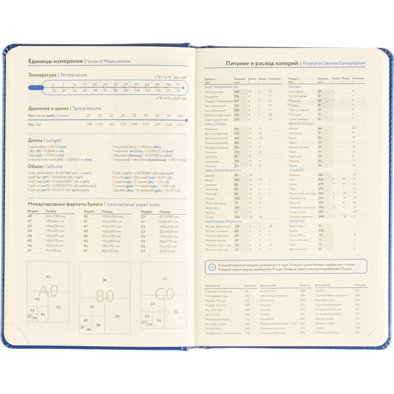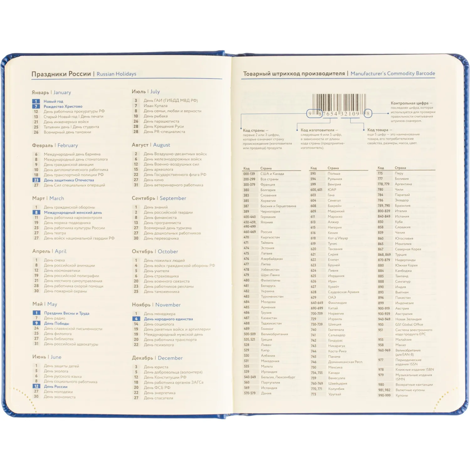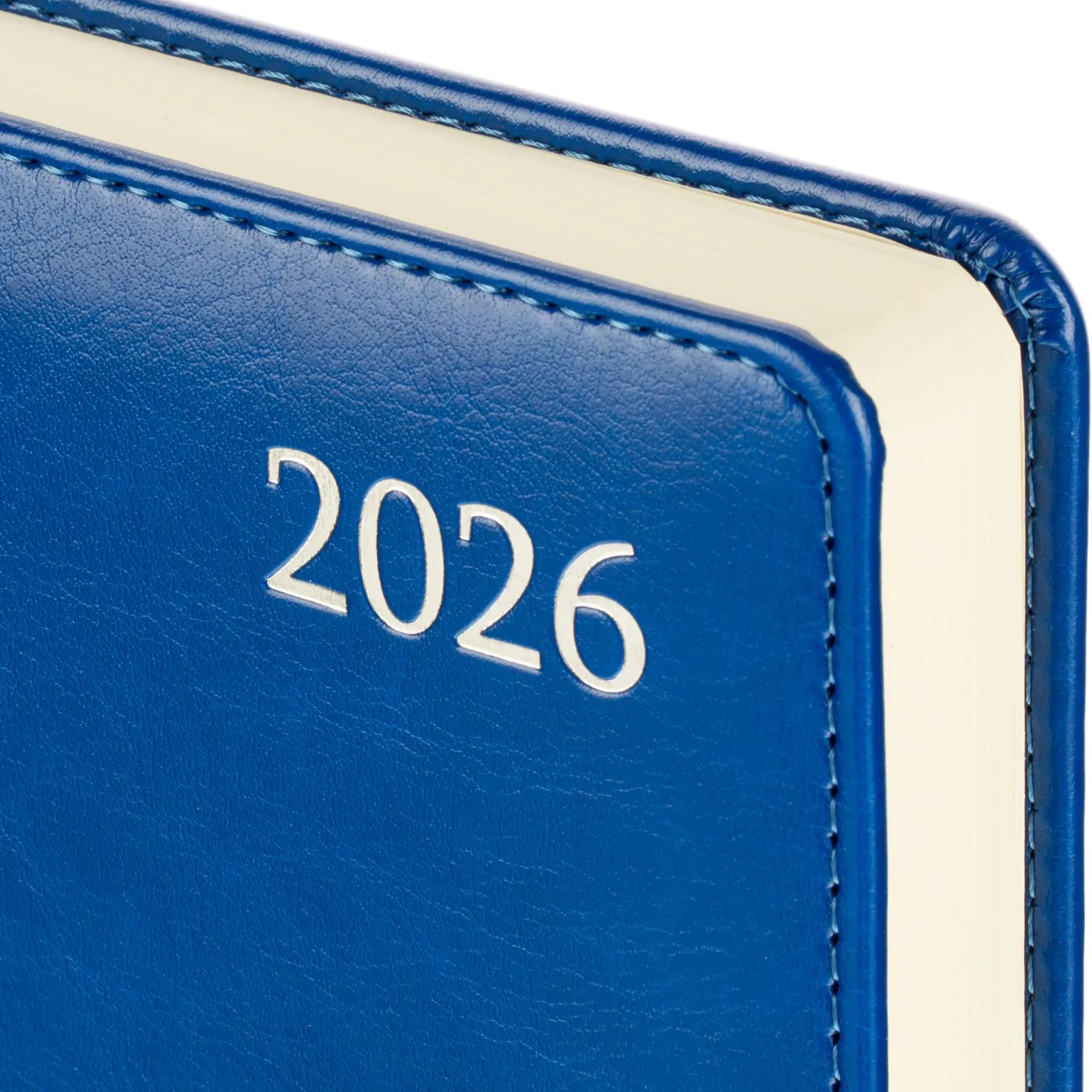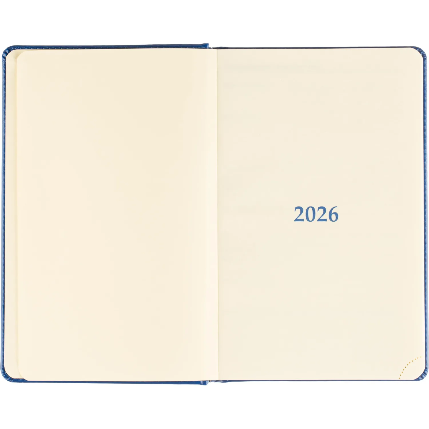 Ежедневник формата A5 предназначен для планирования и организации задач в течение 2026 года. Обложка выполнена из искусственной кожи тёмно-синего цвета с тиснением и однотонным дизайном. Твёрдый переплёт сохраняет форму изделия при повседневном использовании, а сшивка внутреннего блока обеспечивает его надёжность.