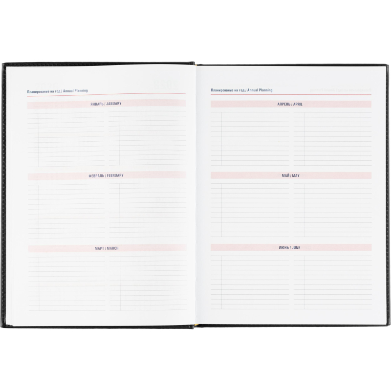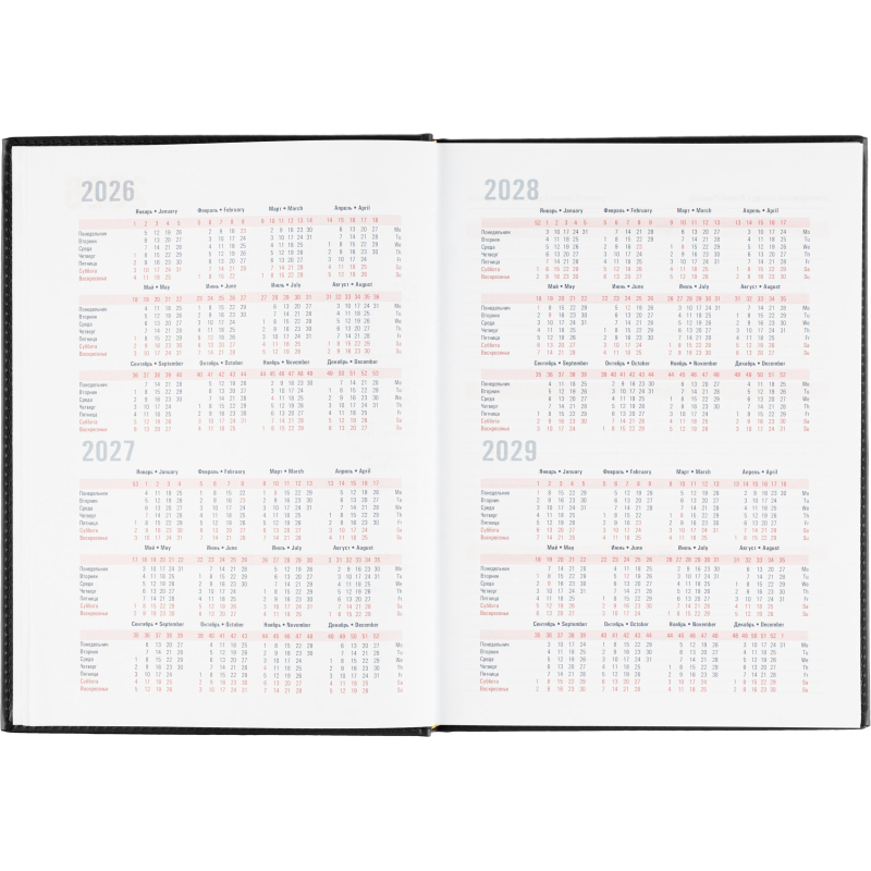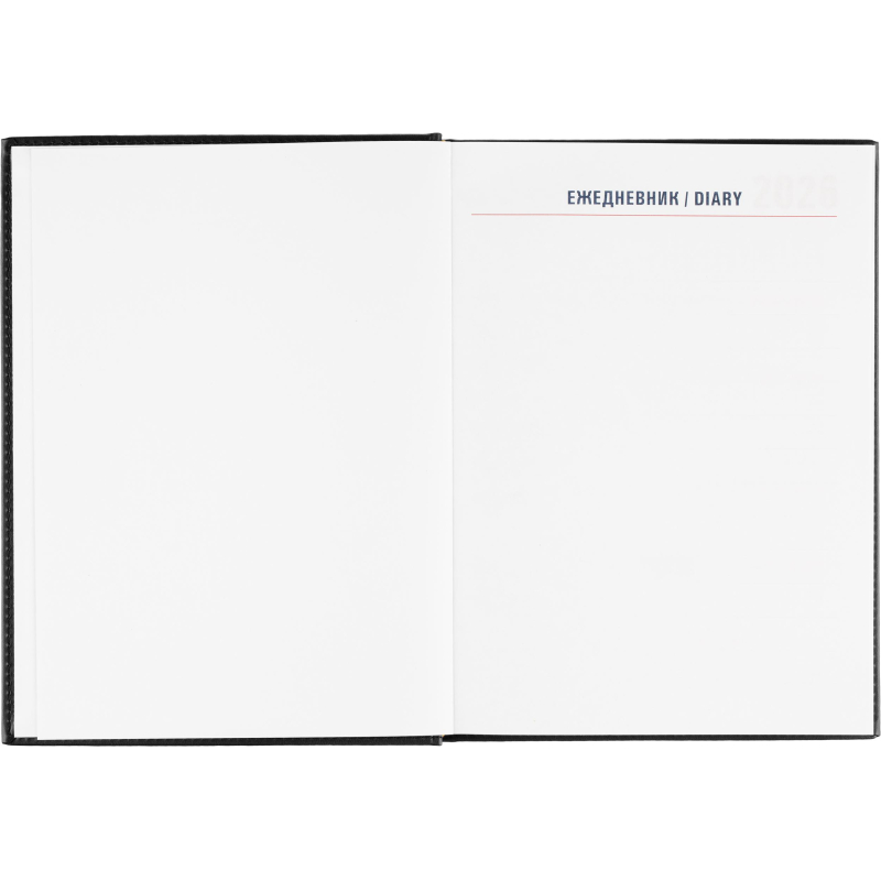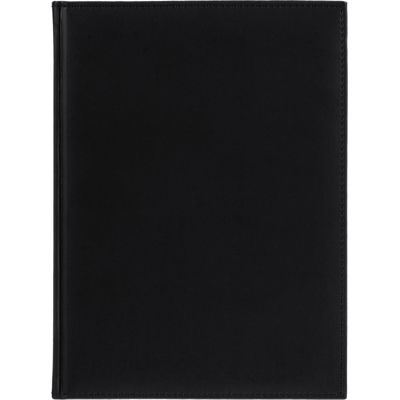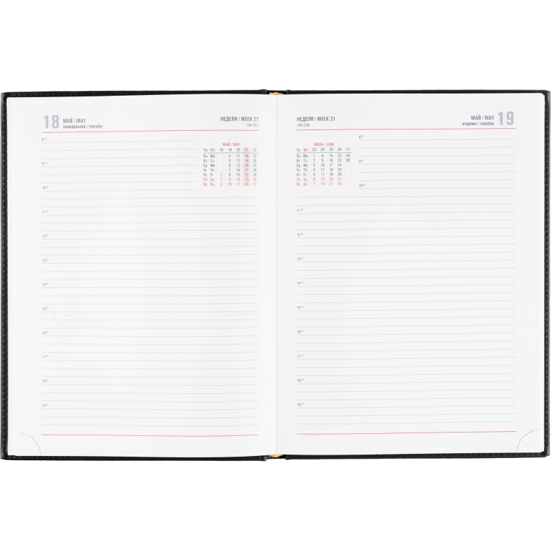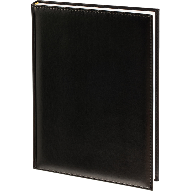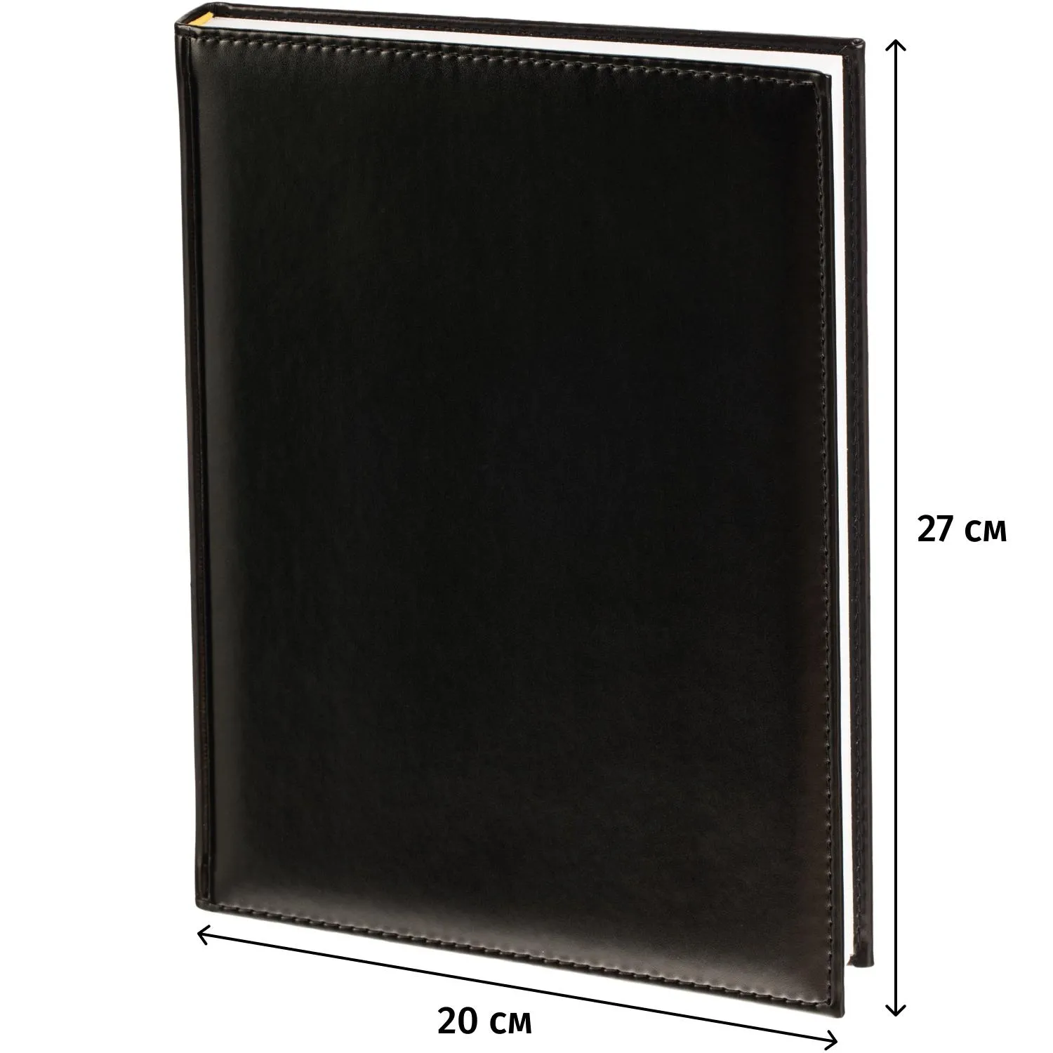 Ежедневник датированный на 2026 год. Формат: 200×270 мм. Цвет: черный. Блок 352 страницы (176 листов) в 2 краски. Бумага офсетная 70 г/кв.м. Блок с перфорацией уголка. Алфавитный блок без вырубки. Дополнительный блок со справочной информацией включает: календарь на 2026-2029 года, планирование на год, справочная информация, карта часовых поясов, лучшие места отдыха в зависимости от времени года, международные размеры одежды и обуви, символы по уходу за одеждой, знаки зодиака, питание и расход калорий. Закладка-ляссе. Твердая обложка с прошивкой по периметру выполнена из искусственной кожи высокого качества. Возможно нанесение логотипа на обложку, любым способом тиснения (блинт или фольга).