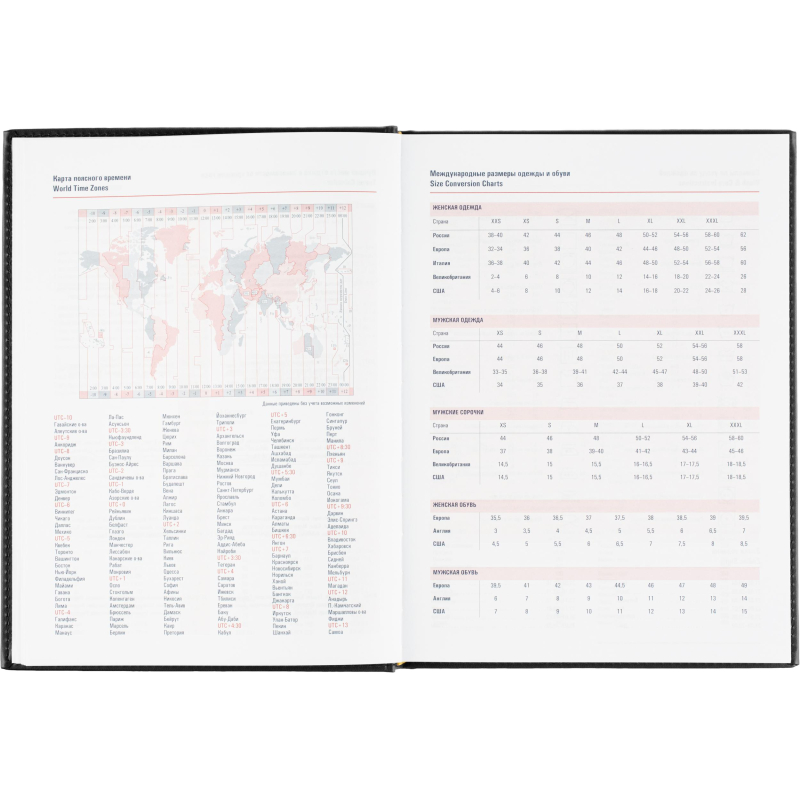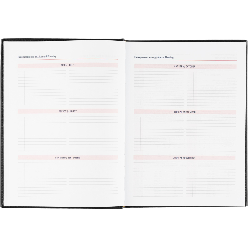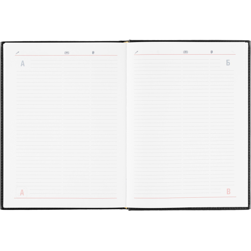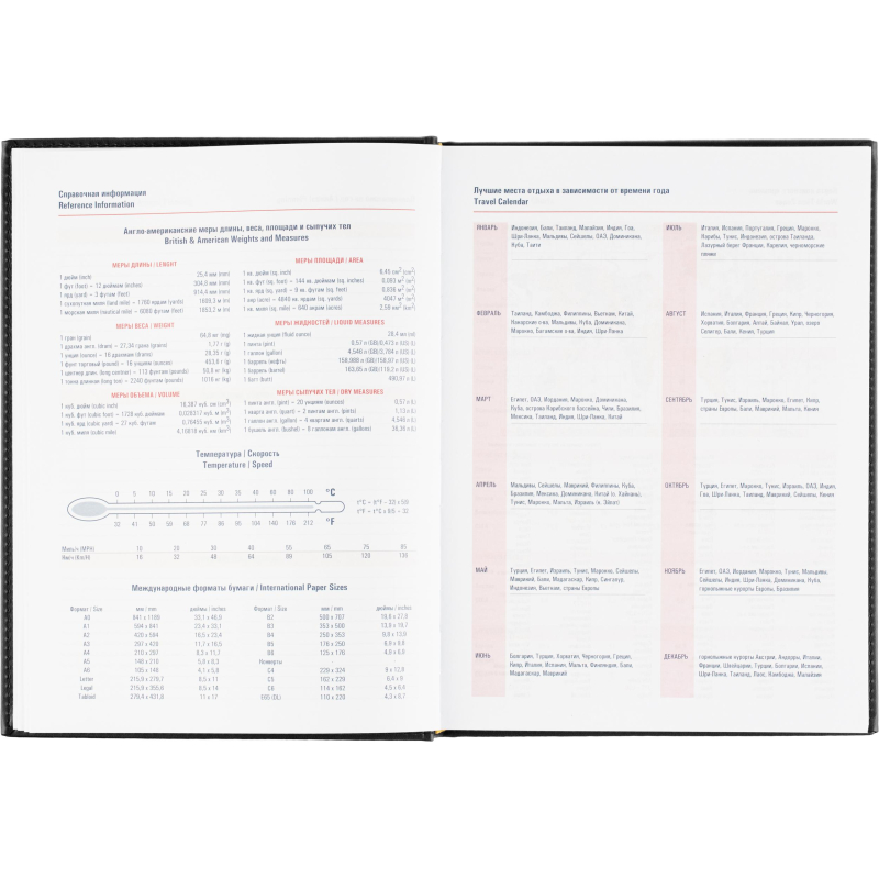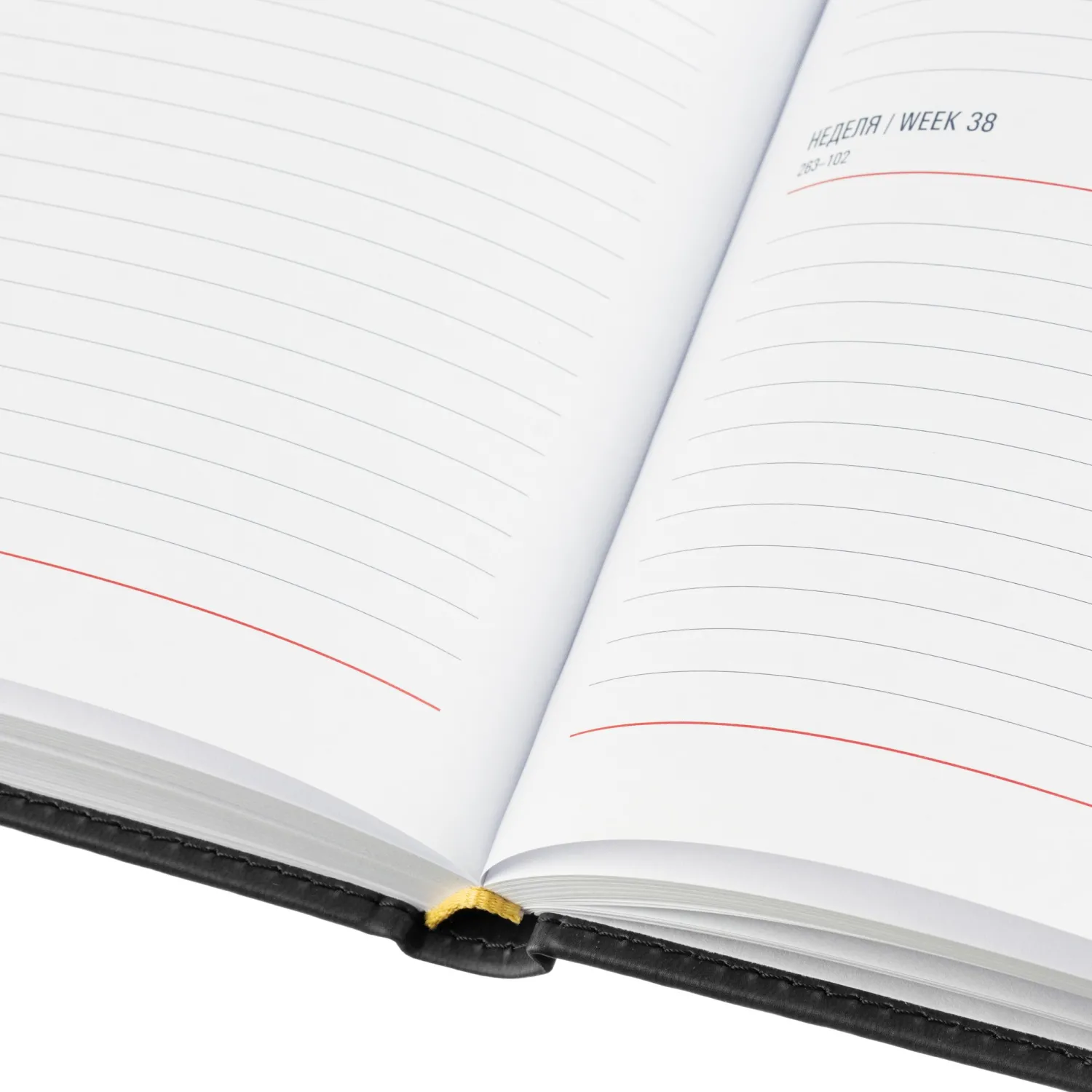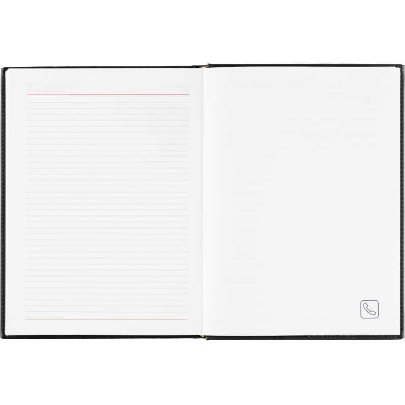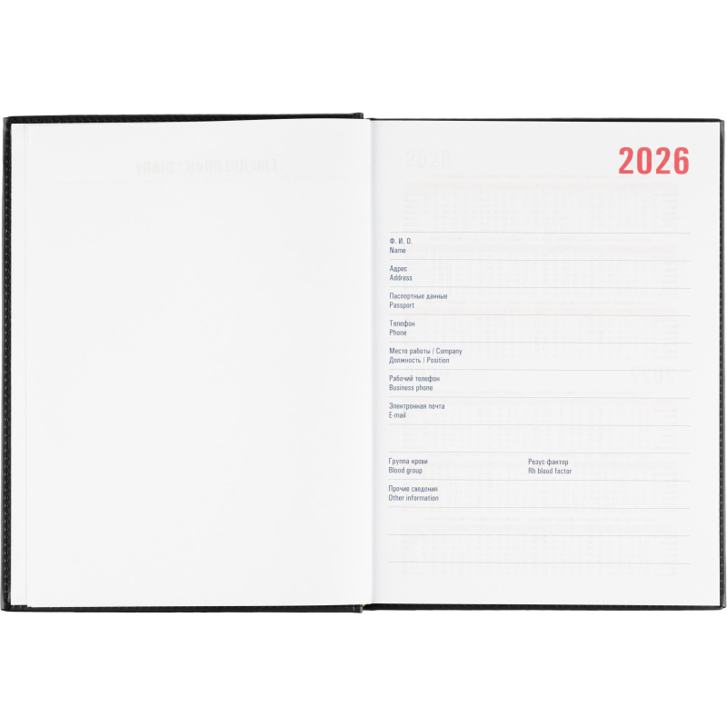 Ежедневник датированный на 2026 год. Формат: 200×270 мм. Цвет: черный. Блок 352 страницы (176 листов) в 2 краски. Бумага офсетная 70 г/кв.м. Блок с перфорацией уголка. Алфавитный блок без вырубки. Дополнительный блок со справочной информацией включает: календарь на 2026-2029 года, планирование на год, справочная информация, карта часовых поясов, лучшие места отдыха в зависимости от времени года, международные размеры одежды и обуви, символы по уходу за одеждой, знаки зодиака, питание и расход калорий. Закладка-ляссе. Твердая обложка с прошивкой по периметру выполнена из искусственной кожи высокого качества. Возможно нанесение логотипа на обложку, любым способом тиснения (блинт или фольга).