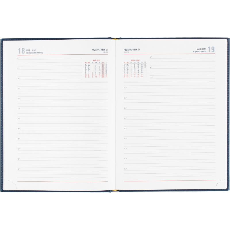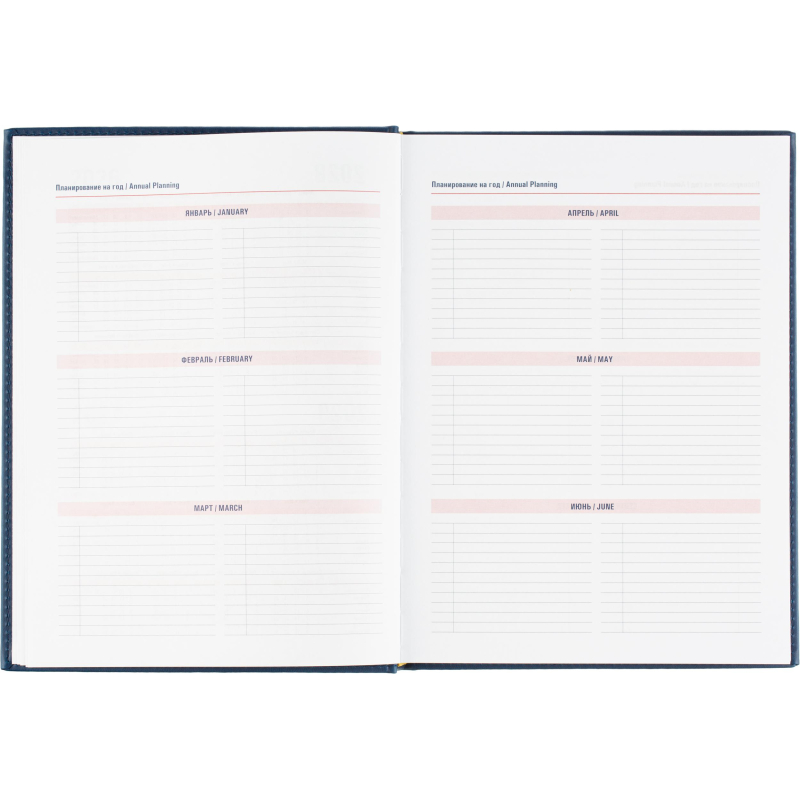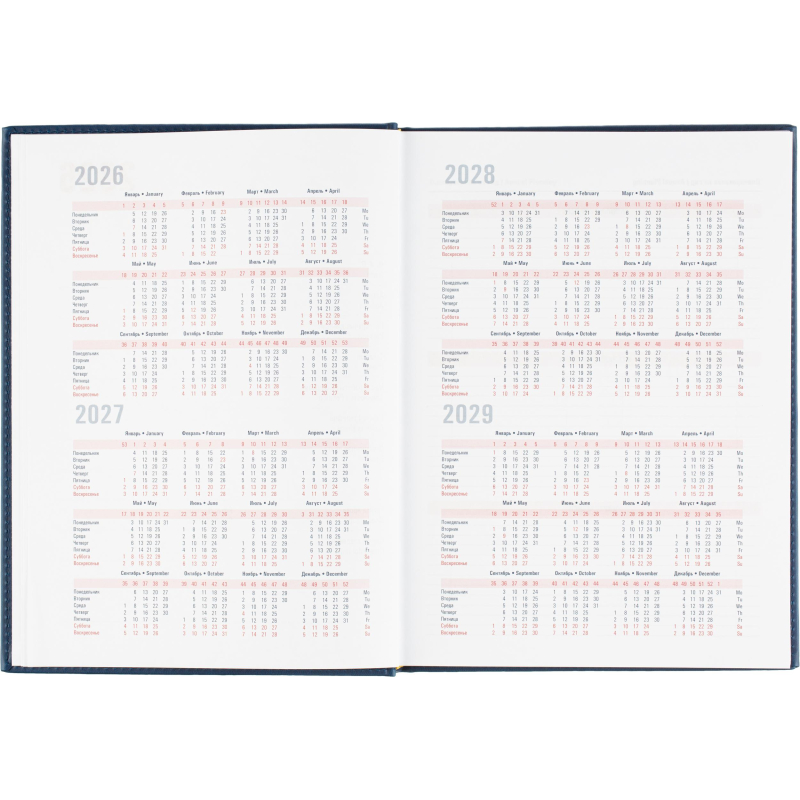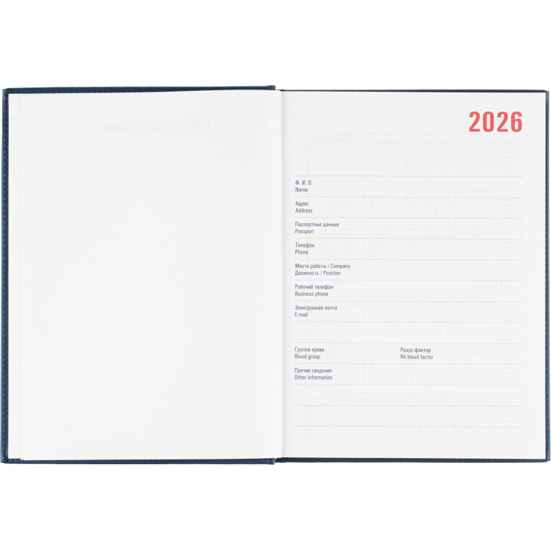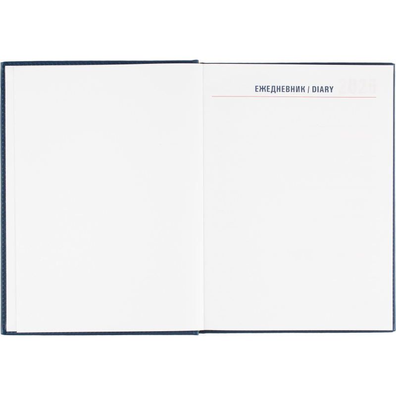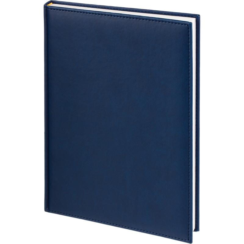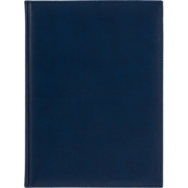 Ежедневник датированный на 2026 год. Формат: 200×270 мм. Цвет: синий. Блок 352 страницы (176 листов) в 2 краски. Бумага офсетная 70 г/кв.м. Блок с перфорацией уголка. Алфавитный блок без вырубки. Дополнительный блок со справочной информацией включает: календарь на 2026-2029 года, планирование на год, справочная информация, карта часовых поясов, лучшие места отдыха в зависимости от времени года, международные размеры одежды и обуви, символы по уходу за одеждой, знаки зодиака, питание и расход калорий. Закладка-ляссе. Твердая обложка с прошивкой по периметру выполнена из искусственной кожи высокого качества. Возможно нанесение логотипа на обложку, любым способом тиснения (блинт или фольга).