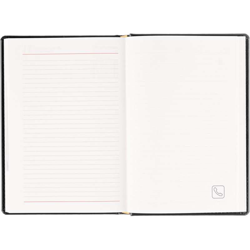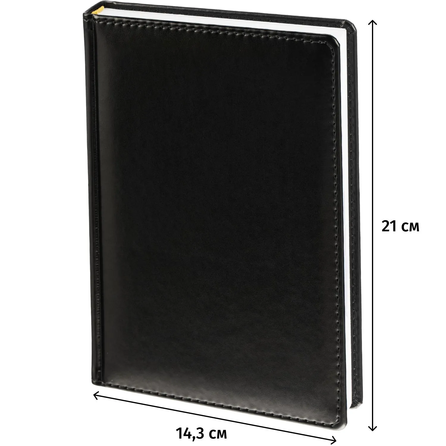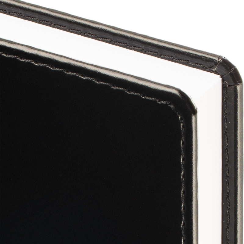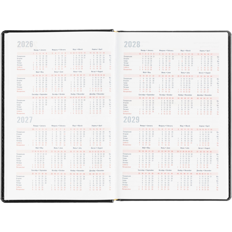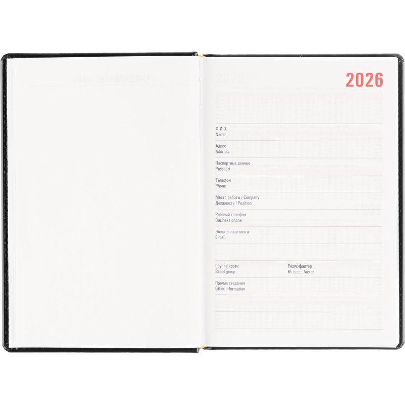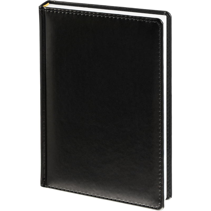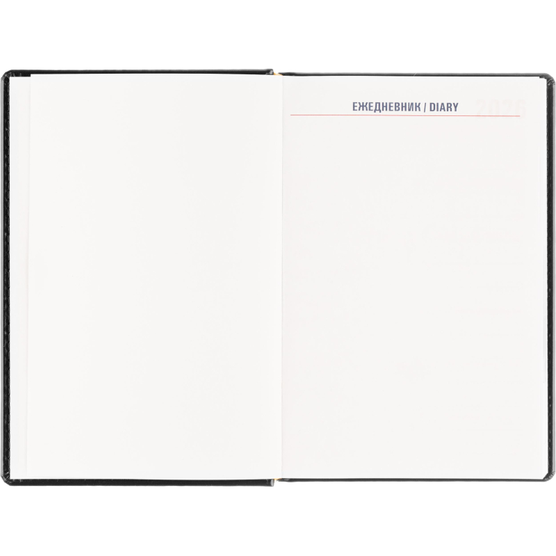 Ежедневник датированный на 2026 год. Формат: 143×210 мм. Цвет: черный. Блок 360 страниц (180 листов) в 2 краски. Бумага офсетная 70 г/кв.м. Блок с перфорацией уголка. Вырубка блока по месяцам. Дополнительный блок со справочной информацией включает: календарь на 2026-2029 года, планирование на год, справочная информация, карта часовых поясов, лучшие места отдыха в зависимости от времени года, международные размеры одежды и обуви, символы по уходу за одеждой, знаки зодиака, питание и расход калорий. Закладка-ляссе. Твердая обложка с прошивкой по периметру, выполнена из искусственной кожи высокого качества. Возможно нанесение логотипа на обложку, любым способом тиснения (блинт или фольга).