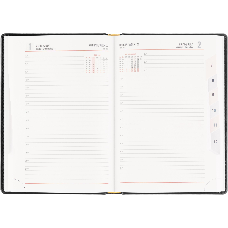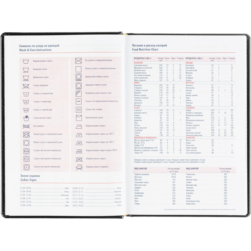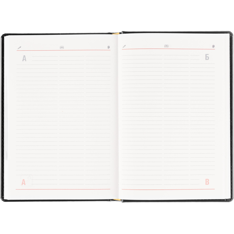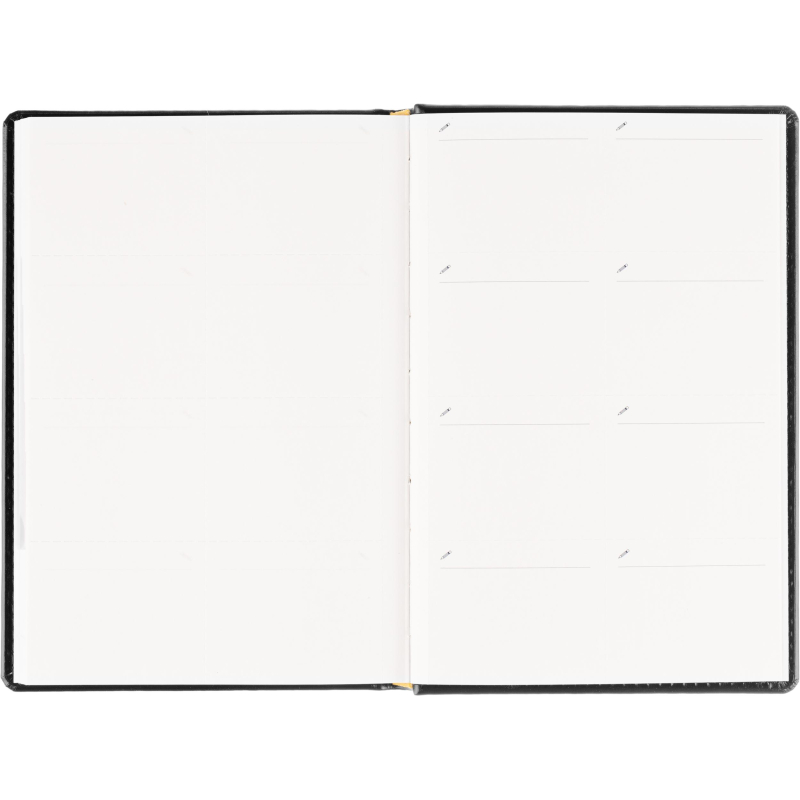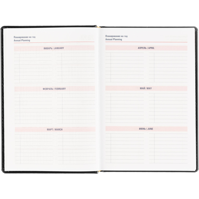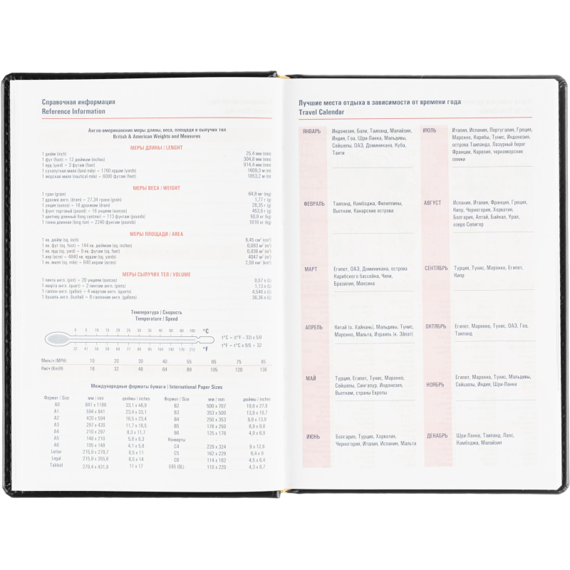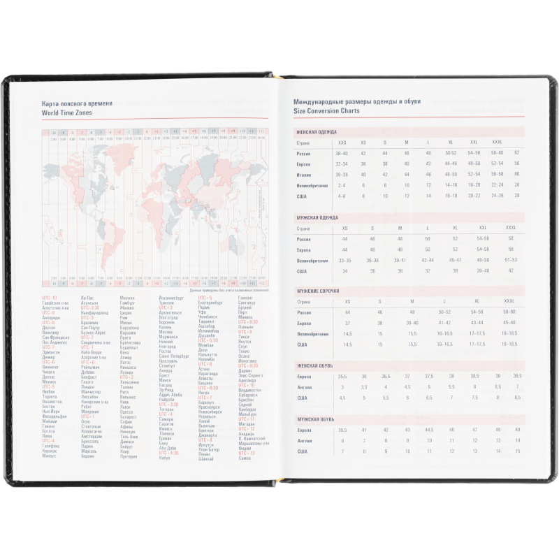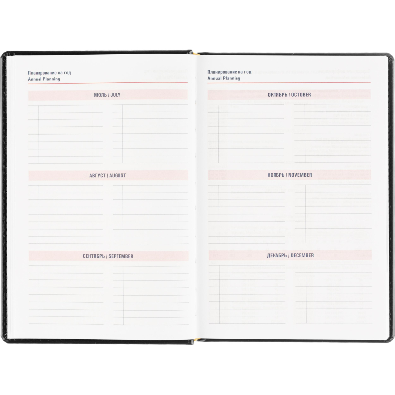 Ежедневник датированный на 2026 год. Формат: 143×210 мм. Цвет: черный. Блок 360 страниц (180 листов) в 2 краски. Бумага офсетная 70 г/кв.м. Блок с перфорацией уголка. Вырубка блока по месяцам. Дополнительный блок со справочной информацией включает: календарь на 2026-2029 года, планирование на год, справочная информация, карта часовых поясов, лучшие места отдыха в зависимости от времени года, международные размеры одежды и обуви, символы по уходу за одеждой, знаки зодиака, питание и расход калорий. Закладка-ляссе. Твердая обложка с прошивкой по периметру, выполнена из искусственной кожи высокого качества. Возможно нанесение логотипа на обложку, любым способом тиснения (блинт или фольга).