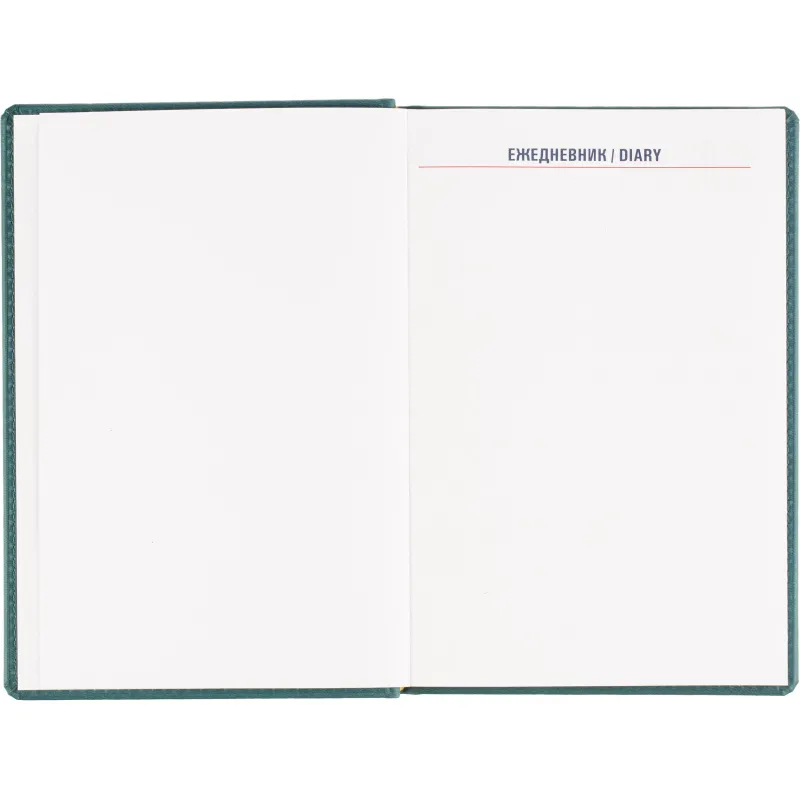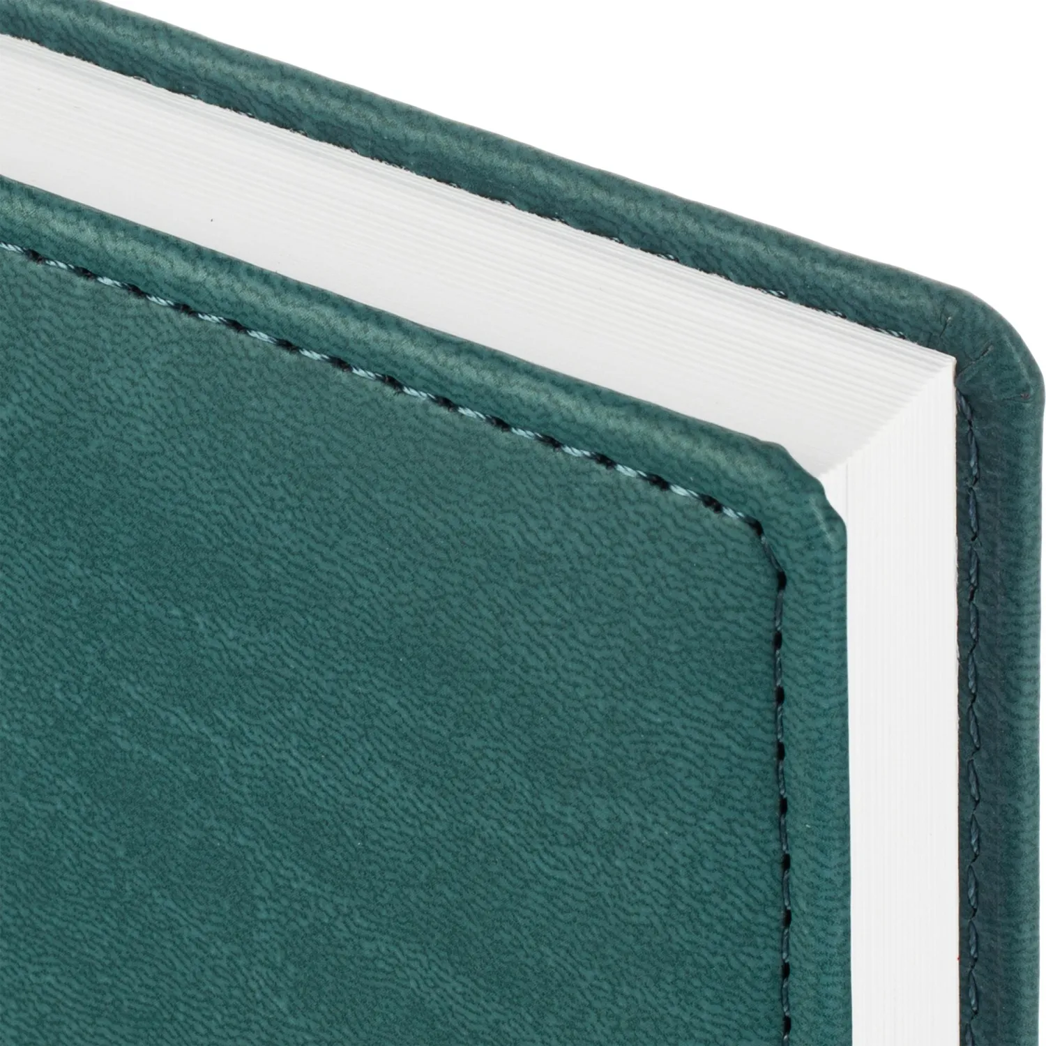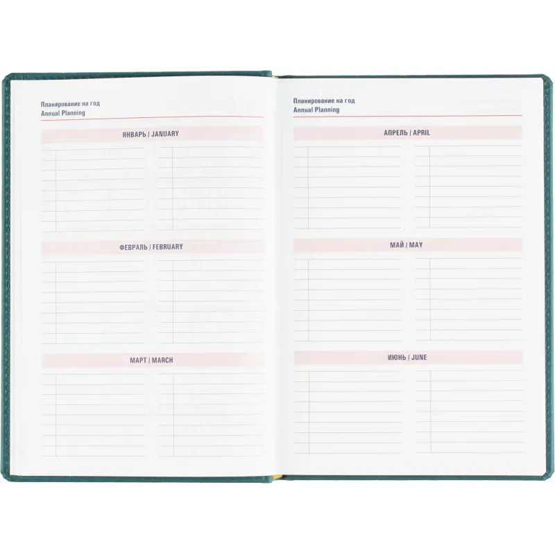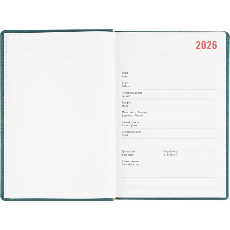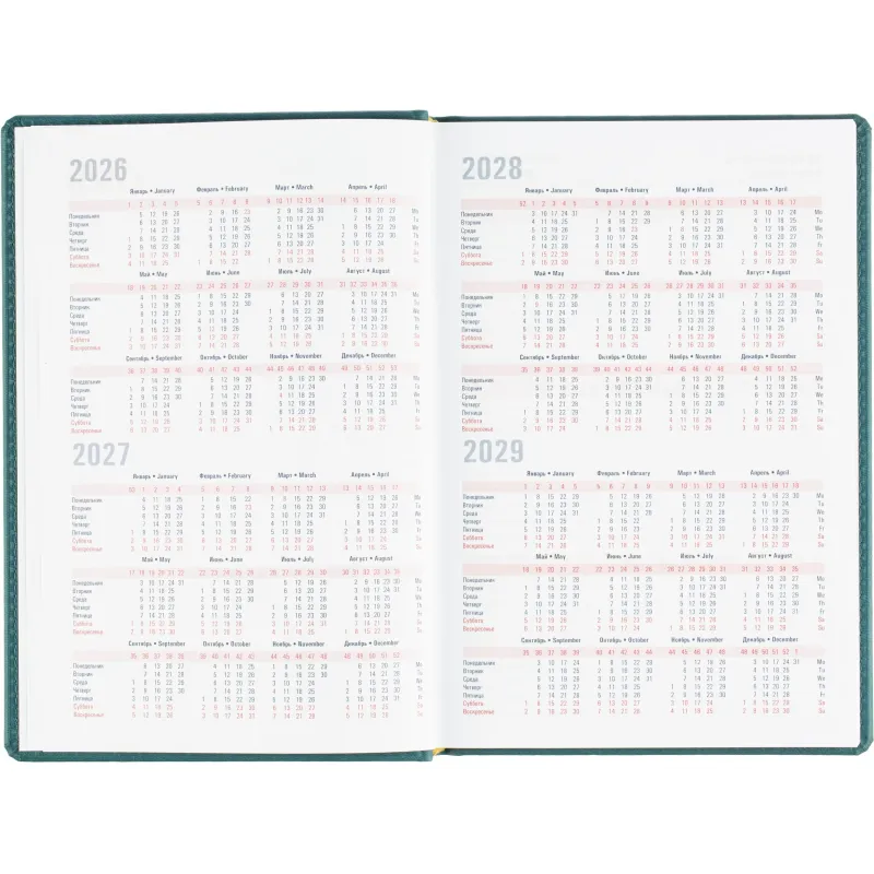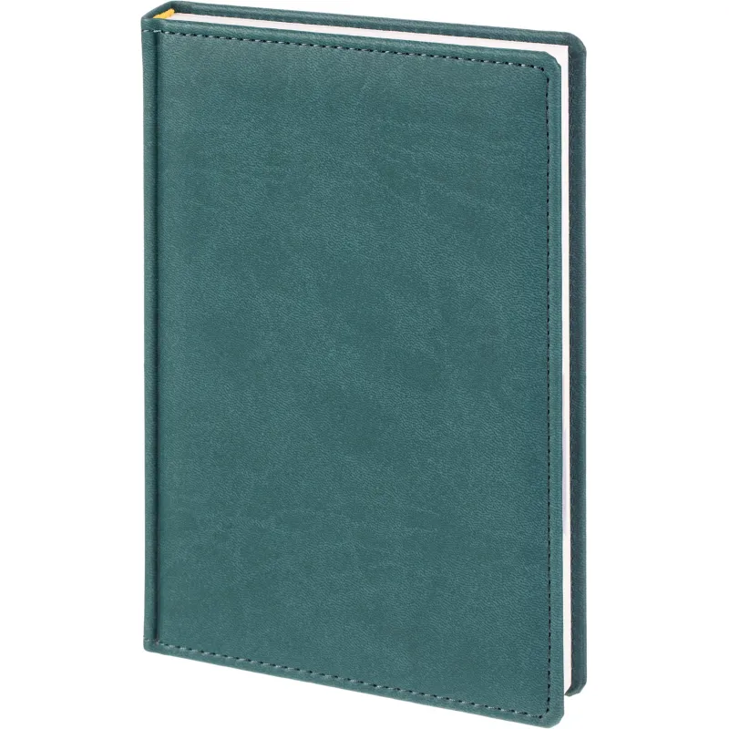 Ежедневник датированный на 2026 год. Формат: 143×210 мм. Цвет: бирюзовый. Блок 360 страниц (180 листов) в 2 краски. Бумага офсетная 70 г/кв.м. Блок с перфорацией уголка. Вырубка блока по месяцам. Дополнительный блок со справочной информацией включает: календарь на 2026-2029 года, планирование на год, справочная информация, карта часовых поясов, лучшие места отдыха в зависимости от времени года, международные размеры одежды и обуви, символы по уходу за одеждой, знаки зодиака, питание и расход калорий. Закладка-ляссе. Твердая обложка с прошивкой по периметру, выполнена из искусственной кожи высокого качества. Возможно нанесение логотипа на обложку, любым способом тиснения (блинт или фольга).