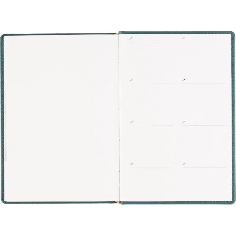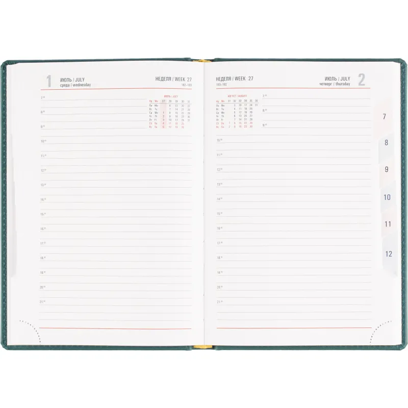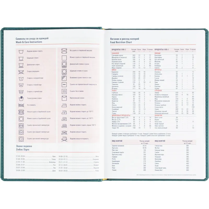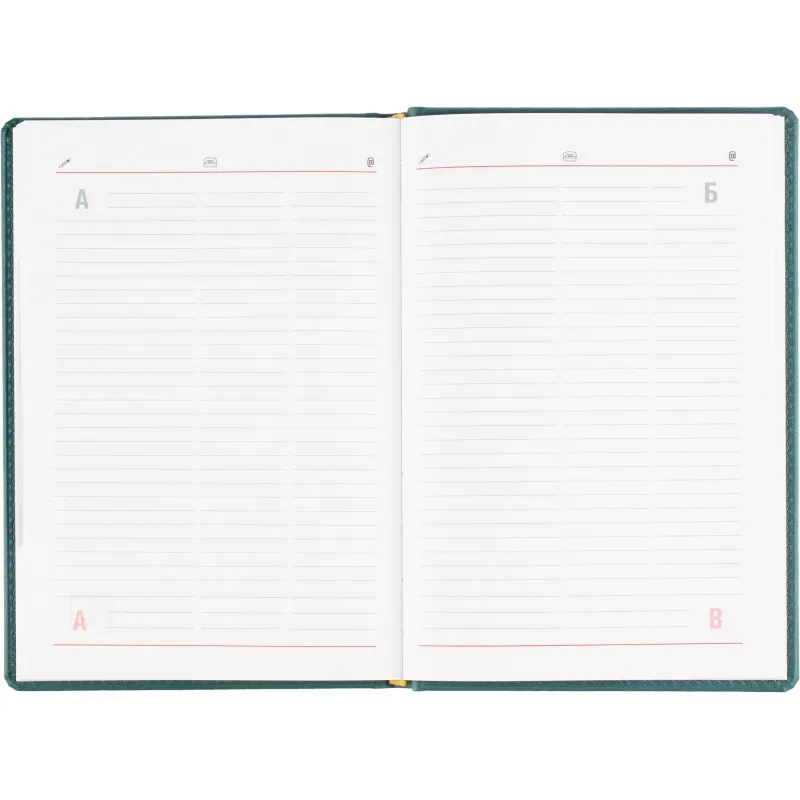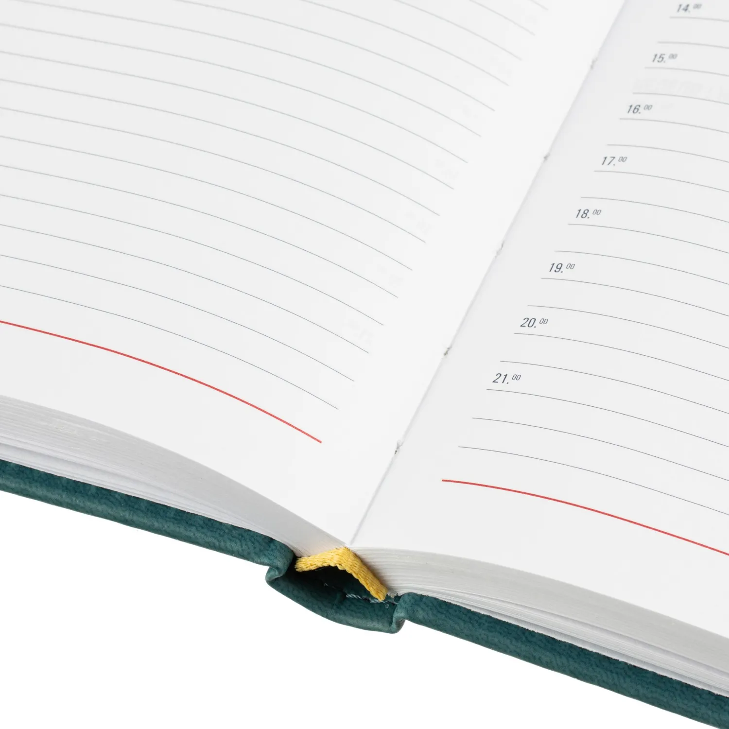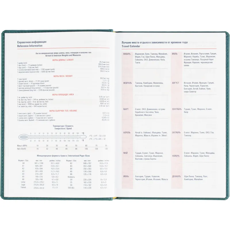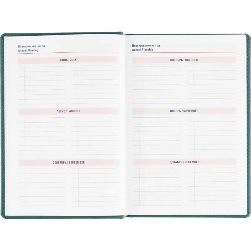 Ежедневник датированный на 2026 год. Формат: 143×210 мм. Цвет: бирюзовый. Блок 360 страниц (180 листов) в 2 краски. Бумага офсетная 70 г/кв.м. Блок с перфорацией уголка. Вырубка блока по месяцам. Дополнительный блок со справочной информацией включает: календарь на 2026-2029 года, планирование на год, справочная информация, карта часовых поясов, лучшие места отдыха в зависимости от времени года, международные размеры одежды и обуви, символы по уходу за одеждой, знаки зодиака, питание и расход калорий. Закладка-ляссе. Твердая обложка с прошивкой по периметру, выполнена из искусственной кожи высокого качества. Возможно нанесение логотипа на обложку, любым способом тиснения (блинт или фольга).