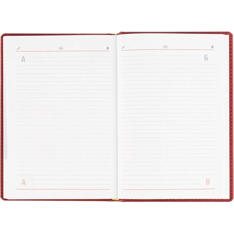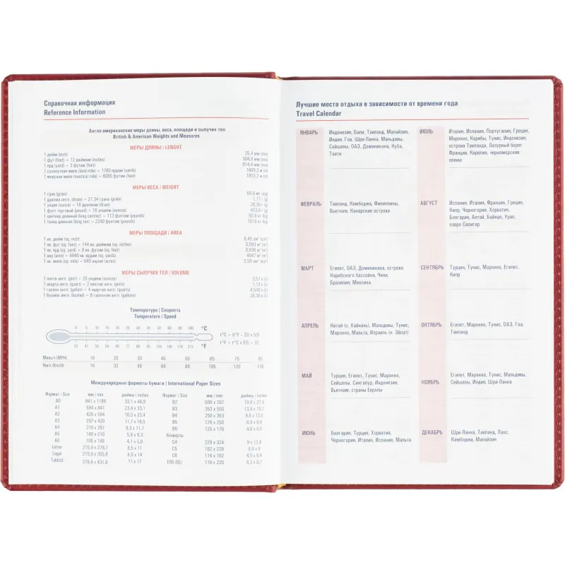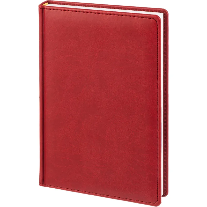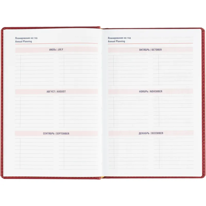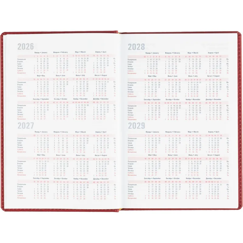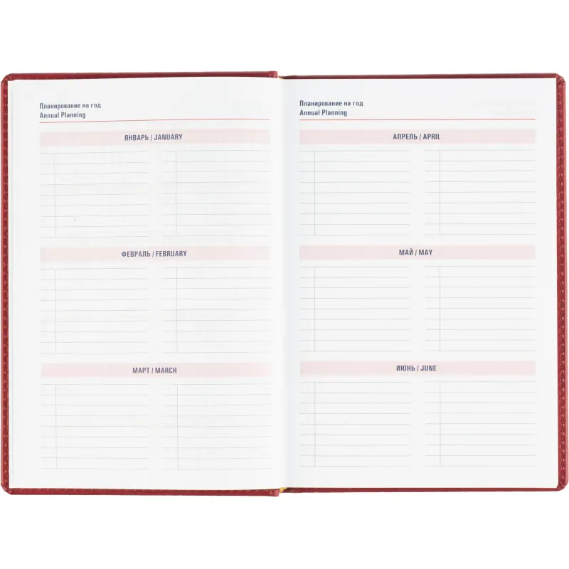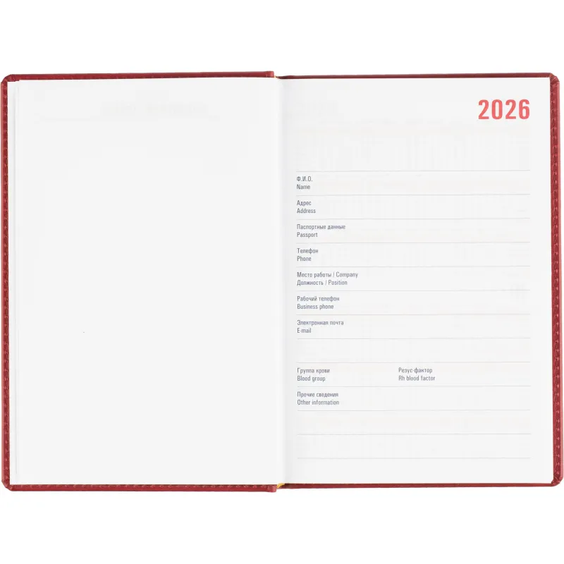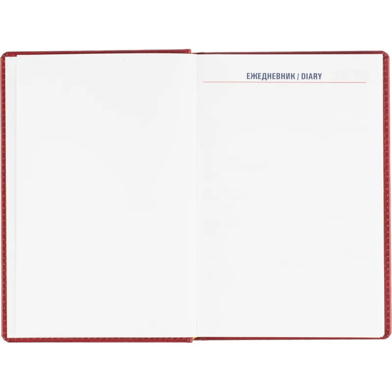 Ежедневник датированный на 2026 год. Формат: 143×210 мм. Цвет: бордовый. Блок 360 страниц (180 листов) в 2 краски. Бумага офсетная 70 г/кв.м. Блок с перфорацией уголка. Вырубка блока по месяцам. Дополнительный блок со справочной информацией включает: календарь на 2026-2029 года, планирование на год, справочная информация, карта часовых поясов, лучшие места отдыха в зависимости от времени года, международные размеры одежды и обуви, символы по уходу за одеждой, знаки зодиака, питание и расход калорий. Закладка-ляссе. Твердая обложка с прошивкой по периметру, выполнена из искусственной кожи высокого качества. Возможно нанесение логотипа на обложку, любым способом тиснения (блинт или фольга).