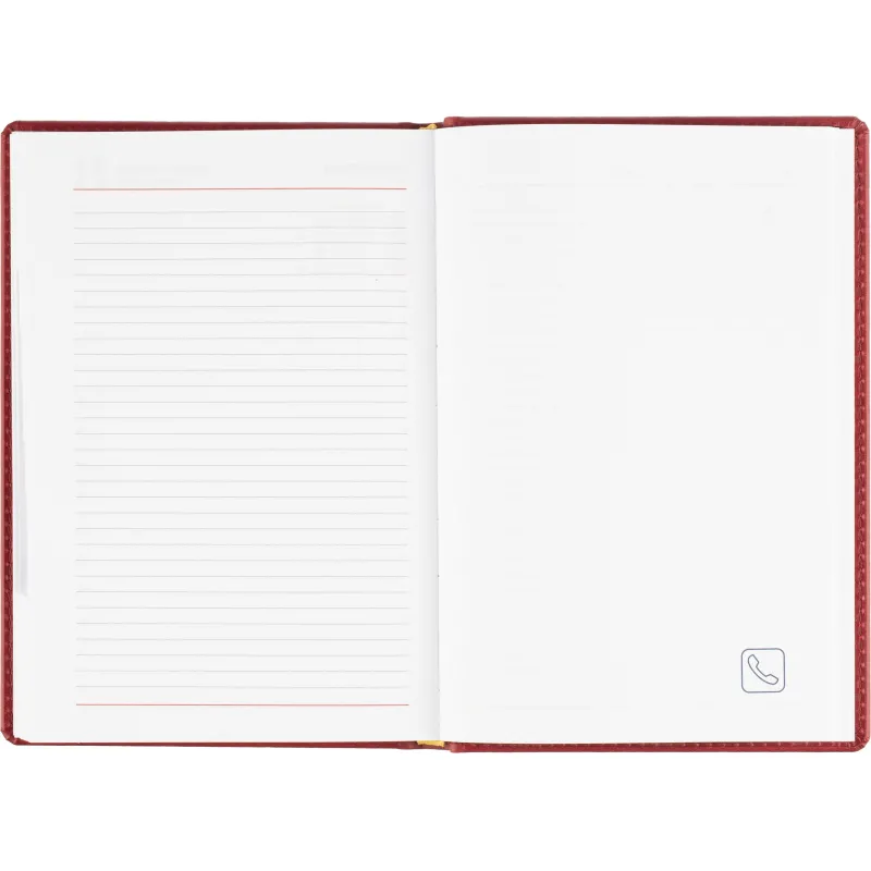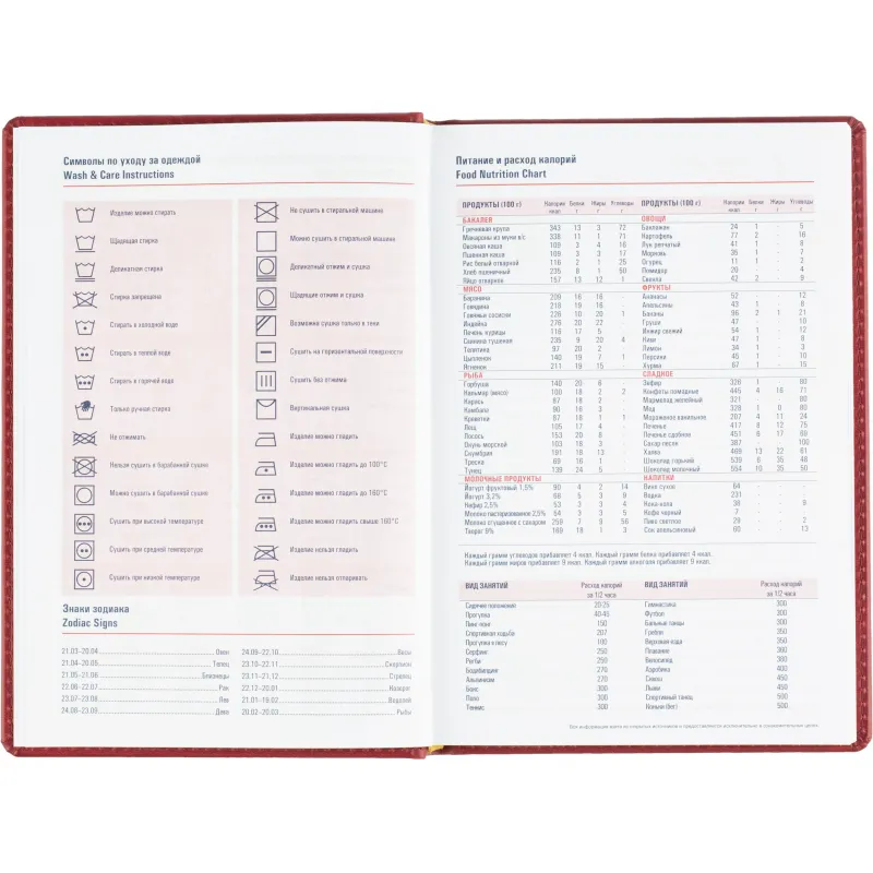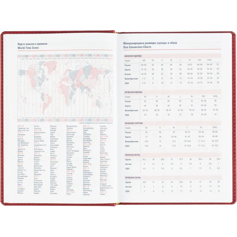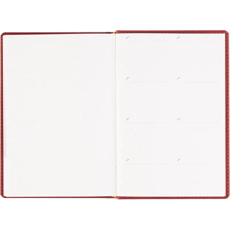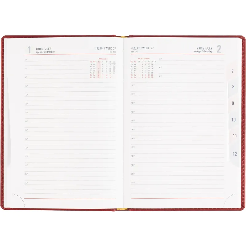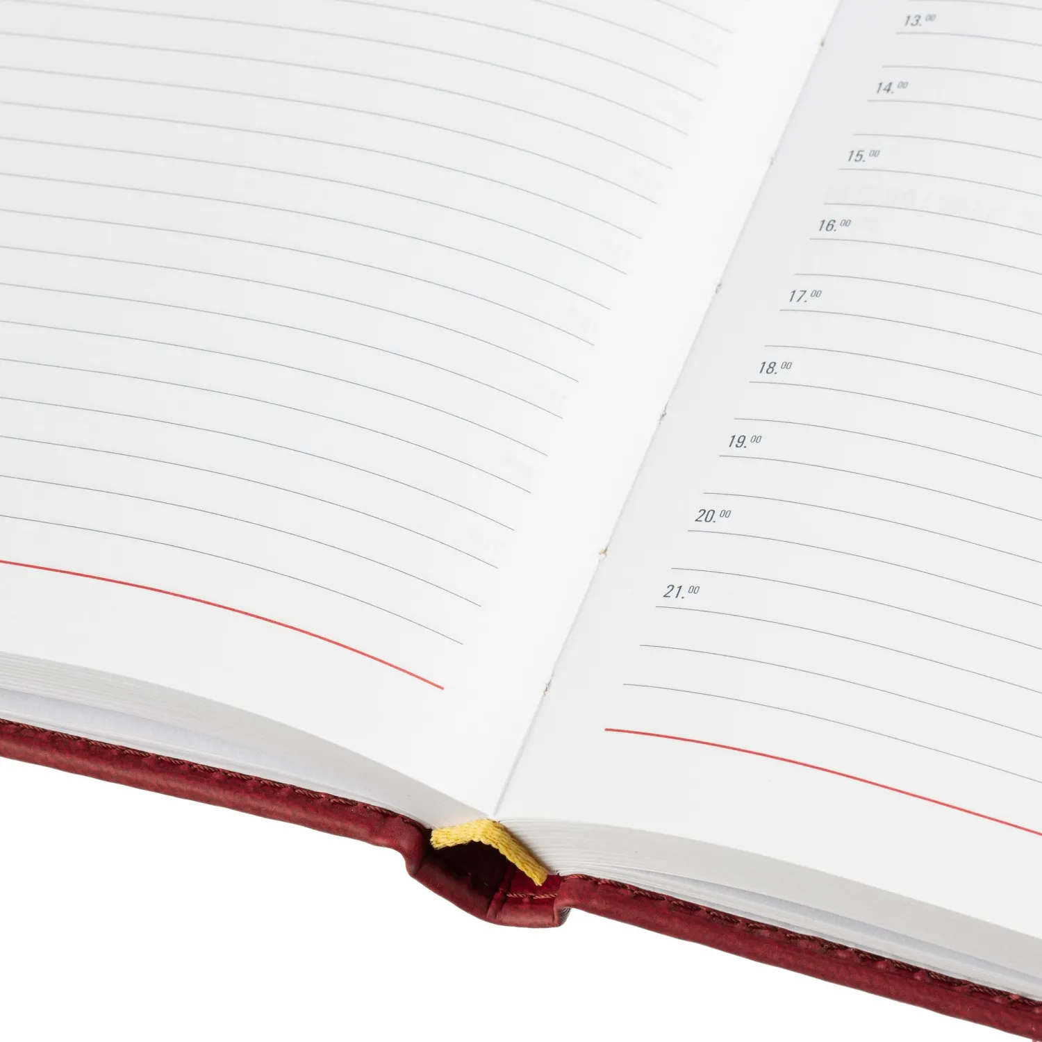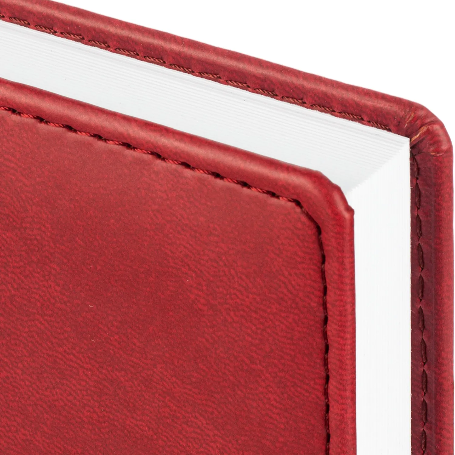 Ежедневник датированный на 2026 год. Формат: 143×210 мм. Цвет: бордовый. Блок 360 страниц (180 листов) в 2 краски. Бумага офсетная 70 г/кв.м. Блок с перфорацией уголка. Вырубка блока по месяцам. Дополнительный блок со справочной информацией включает: календарь на 2026-2029 года, планирование на год, справочная информация, карта часовых поясов, лучшие места отдыха в зависимости от времени года, международные размеры одежды и обуви, символы по уходу за одеждой, знаки зодиака, питание и расход калорий. Закладка-ляссе. Твердая обложка с прошивкой по периметру, выполнена из искусственной кожи высокого качества. Возможно нанесение логотипа на обложку, любым способом тиснения (блинт или фольга).