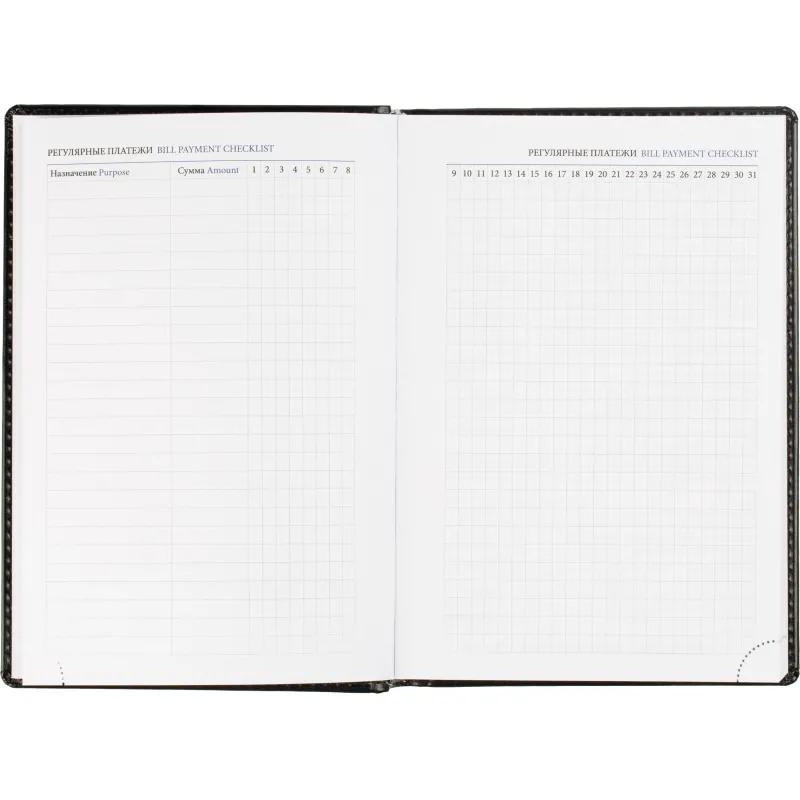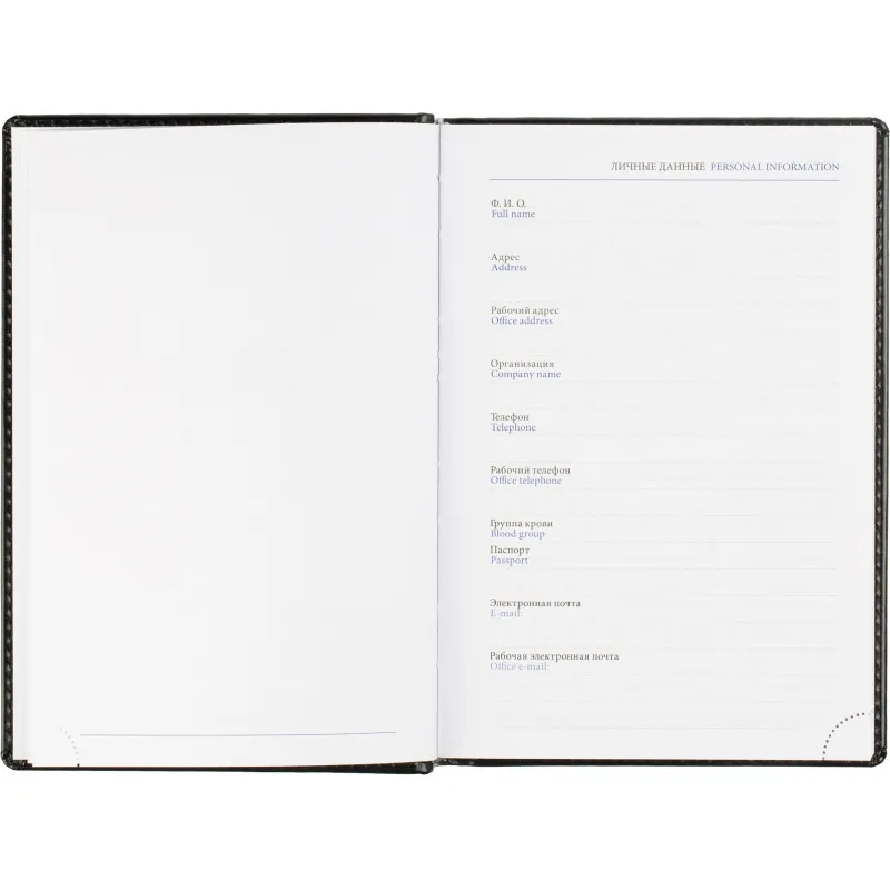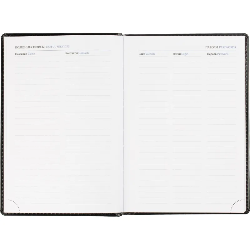 Ежедневник содержит информационно-справочный блок, включая личные данные, праздники, дни рождения и полезные сервисы. Блок также оснащен местами для записи регулярных платежей, важных телефонов и различных измерений. Перфорация уголка упрощает использование и добавляет удобства.