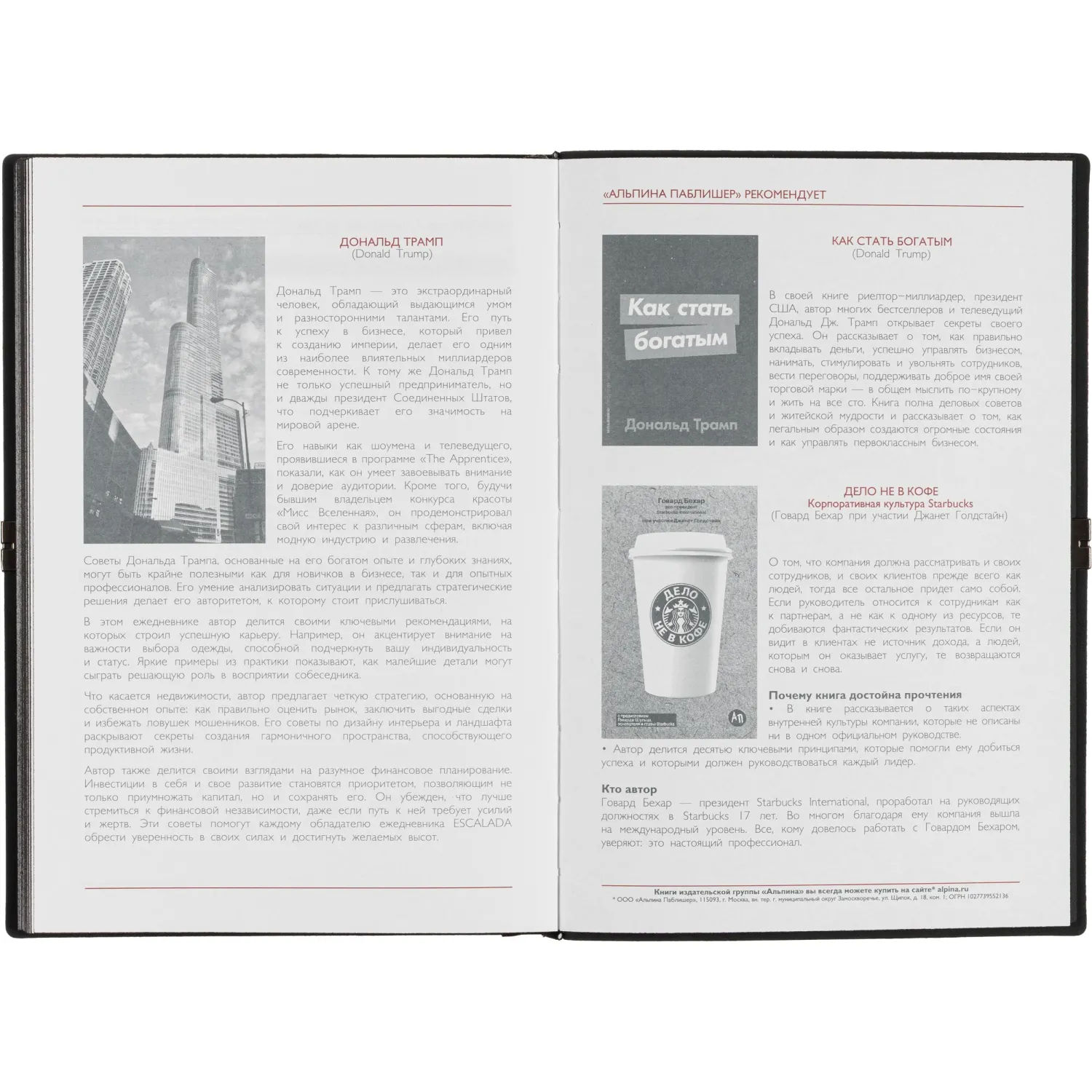 Обложка: мягкий переплёт, блинтовое тиснение, обстрочка по периметру — нет, скруглённый корешок, прямые углы обложки. Внутренний блок: ниткошвейный, белый офсет 70 г/кв.м, печать в две краски (линия), прямые углы блока, перфорация углов блока — нет, справочный материал — есть. Красочность форзаца: печать пантоном. Отделка среза: окрашивание пантоном. Закладка: одно ляссе. Каптал: есть. Особенности: в блоке использованы мотивирующие высказывания экстраординарной личности, предпринимателя и миллиардера, титулованного «Провидца века», шоумена и телеведущего, бывшего владельца конкурса красоты «Мисс Вселенная» и дважды президента США — Дональда Трампа, застёжка-резинка. Индивидуальная упаковка: промостикер + ПЭТ-пакет.