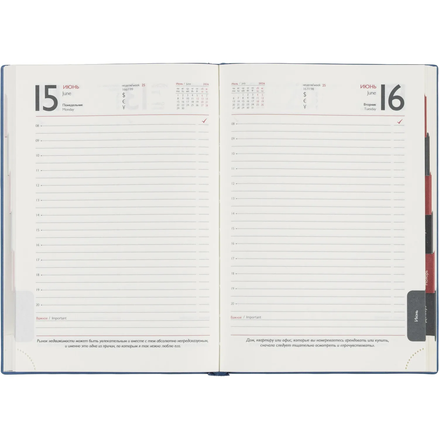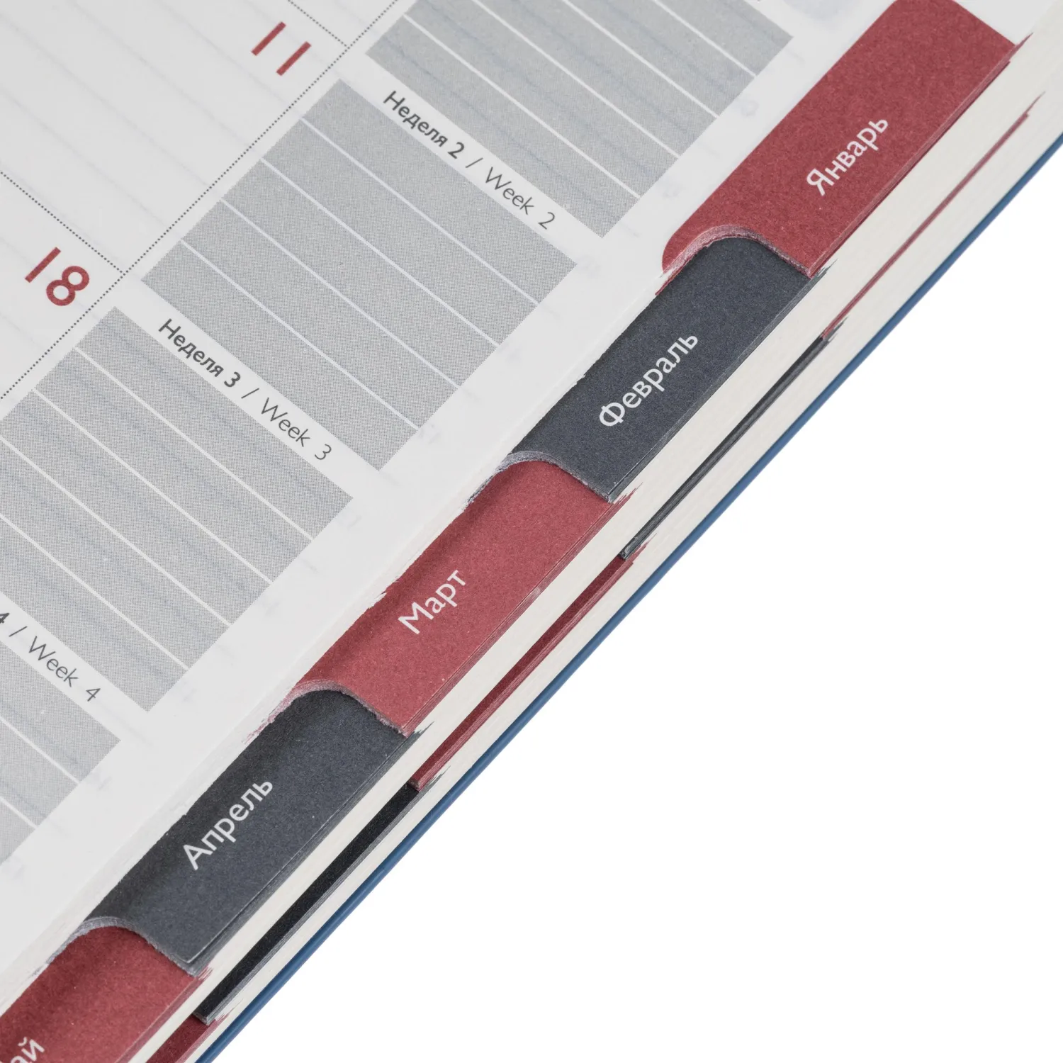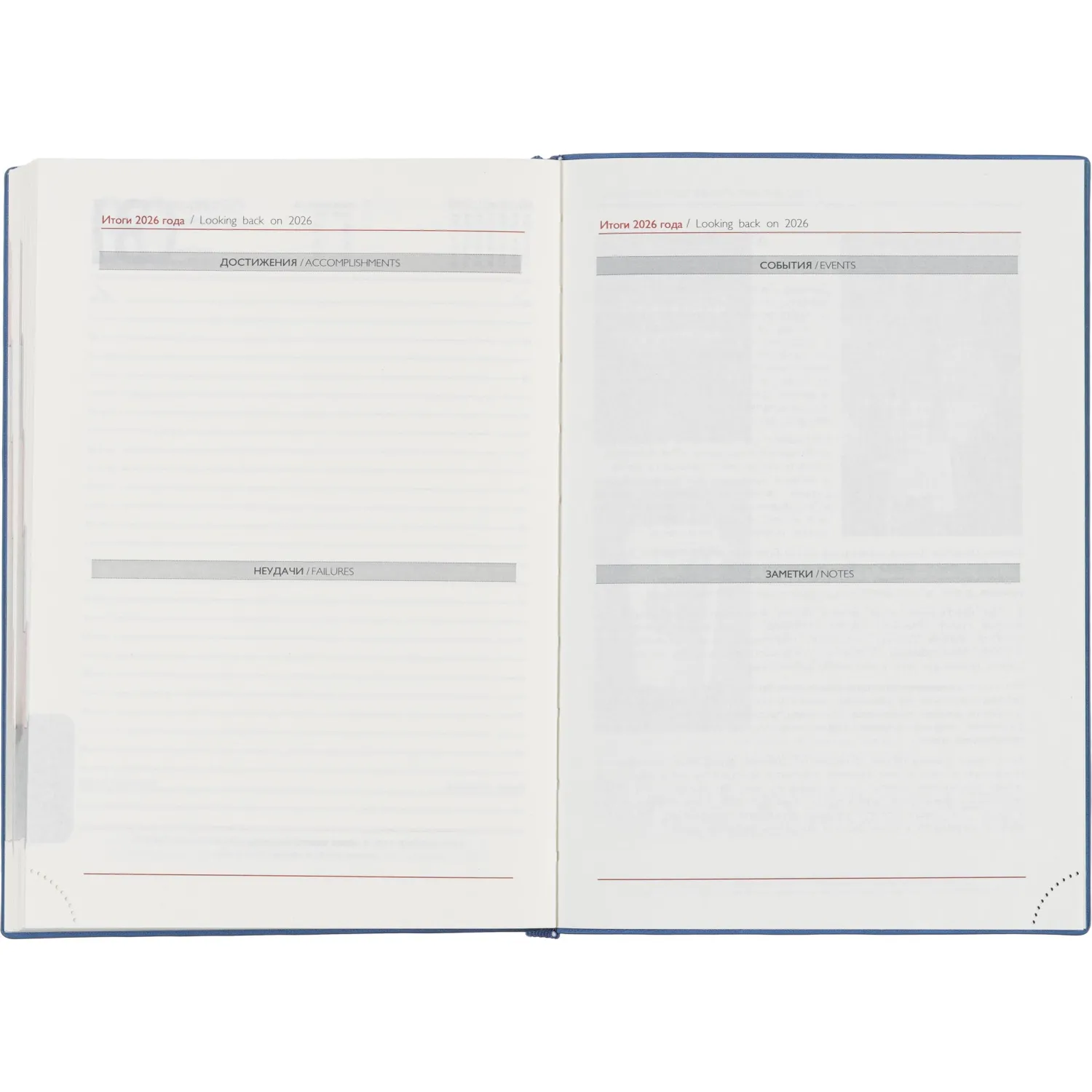 Обложка: мягкий переплёт, запаянный край, блинтовое тиснение, обстрочка по периметру — нет, скруглённый корешок, прямые углы обложки. Внутренний блок: ниткошвейный, кремовый офсет 70 г/кв.м, печать в две краски (линия), прямые углы блока, перфорация углов блока — есть, справочный материал — есть. Красочность форзаца: печать пантоном. Закладка: одно ляссе. Каптал: есть. Особенности: вырубка блока по месяцам, в блоке использованы мотивирующие высказывания экстраординарной личности, предпринимателя и миллиардера, титулованного «Провидца века», шоумена и телеведущего, бывшего владельца конкурса красоты «Мисс Вселенная» и дважды президента США — Дональда Трампа. Индивидуальная упаковка: промостикер + ПЭТ-пакет.