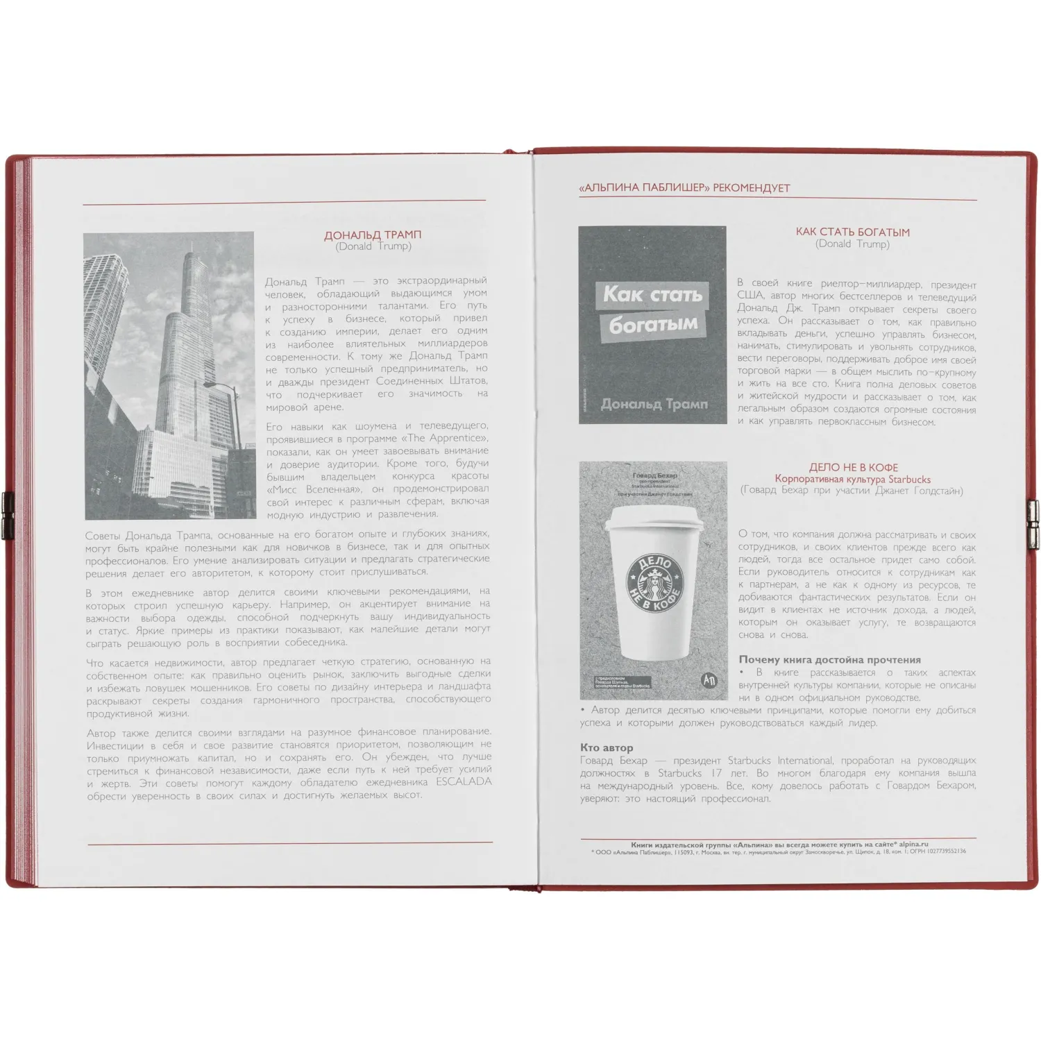 Обложка: мягкий переплёт, блинтовое тиснение, обстрочка по периметру — нет, скруглённый корешок, прямые углы обложки. Внутренний блок: ниткошвейный, белый офсет 70 г/кв.м, печать в две краски (линия), прямые углы блока, перфорация углов блока — нет, справочный материал — есть. Красочность форзаца: печать пантоном. Отделка среза: окрашивание пантоном. Закладка: одно ляссе. Каптал: есть. Особенности: в блоке использованы мотивирующие высказывания экстраординарной личности, предпринимателя и миллиардера, титулованного «Провидца века», шоумена и телеведущего, бывшего владельца конкурса красоты «Мисс Вселенная» и дважды президента США — Дональда Трампа, застёжка-резинка. Индивидуальная упаковка: промостикер + ПЭТ-пакет.