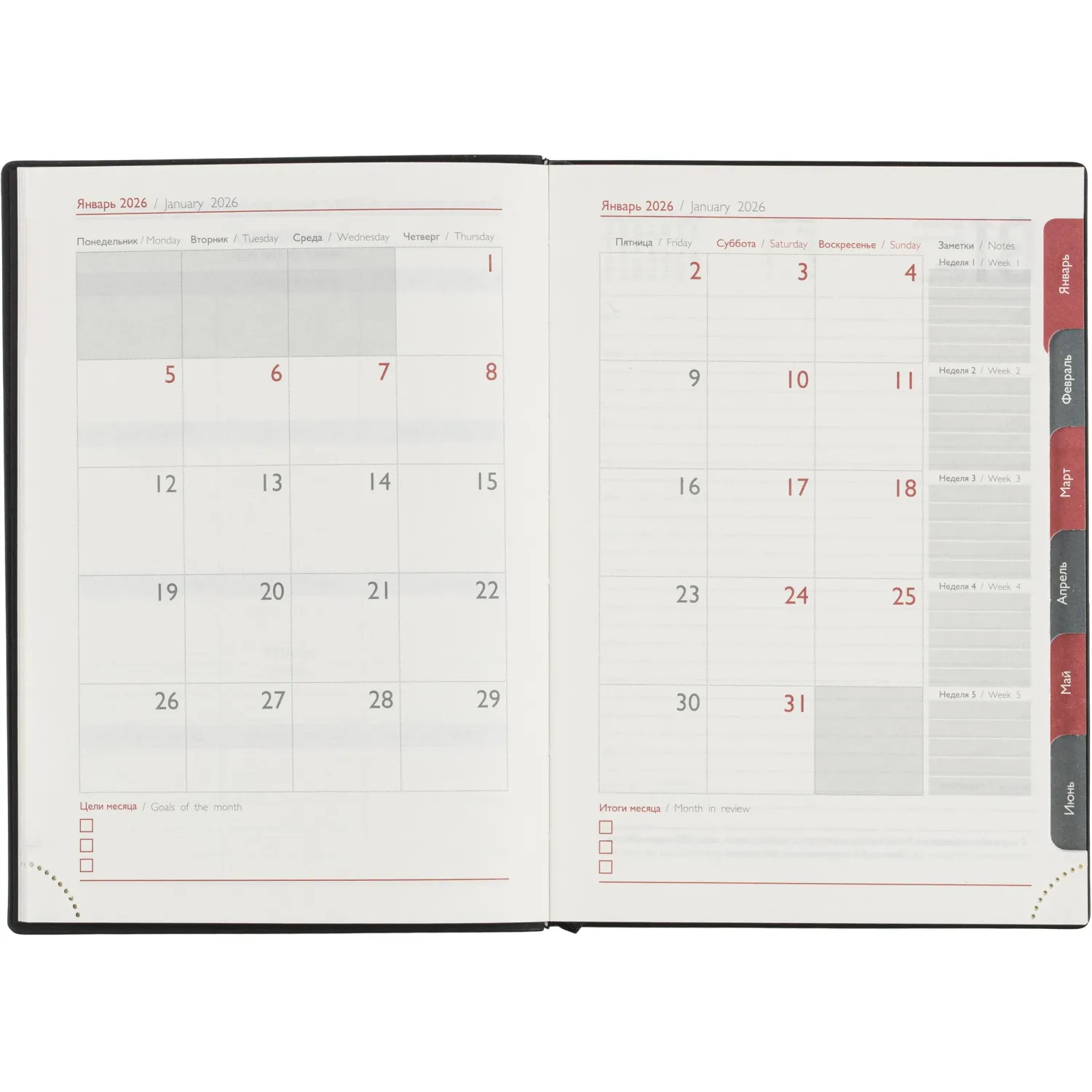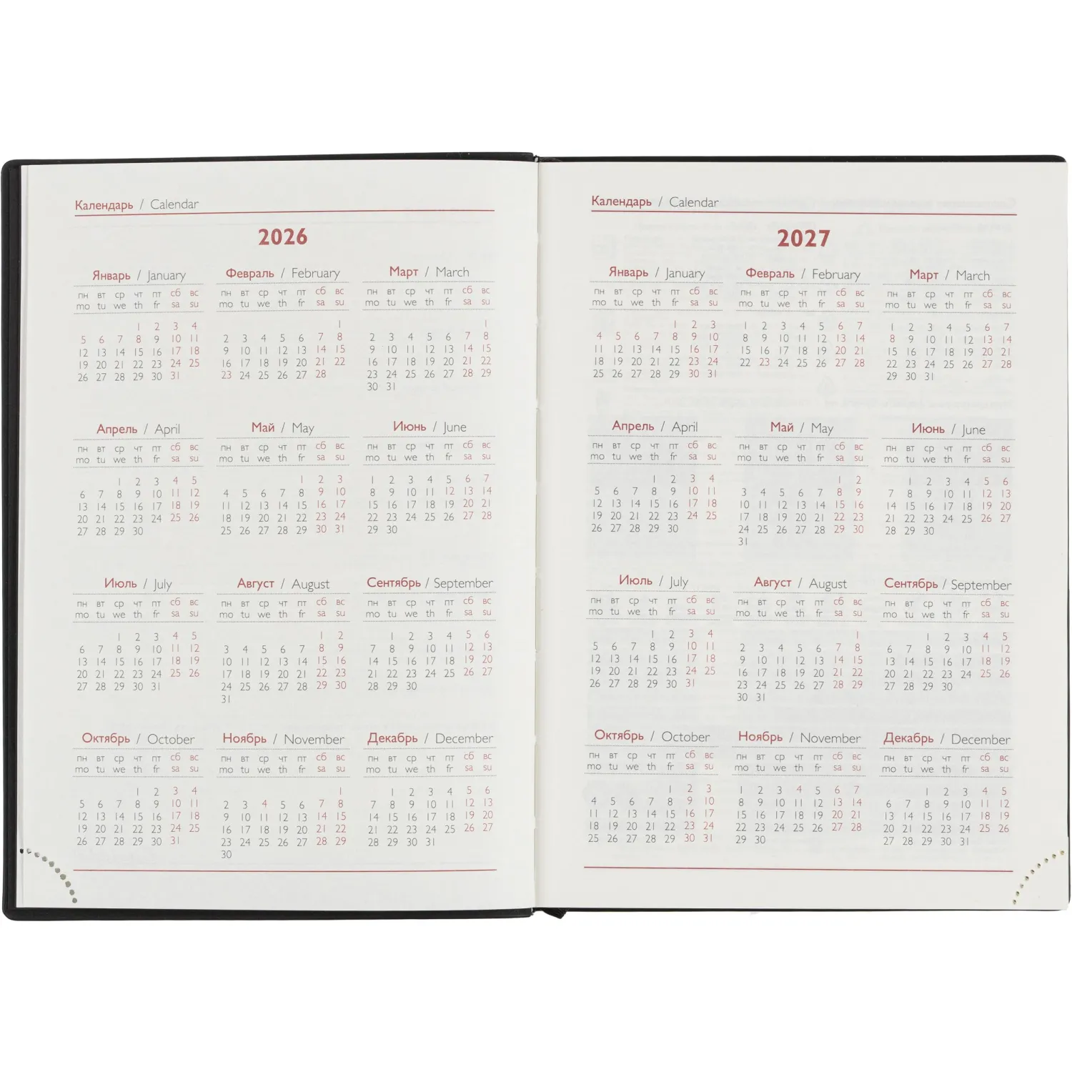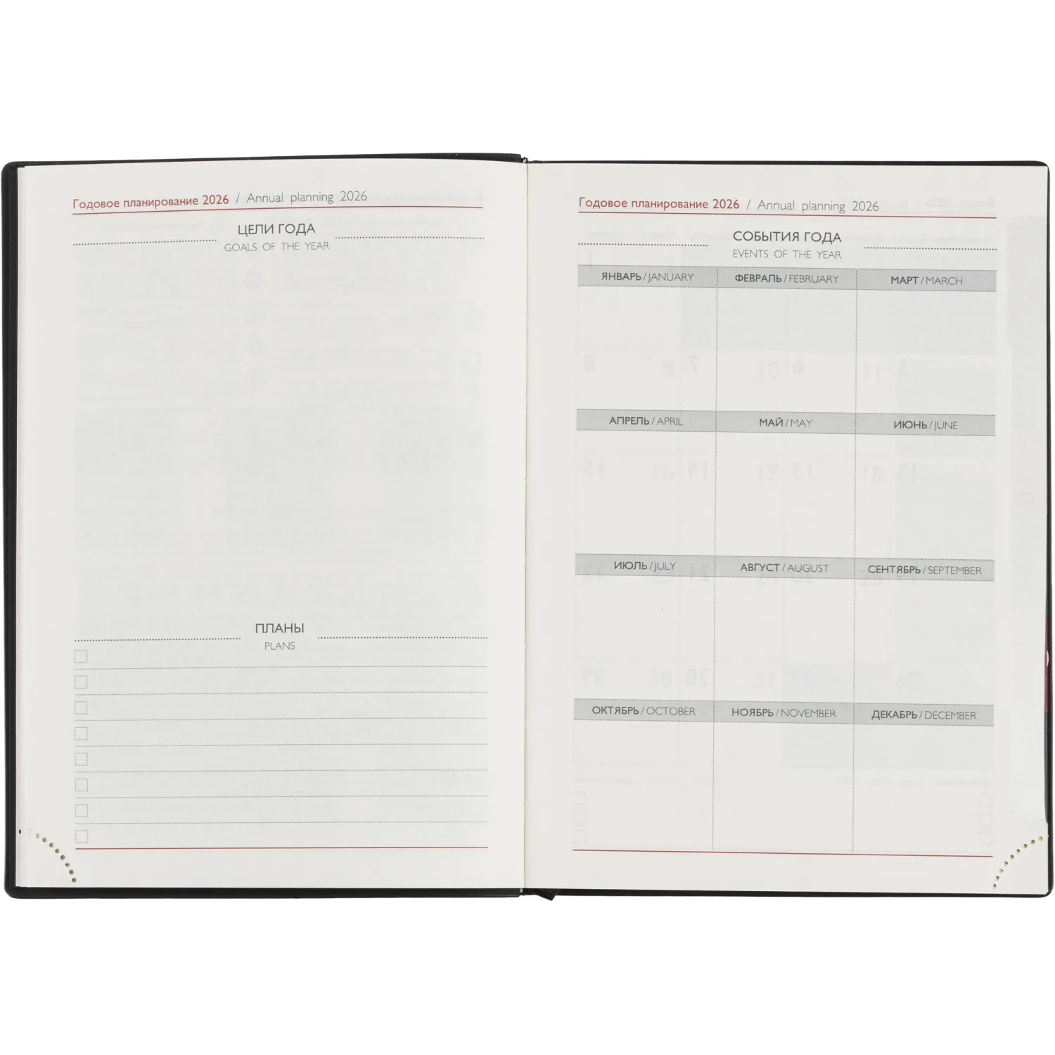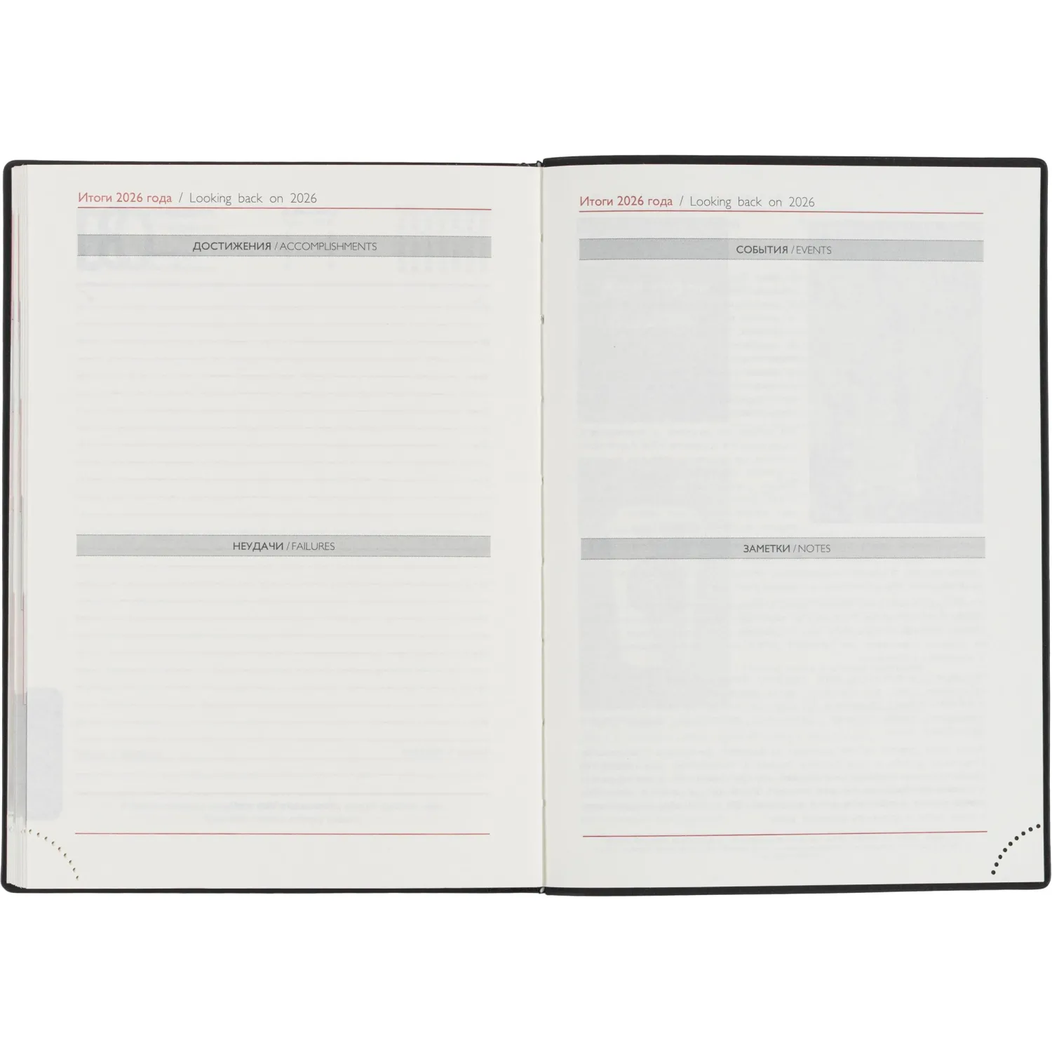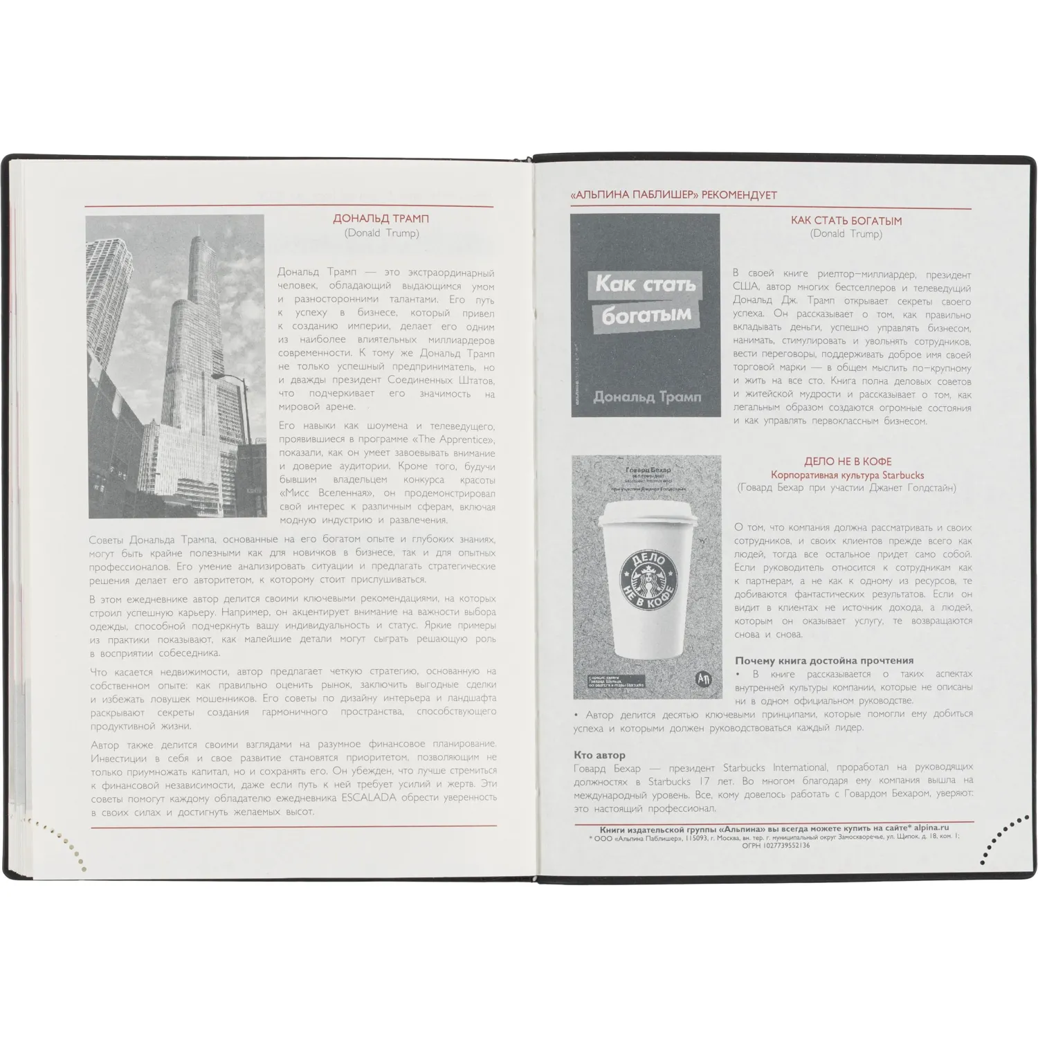 Обложка: мягкий переплёт, запаянный край, блинтовое тиснение, обстрочка по периметру — нет, скруглённый корешок, прямые углы обложки. Внутренний блок: ниткошвейный, кремовый офсет 70 г/кв.м, печать в две краски (линия), прямые углы блока, перфорация углов блока — есть, справочный материал — есть. Красочность форзаца: печать пантоном. Закладка: одно ляссе. Каптал: есть. Особенности: вырубка блока по месяцам, в блоке использованы мотивирующие высказывания экстраординарной личности, предпринимателя и миллиардера, титулованного «Провидца века», шоумена и телеведущего, бывшего владельца конкурса красоты «Мисс Вселенная» и дважды президента США — Дональда Трампа. Индивидуальная упаковка: промостикер + ПЭТ-пакет.