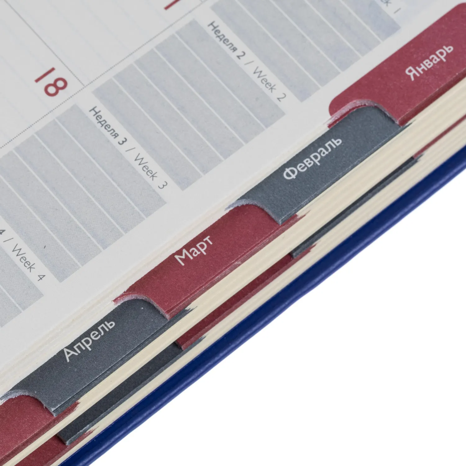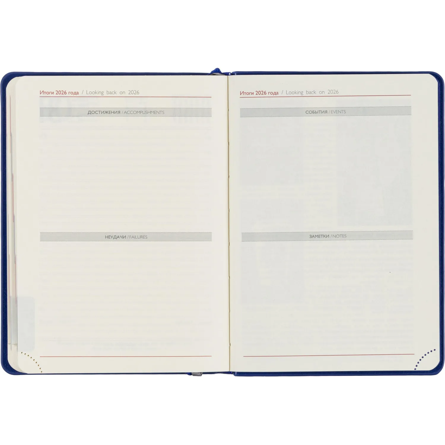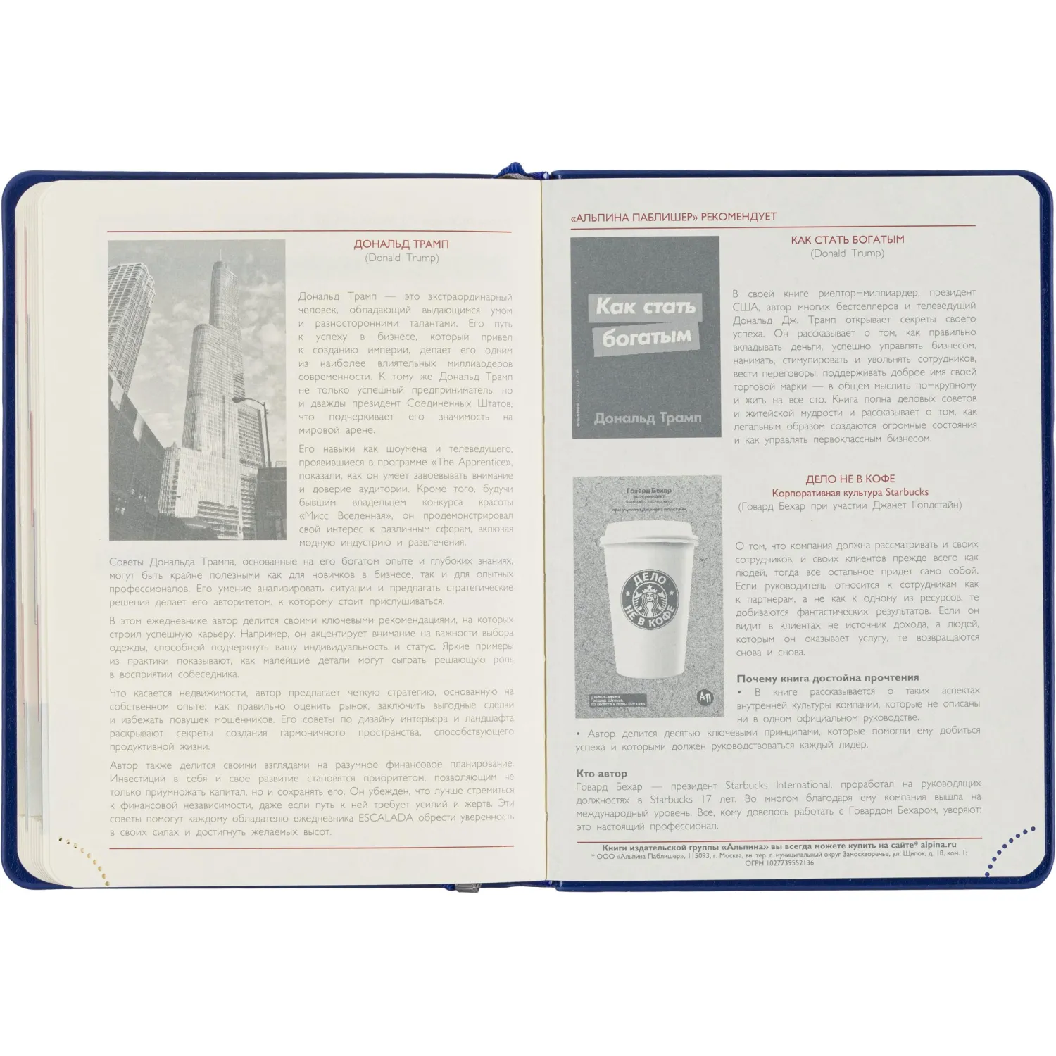 Обложка: твёрдый переплёт, запаянный край, блинтовое тиснение, обстрочка по периметру — нет, скруглённый корешок, закруглённые углы обложки. Внутренний блок: ниткошвейный, тонированный офсет 70 г/кв.м, печать в две краски (линия), закруглённые углы блока, перфорация углов блока — есть, справочный материал — есть. Красочность форзаца: печать пантоном. Закладка: два ляссе. Каптал: есть. Особенности: вырубка блока по месяцам, в блоке использованы мотивирующие высказывания экстраординарной личности, предпринимателя и миллиардера, титулованного «Провидца века», шоумена и телеведущего, бывшего владельца конкурса красоты «Мисс Вселенная» и дважды президента США — Дональда Трампа. Индивидуальная упаковка: промостикер + ПЭТ-пакет.