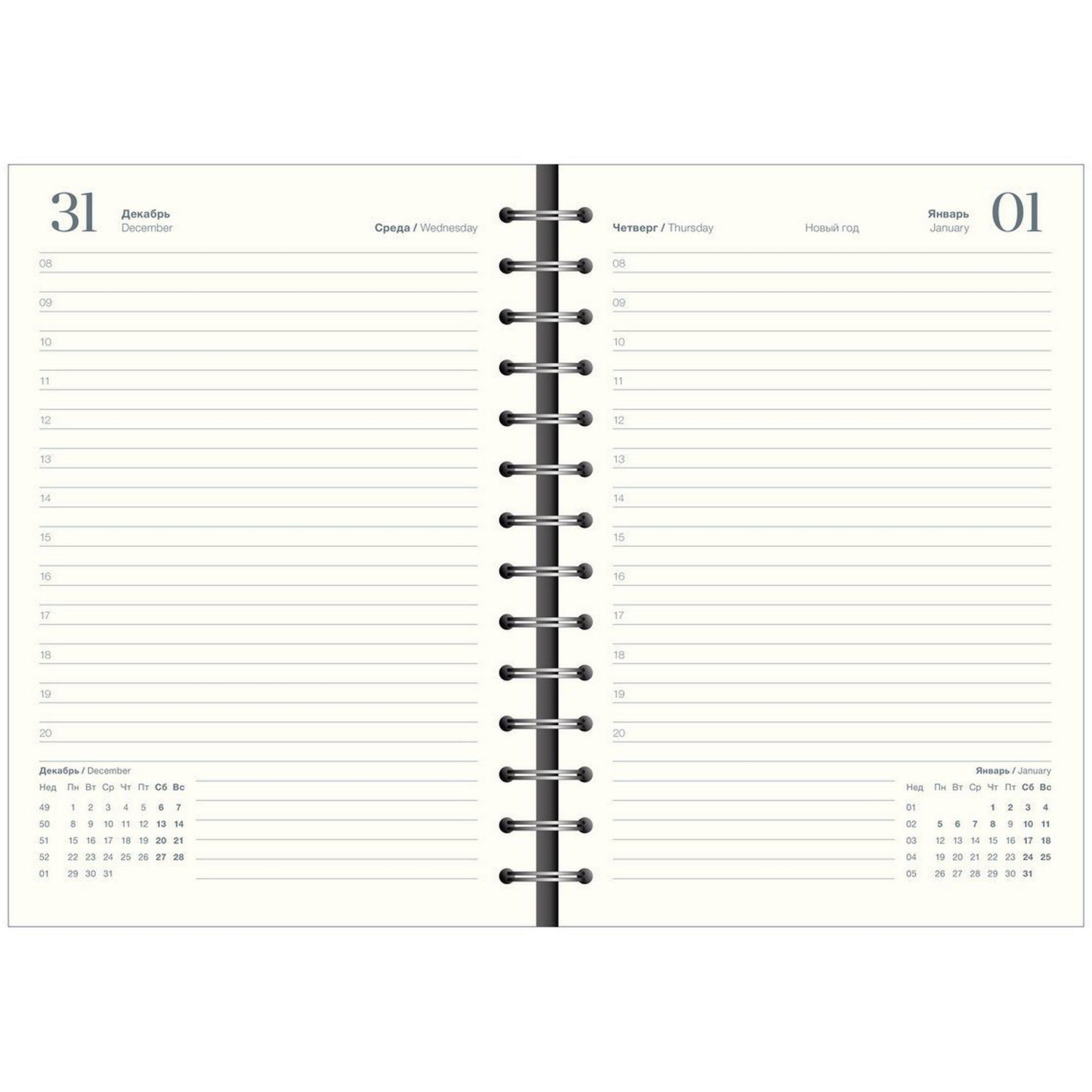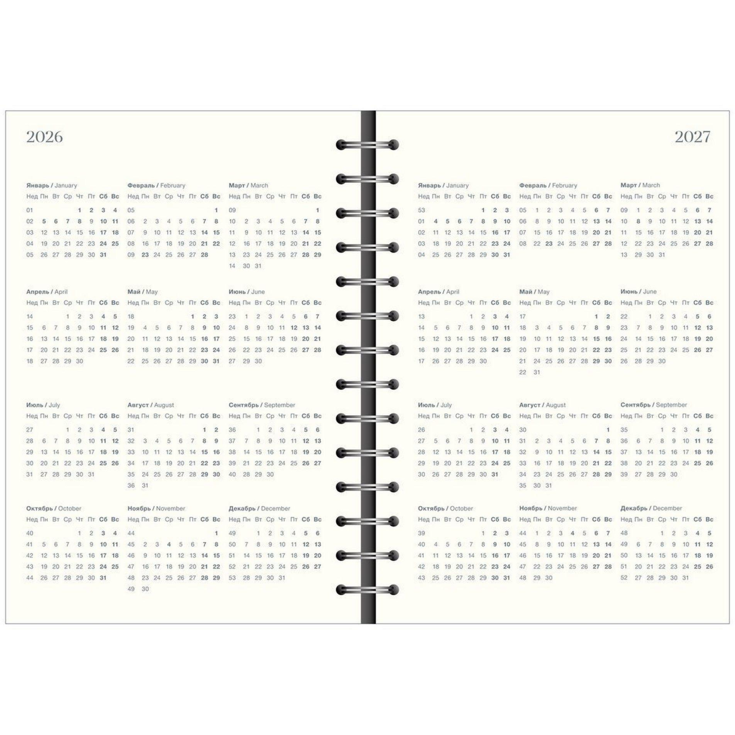 Датированный внутренний блок в линейку на 160 листов (320 страниц) — из высококачественной бумаги цвета слоновой кости плотностью 70 г/м2. Информационный блок ежедневника включает в себя: титульный лист, календари на 2026-2027 гг и развороты для заметок в начале и конце блока.