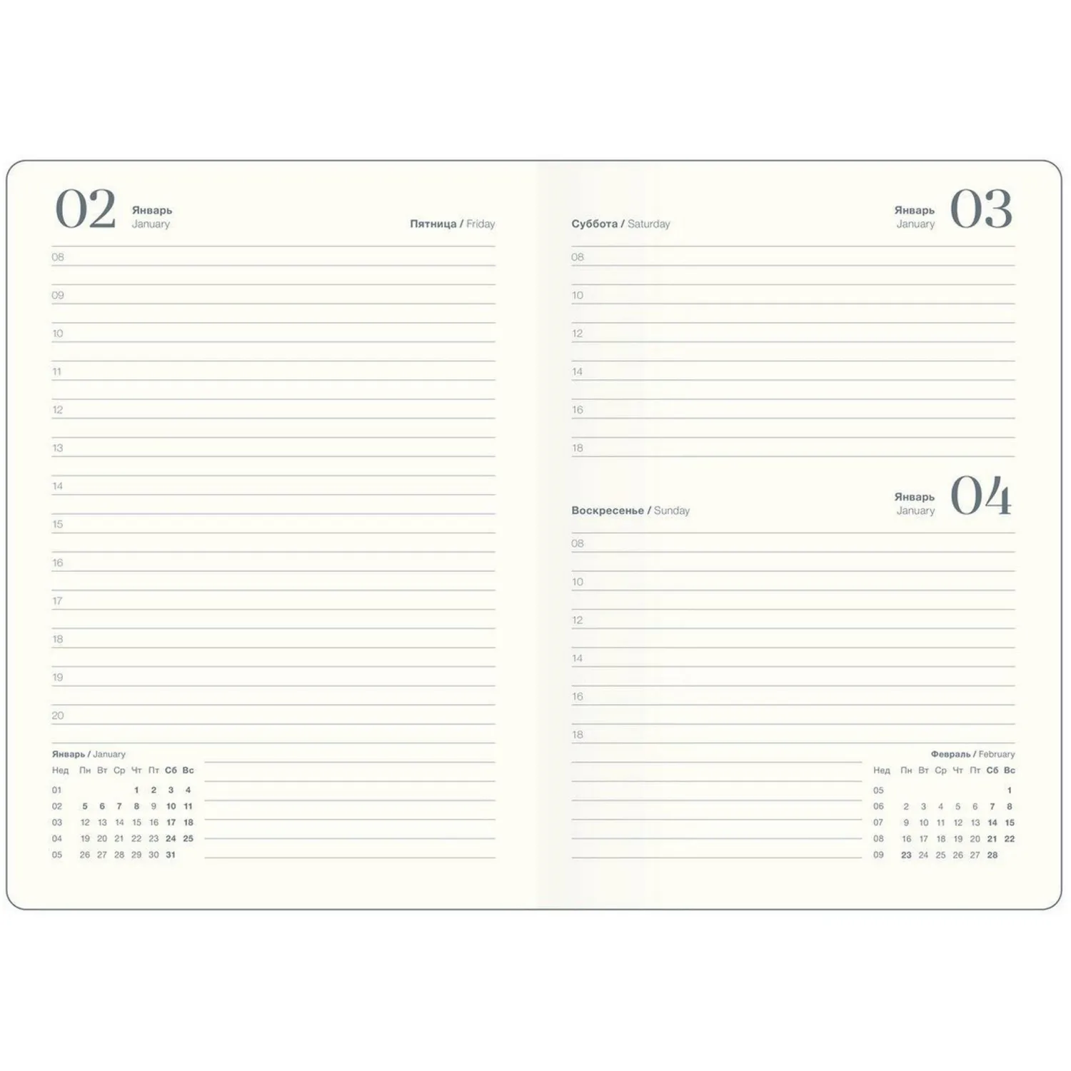 Датированный внутренний блок в линейку на 176 листов (352 страницы) — из высококачественной бумаги цвета слоновой кости плотностью 70 г/м2 и окрашенным обрезом. Информационный блок ежедневника включает в себя: титульный лист, календари на 2026-2027 гг, раздел «„планы на год“», развороты для заметок в начале и конце блока, планнер перед каждым месяцем.