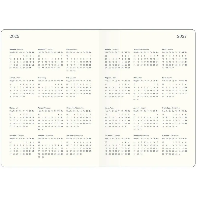 Датированный внутренний блок в линейку на 176 листов (352 страницы) — из высококачественной бумаги цвета слоновой кости плотностью 70 г/м2 с окрашенным в золото обрезом. Информационный блок ежедневника включает в себя: титульный лист, календари на 2026-2027 гг, раздел «„планы на год“», развороты для заметок в начале и конце блока, планнер перед каждым месяцем.
