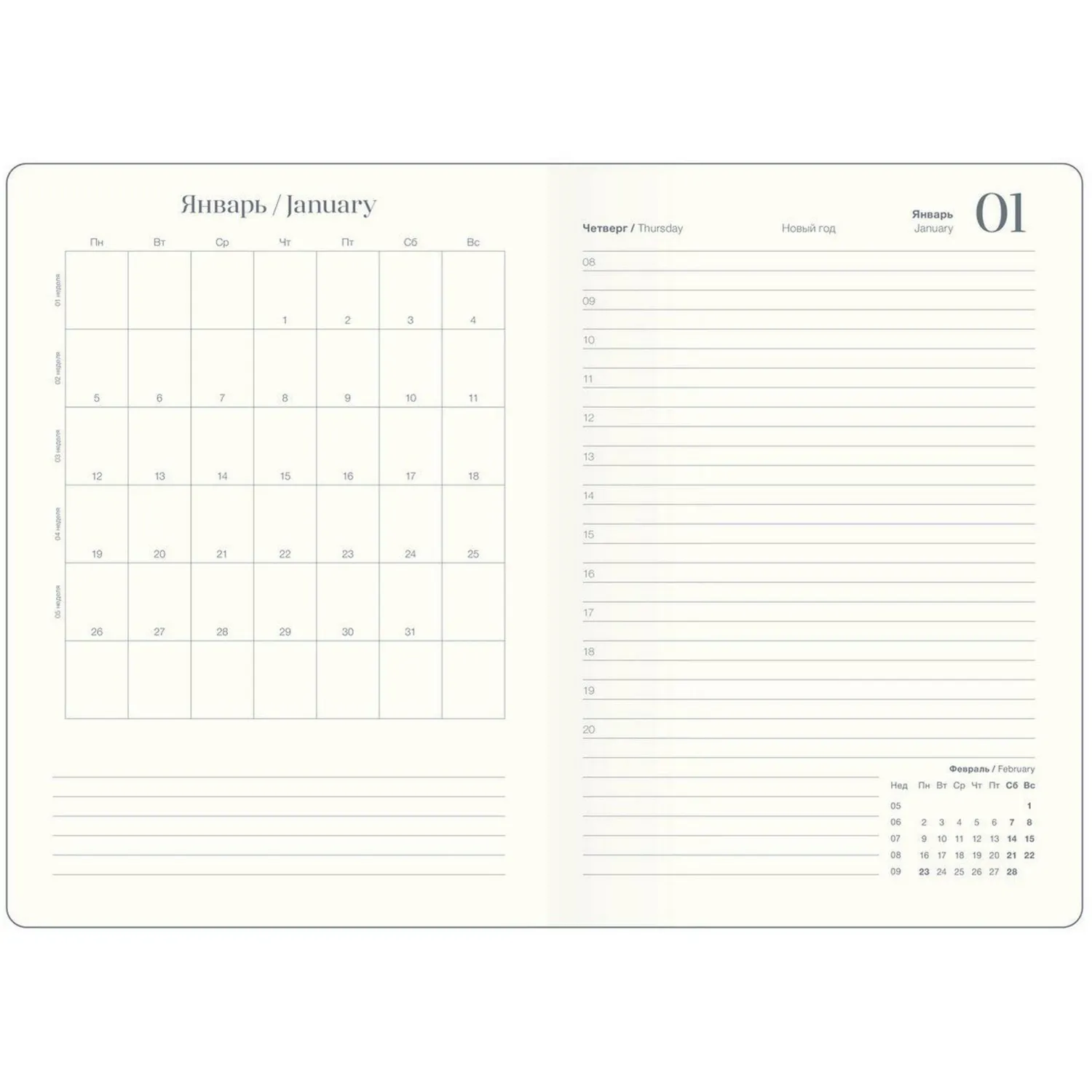 Датированный внутренний блок в линейку на 176 листов (352 страницы) — из высококачественной бумаги цвета слоновой кости плотностью 70 г/м2 с окрашенным в золото обрезом. Информационный блок ежедневника включает в себя: титульный лист, календари на 2026-2027 гг, раздел «„планы на год“», развороты для заметок в начале и конце блока, планнер перед каждым месяцем.