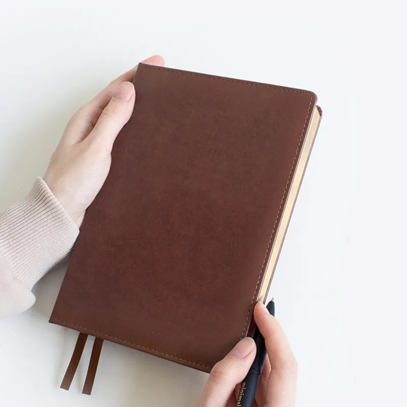 Твёрдая с поролоном обложка из гладкой натуральной рециклированной кожи с прострочкой по периметру имеет удобный кармашек для мелочей на нахзаце и скруглённые уголки, которые не позволят порвать подкладку сумки. Благодаря крепкому ниткошвейному скреплению ежедневник верно прослужит весь год.