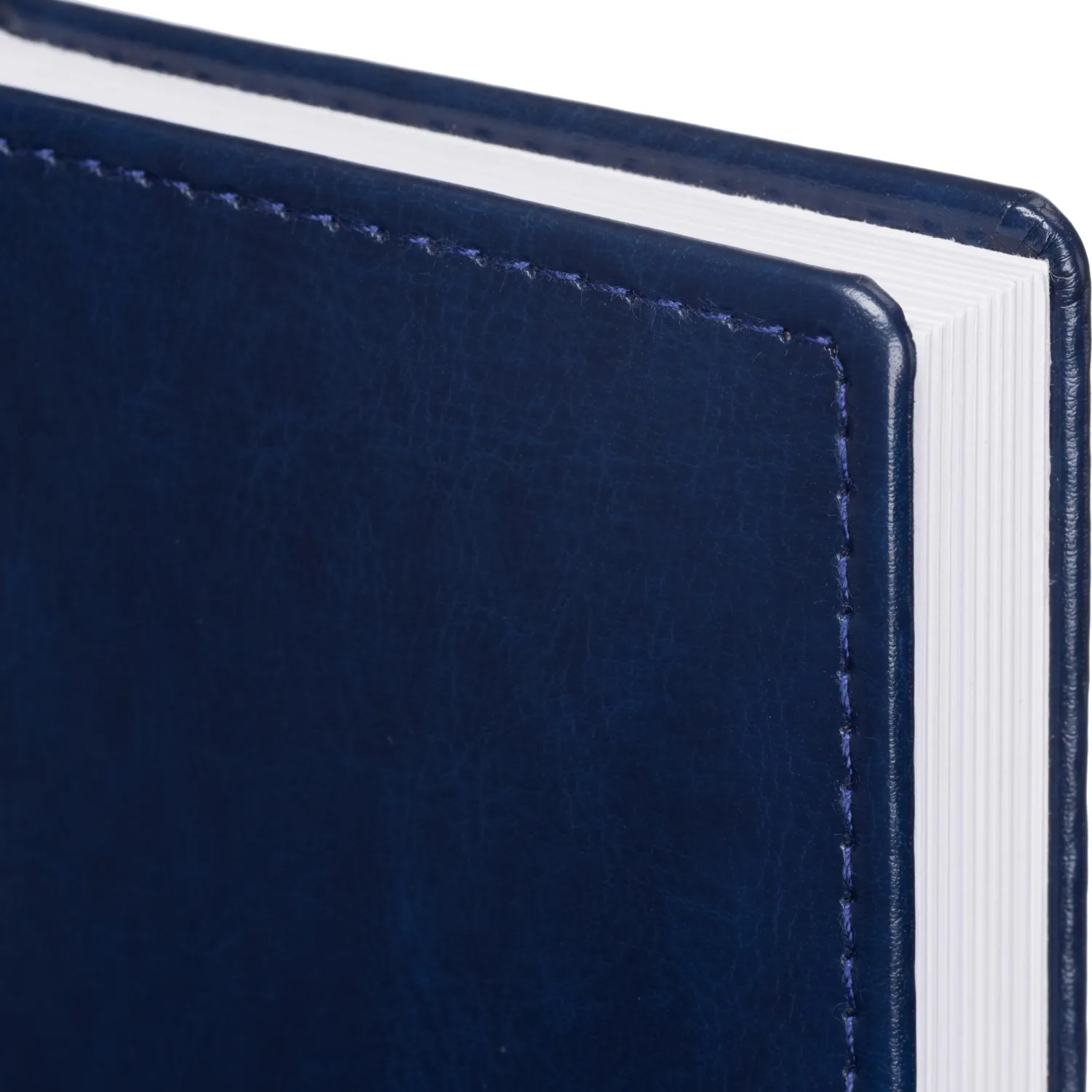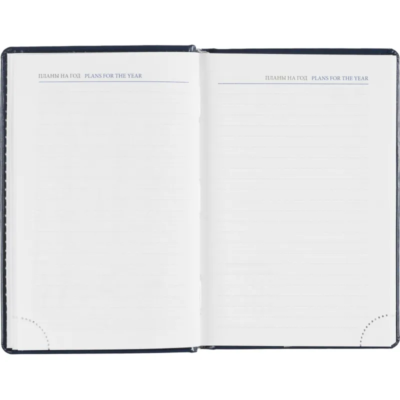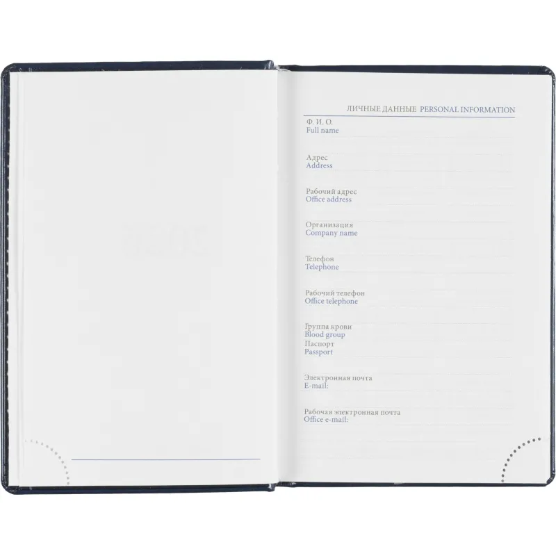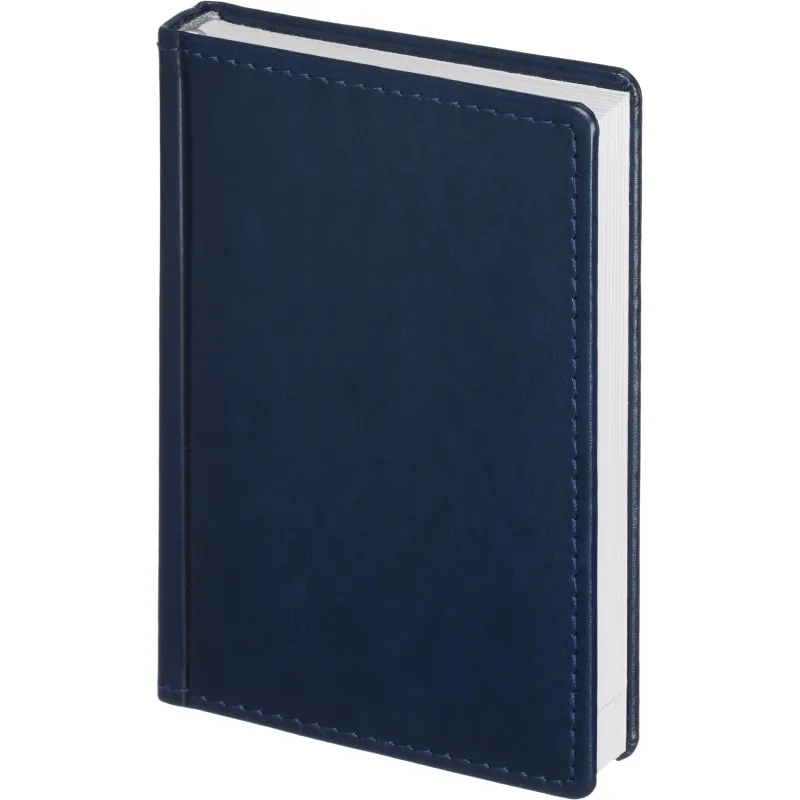 Данный ежедневник имеет формат A6, содержит 168 листов. Твёрдая обложка с поролоном, выполненная из высококачественной искуственной кожи синего цвета, придает изделию элегантный и профессиональный вид. Страницы выполнены из белой офсетной бумаги плотностью 70 г/кв.м. Дизайн обложки: универсальный.