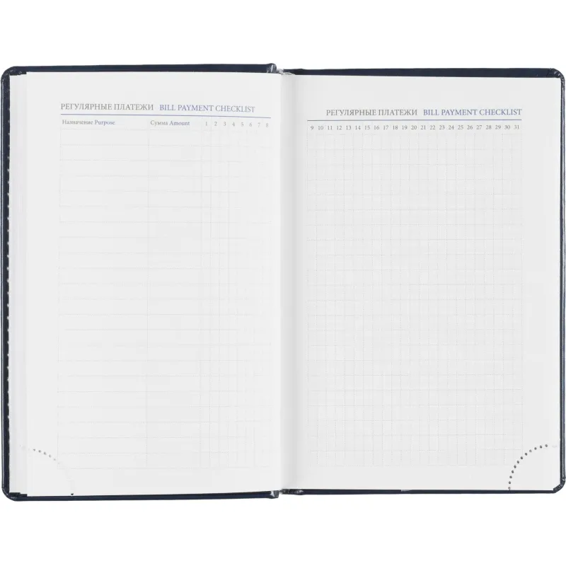 Ежедневник содержит информационно-справочный блок, включая личные данные, праздники, дни рождения и полезные сервисы. Блок также оснащен местами для записи регулярных платежей, важных телефонов и различных измерений. Перфорация уголка упрощает использование и добавляет удобства.