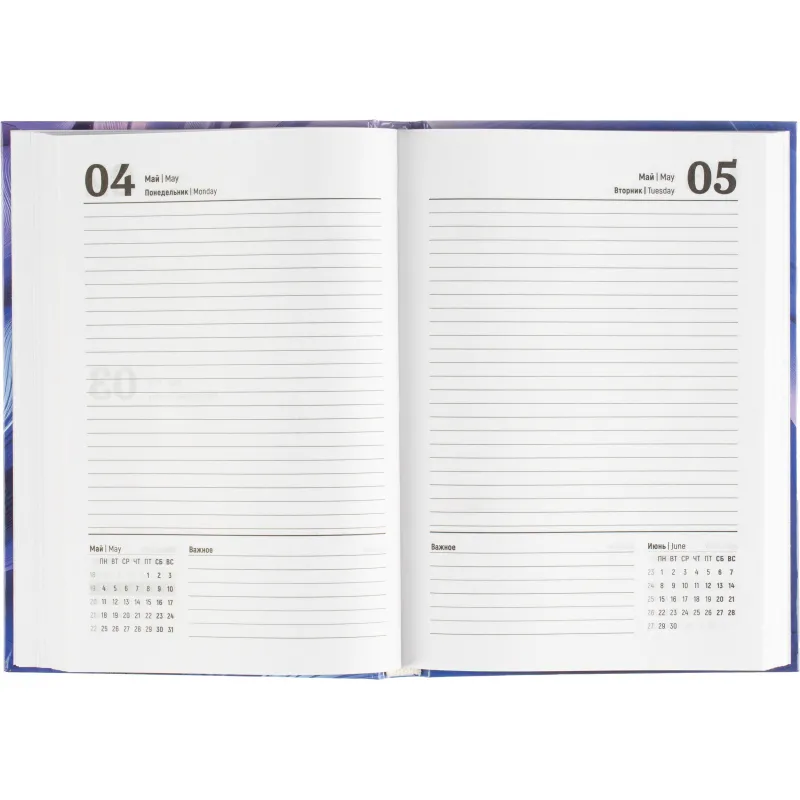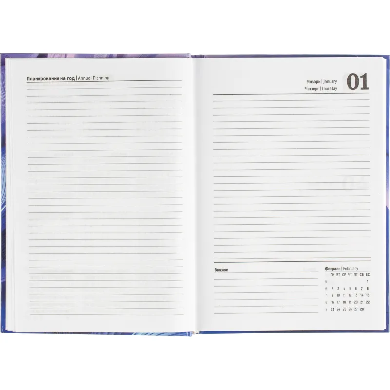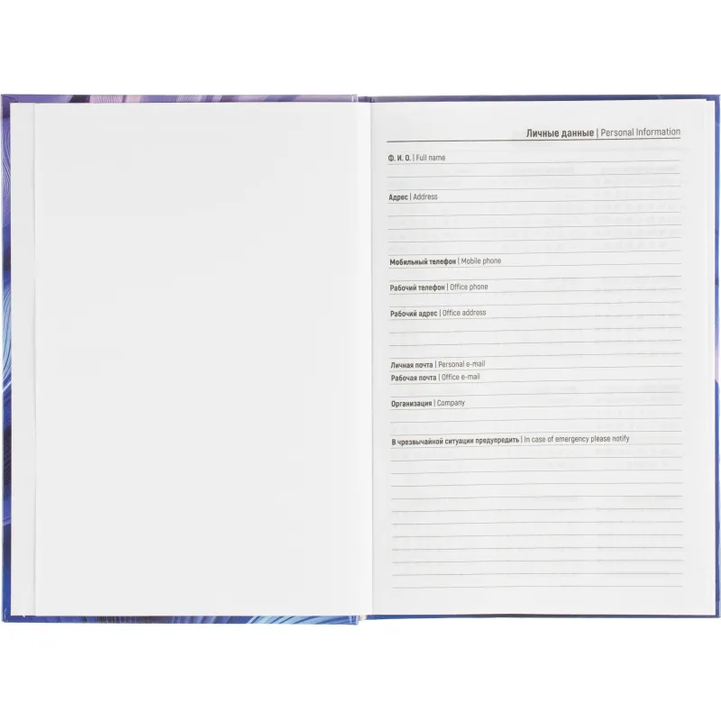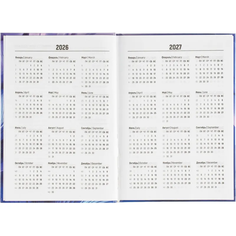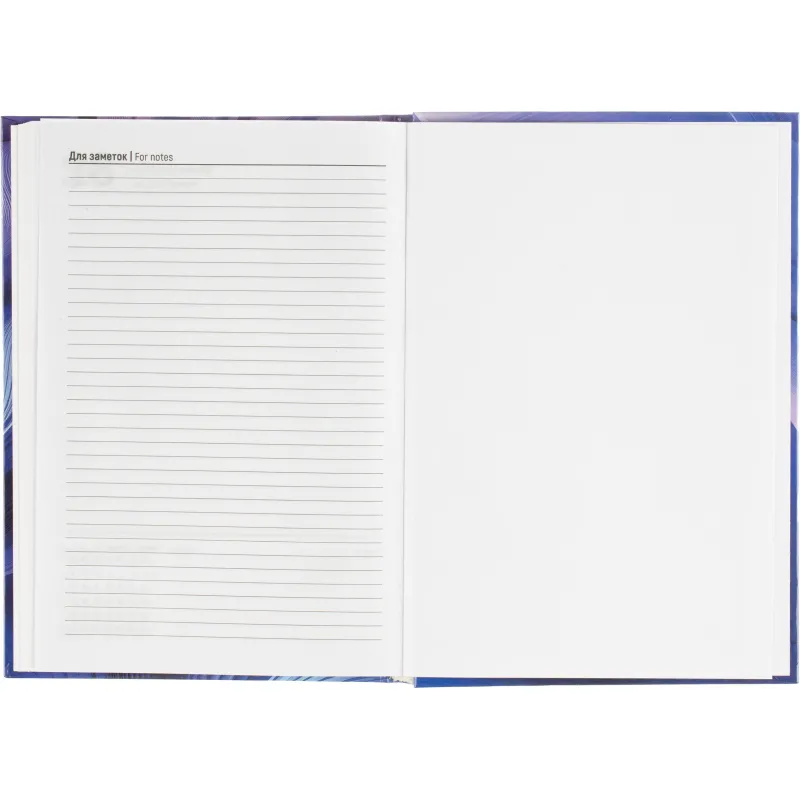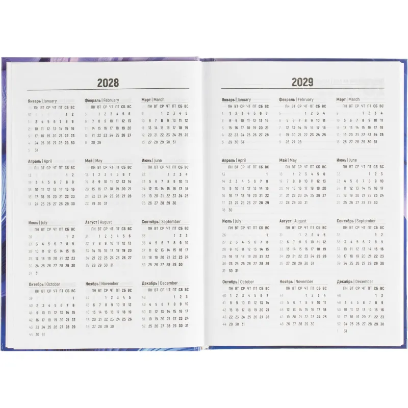 Блок: датированный на 2026 год, 160 листов (320 страниц), бумага белый офсет, плотностью 55 г/кв.м, печать в блоке в 1 краску. Цвет обреза белый. Содержит информационно-справочный блок — личные данные, календарь на 2026-2029 год, рассчитан на заполнение в течение одного года. Нет петли для ручки. Удобен для записи переговоров, встреч.