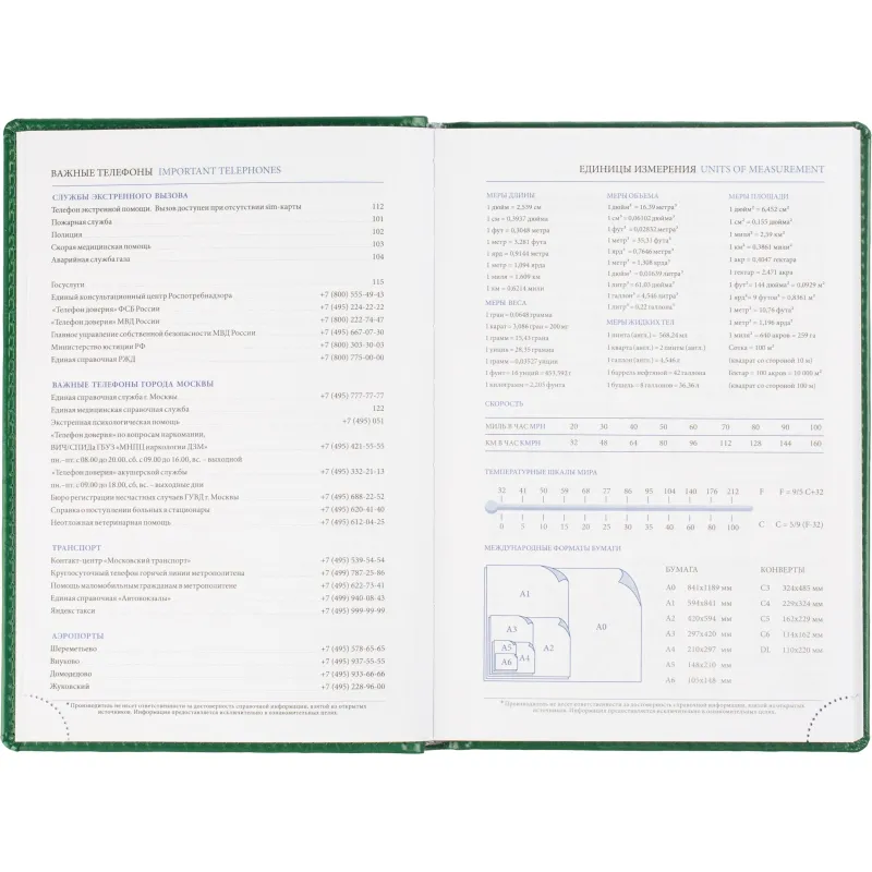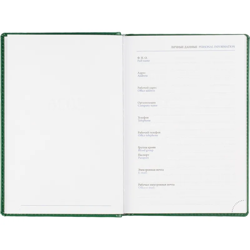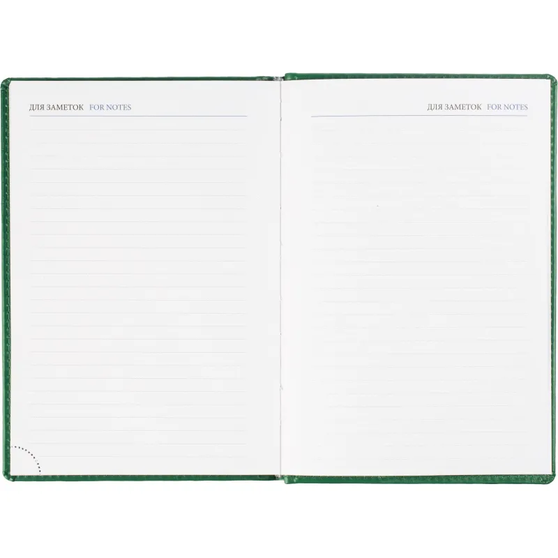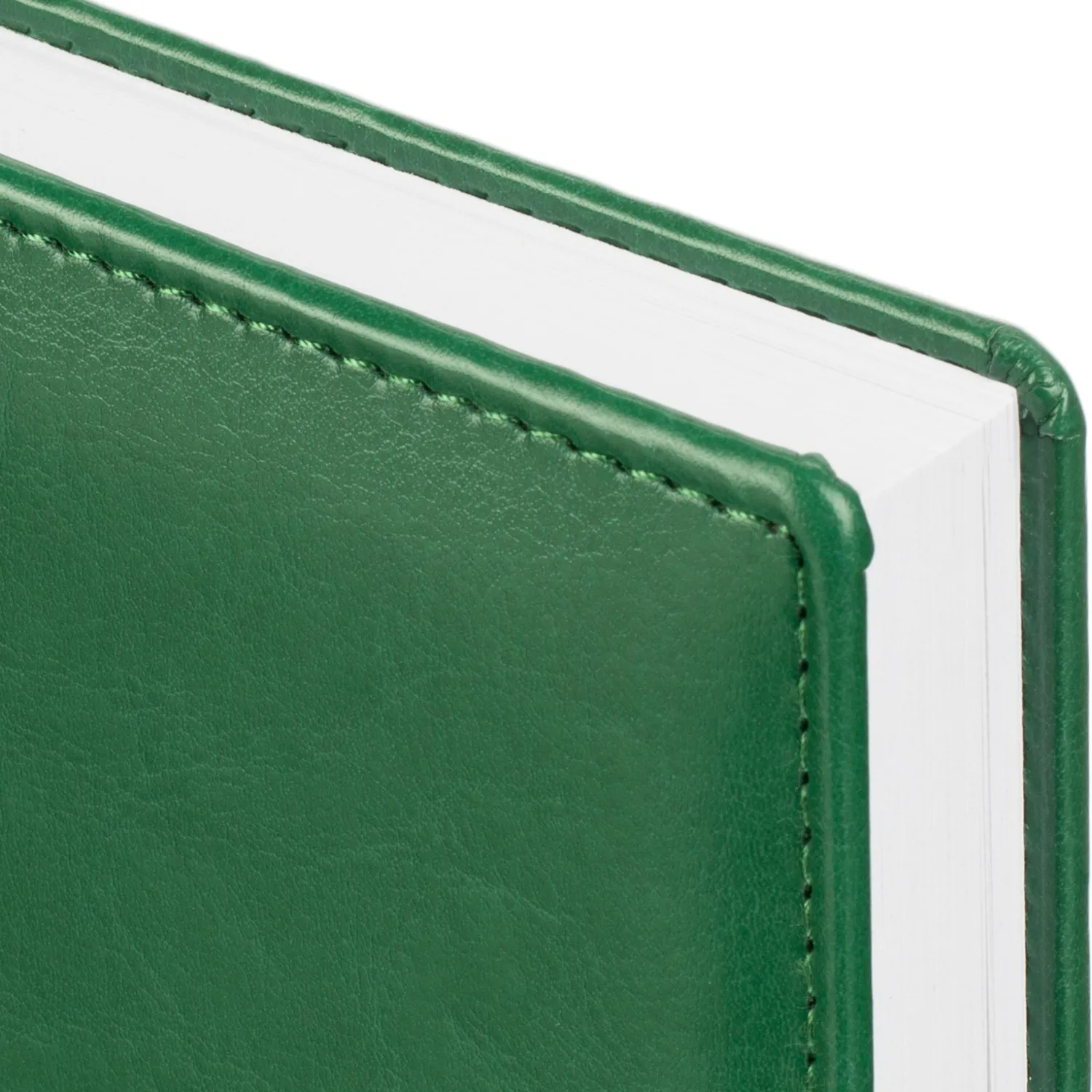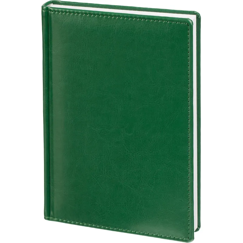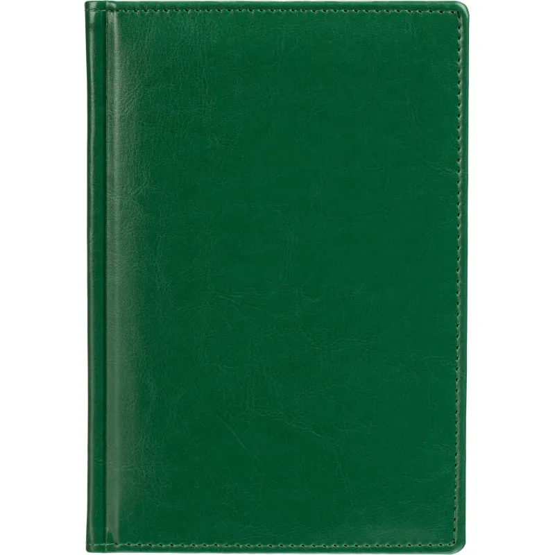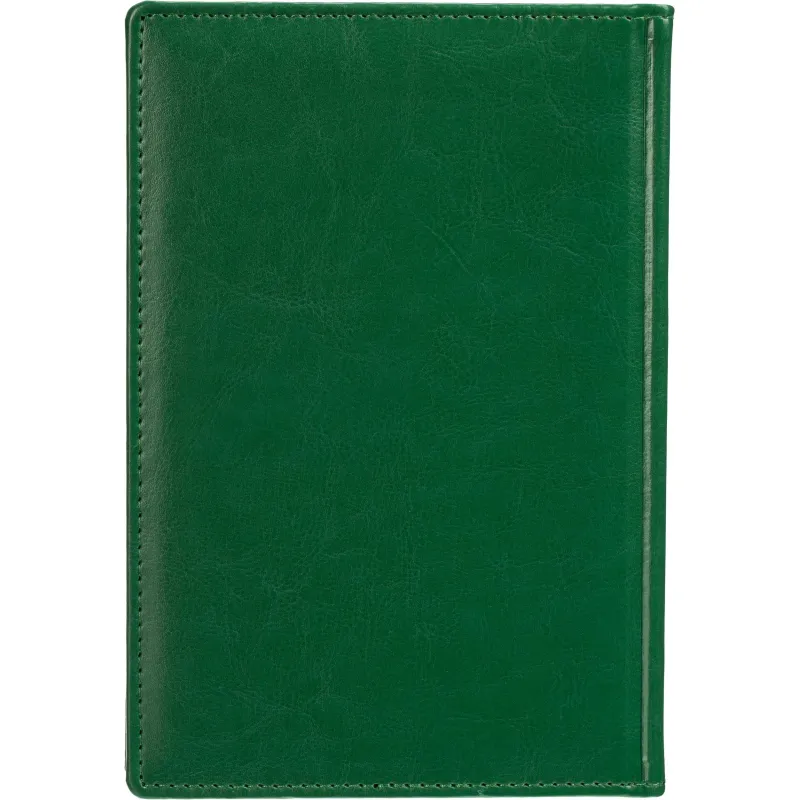 Данный ежедневник имеет формат A5, содержит 176 листов. Твёрдая обложка с поролоном, выполненная из высококачественной искуственной кожи зелёного цвета, придает изделию элегантный и профессиональный вид. Страницы выполнены из белой офсетной бумаги плотностью 70 г/кв.м. Дизайн обложки: универсальный.
