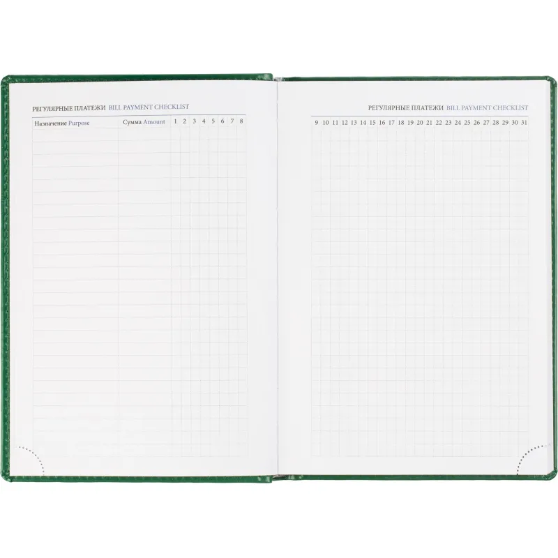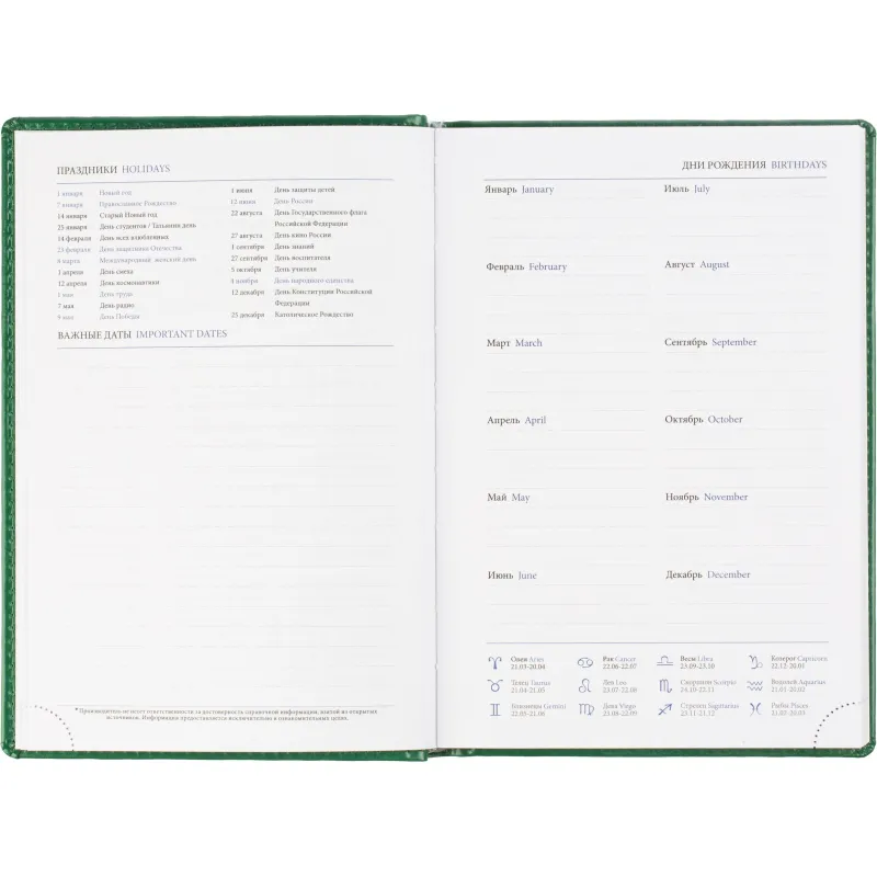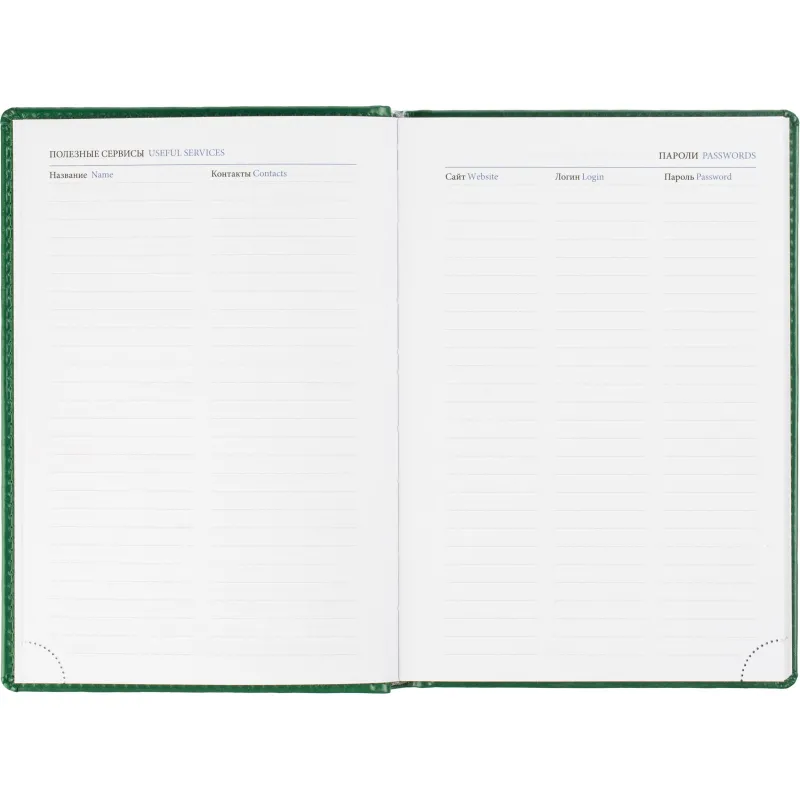 Ежедневник содержит информационно-справочный блок, включая личные данные, праздники, дни рождения и полезные сервисы. Блок также оснащен местами для записи регулярных платежей, важных телефонов и различных измерений. Перфорация уголка упрощает использование и добавляет удобства.